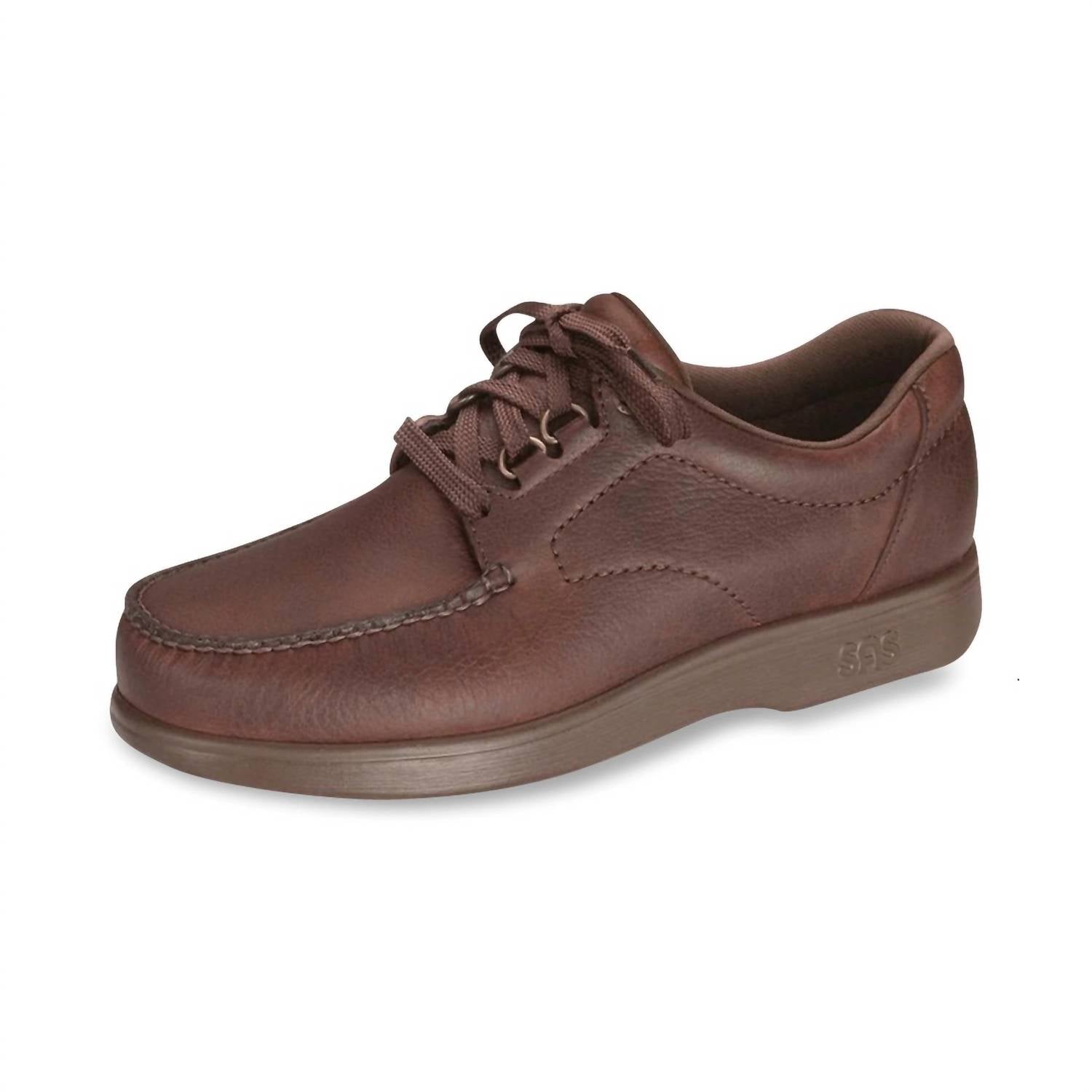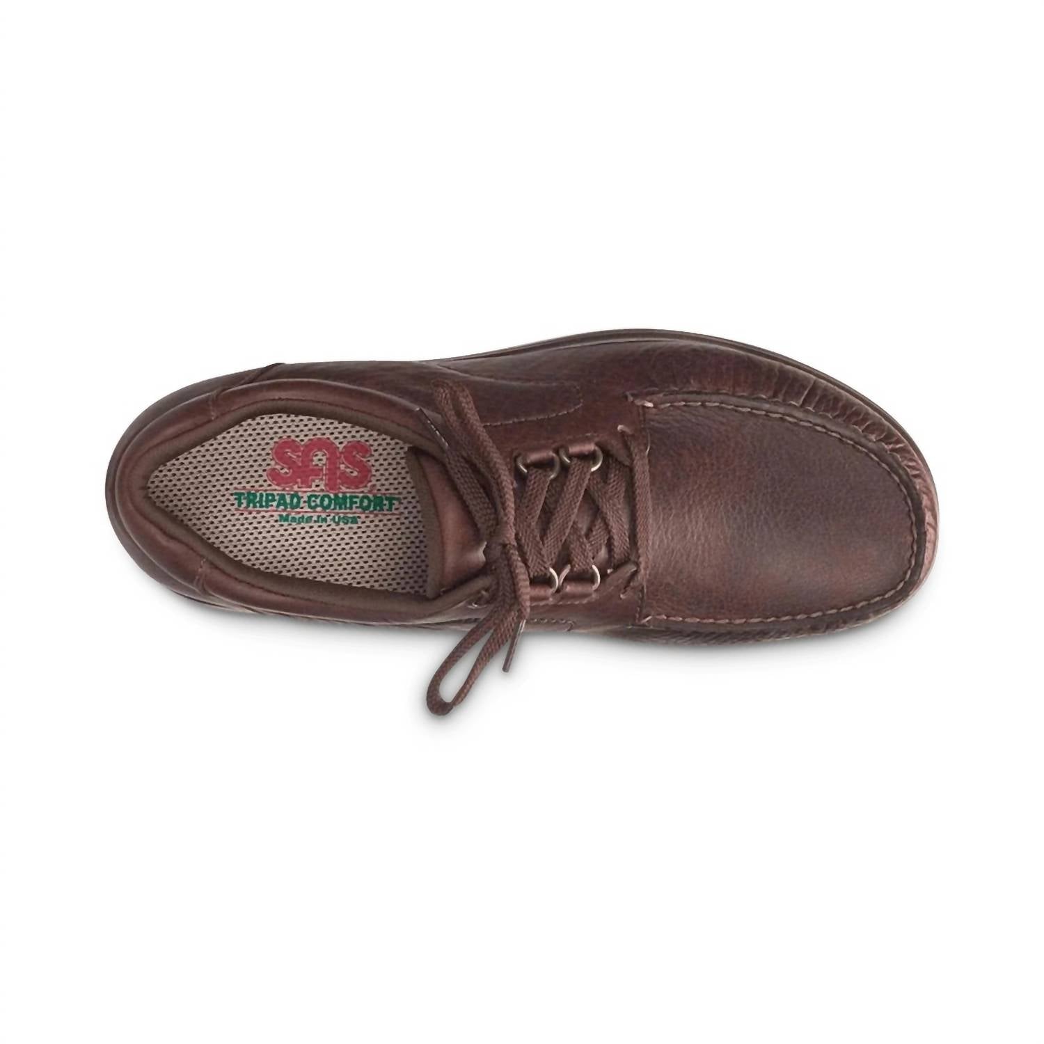 Introducing the Men's Bout Time Lace Up Shoes by SAS, a perfect blend of comfort and style crafted from sleek, premium leather in a trendy mulch shade. Engineered with a user-friendly EZ Lace™ System for easy adjustment, these oxfords feature the TRIPAD® Technology that provides shock absorption and support. The shoe is Medicare Approved and designed with the removable CoolSTEP™ footbed for a dry, comfortable, and healthy foot environment, enhanced by its antibacterial and antifungal properties. The 1.25" flat heel and round toe shape ensure all-day comfort and classic elegance.