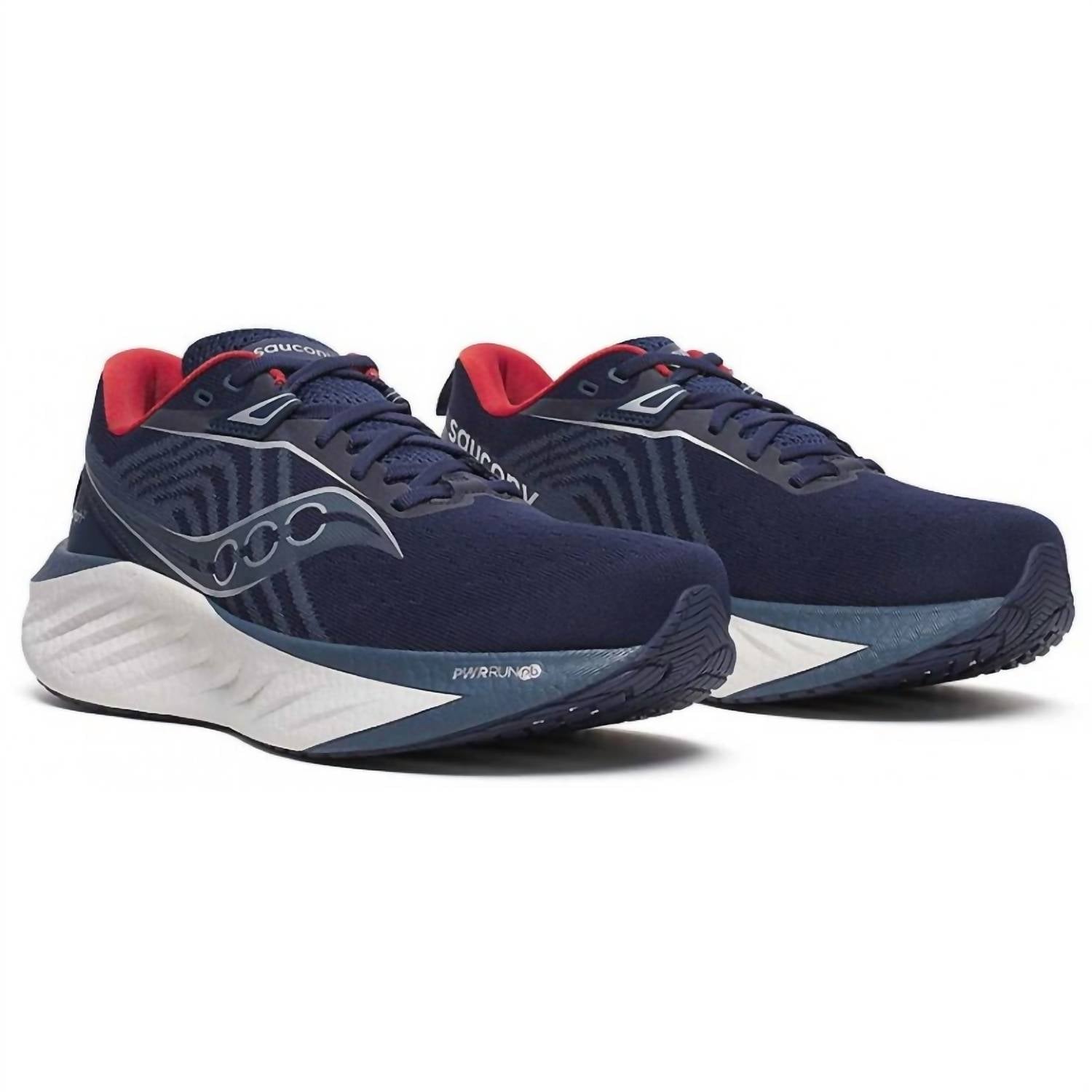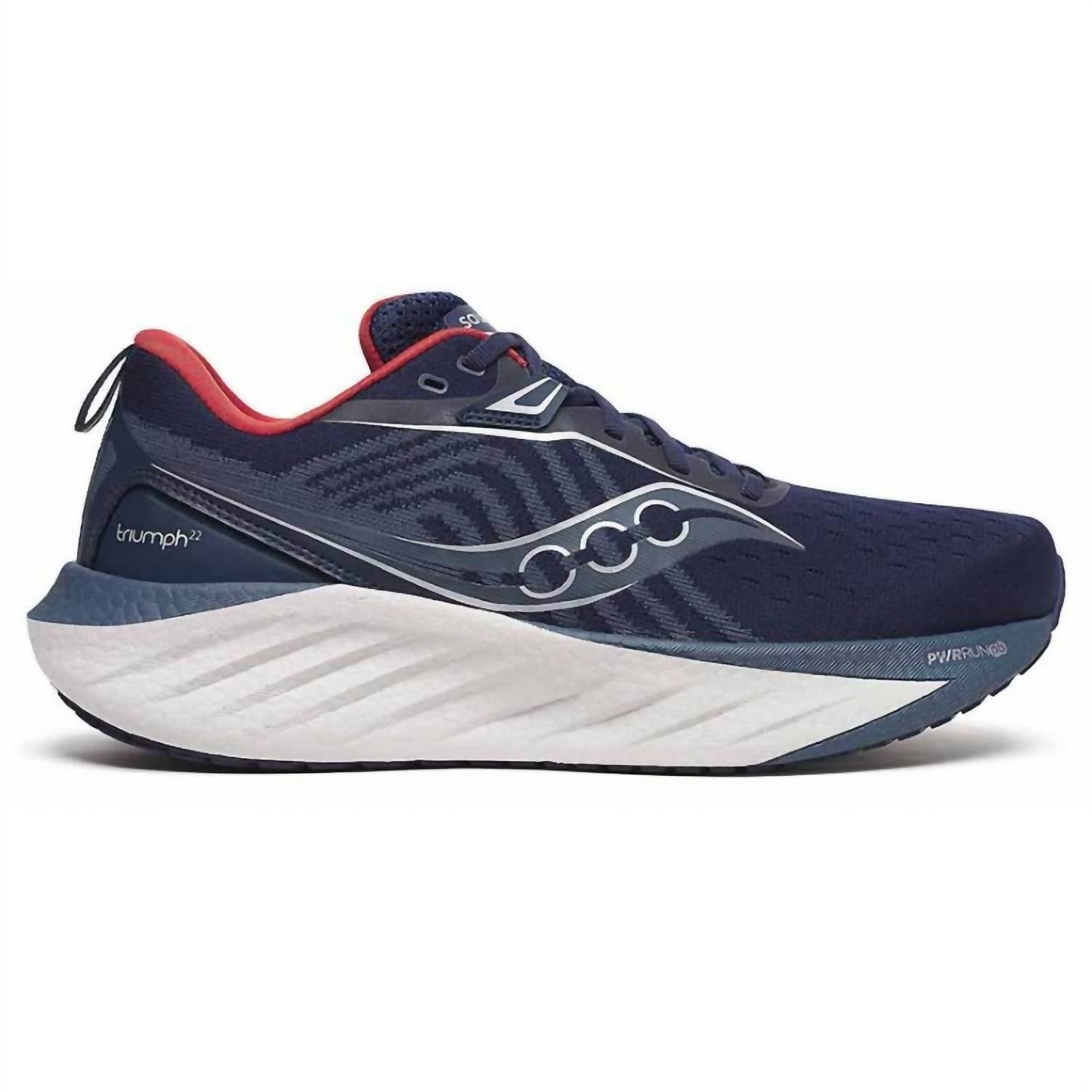 Introducing the Men's Triumph 22 Running Shoes by SAUCONY, crafted in a stylish Navy/Dusk Marine colorway perfect for the summer season. These athletic shoes feature a round toe and a flat heel design, with a heel height of 1" and under, making them ideal for fitness activities and workout sessions. Embrace the athleisure trend with these versatile shoes tailored for men and designed to support you in every stride.
