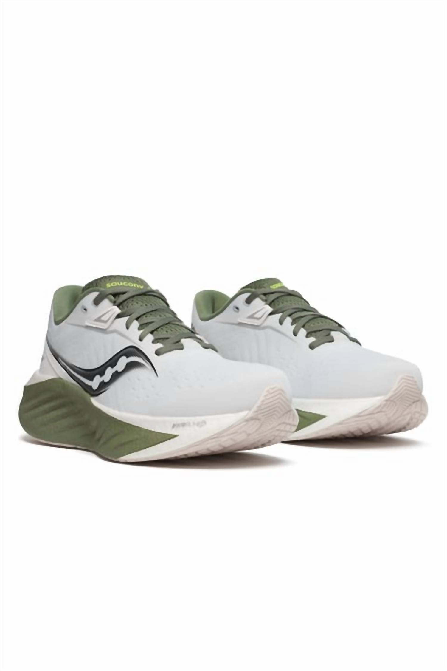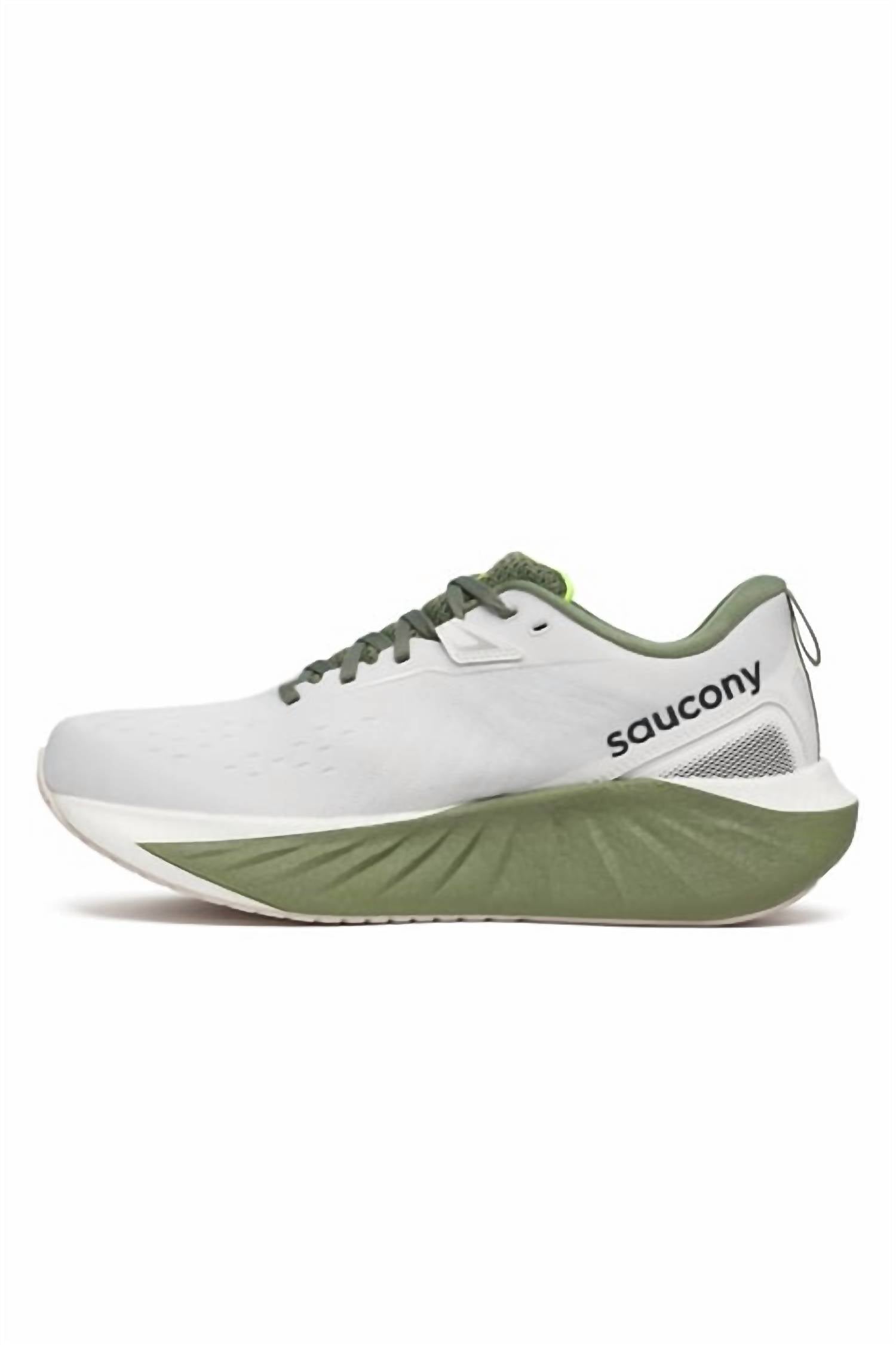 The Men's Triumph Twenty Two Sneaker by SAUCONY is an athletic footwear staple, perfect for the athleisure trend. Color: White Olivine, with a chunky heel that stands at a low height of 1 1/4"-2". Designed with a round toe, this sneaker is ideal for fitness and workout occasions during the summer season. Experience unparalleled comfort and style with every step.