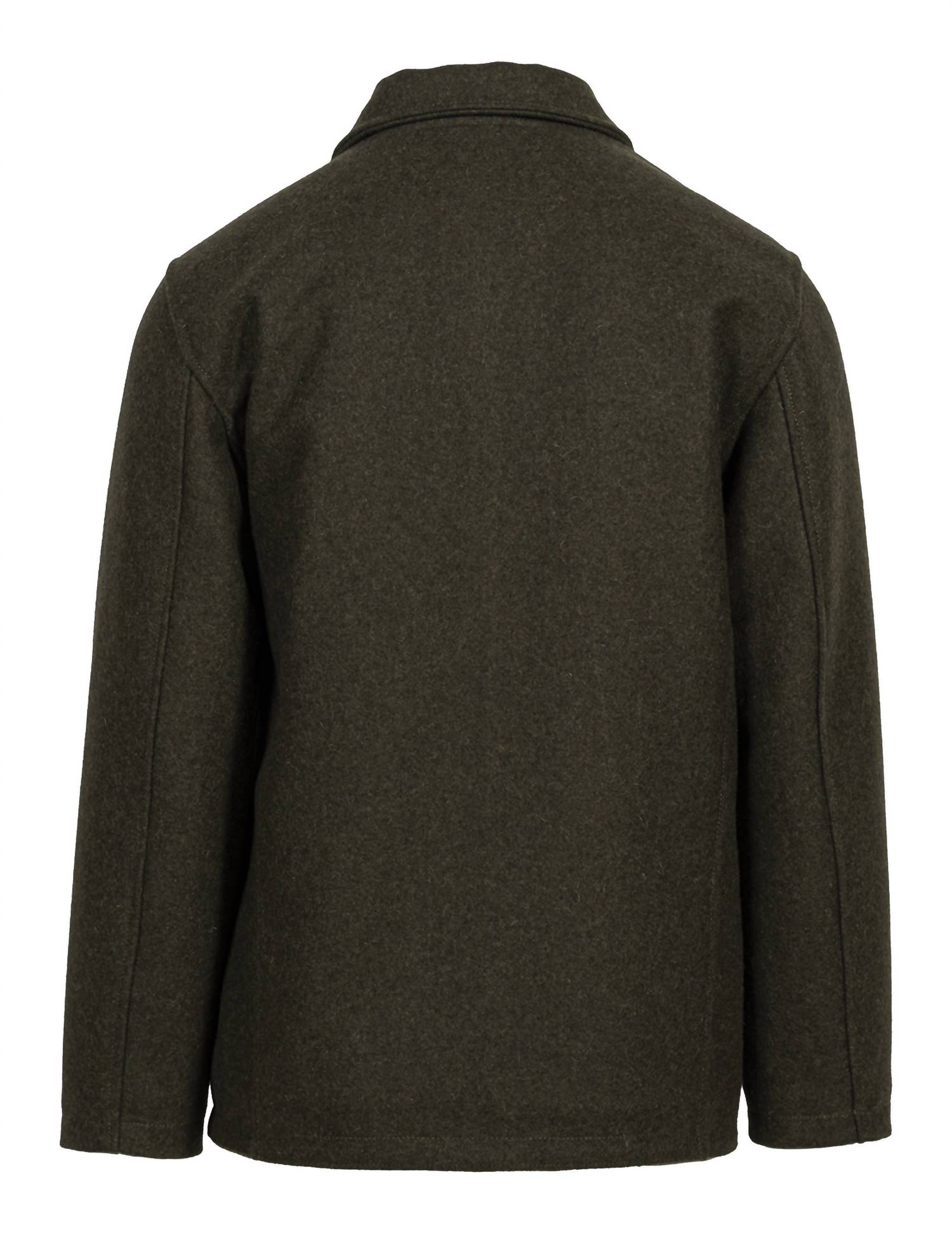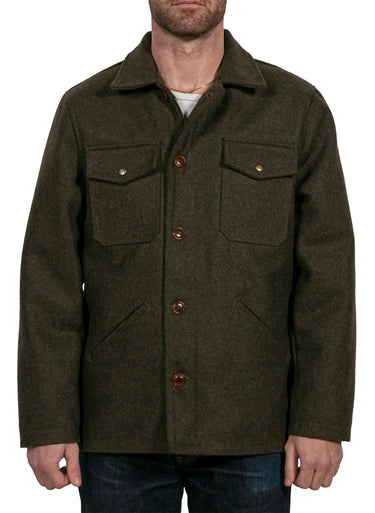 This Loden-colored bomber features a 29" back length with long sleeves, crafted from 100% wool for a textured aesthetic. It is designed with a practical zip front closure combined with a button-over fly piece and includes functional pockets, two upper patch pockets with snap flap closures and lower front diagonal single welt handwarmer pockets. Complete with a polyester diamond quilt lining, this imported jacket requires dry cleaning for maintenance.