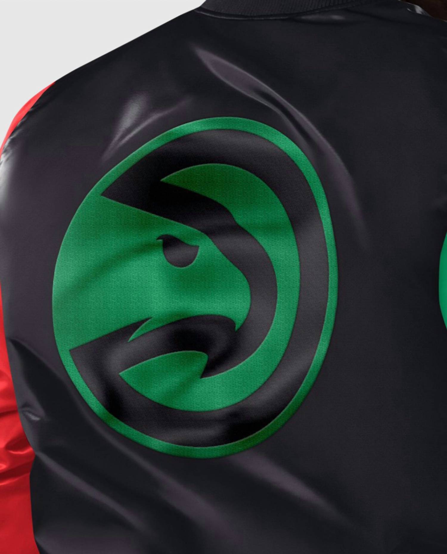 Celebrate Black History Month with the Men's Atlanta Hawks Satin Jacket, a limited edition from Starter and Ty Mopkins. Crafted in a glossy satin finish, this jacket features long sleeves and contrasting red and green accents for a striking look. It showcases team word marks and logos in twill appliqué, enhanced by metallic trim along the collar, cuffs, and wristband. Closure: Snap front. The interior is quilted with a unique touch, featuring "Till Victory Is Won" and Ty Mopkins' signature inside pocket.