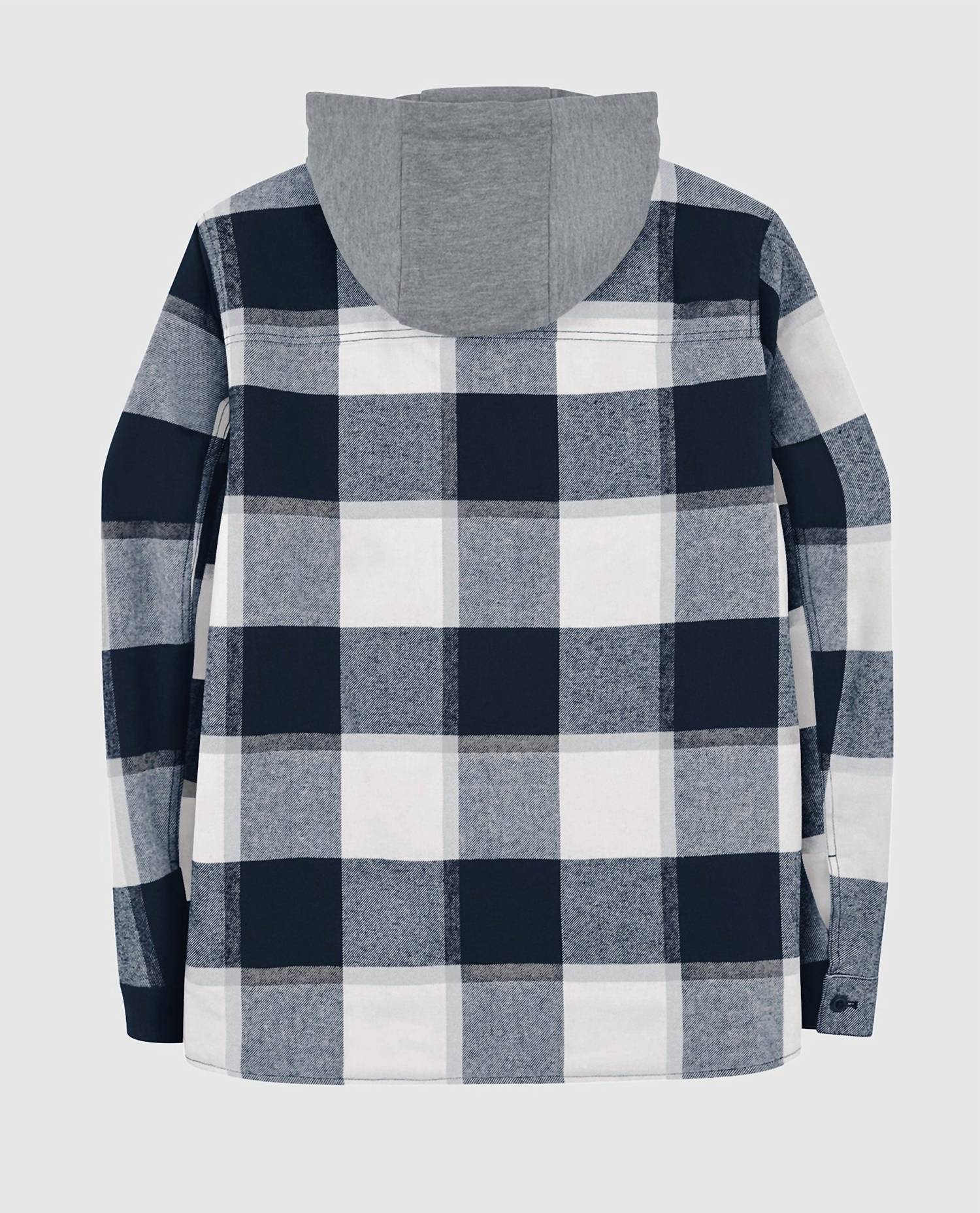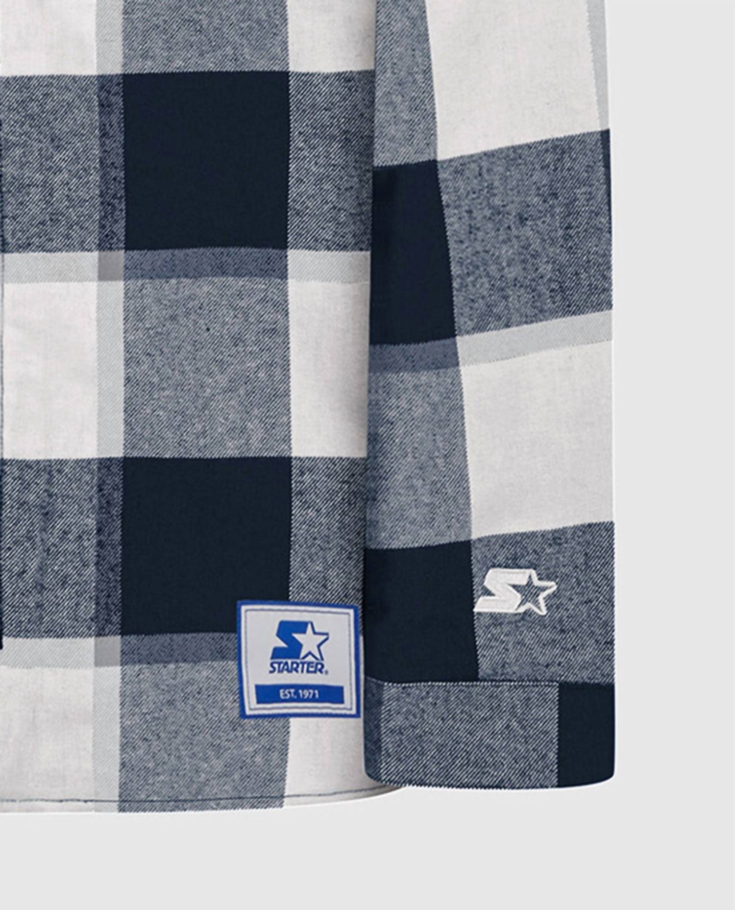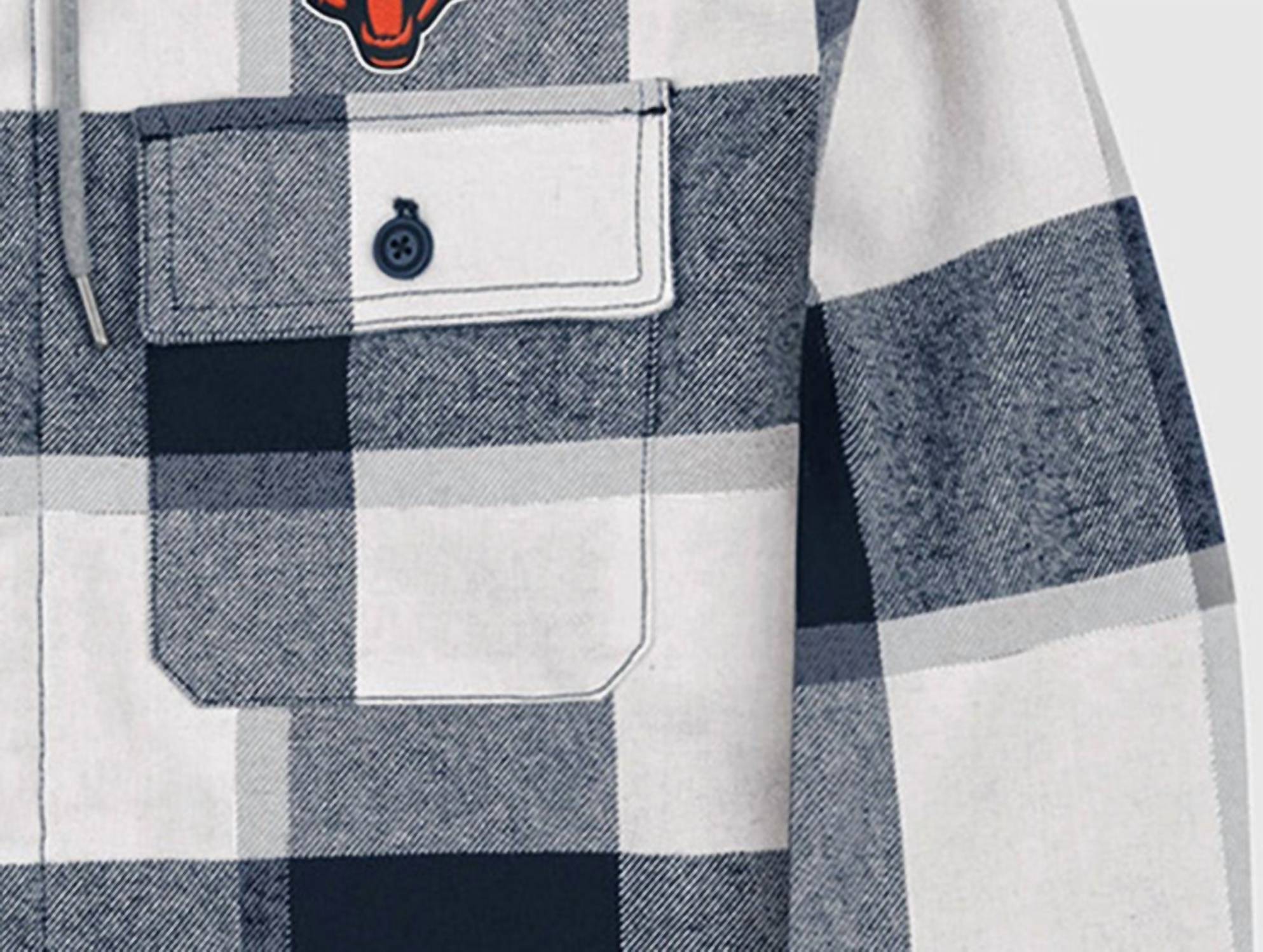 Introducing the Men's Chicago Bears The Big Joe Sherpa Lined Plaid Starter Jacket by Starter, a stylish addition for any fan. This navy plaid jacket features long sleeves, a hooded neckline, and the team logo embroidered above the left chest pocket. It's sherpa lined for added warmth, with a button closure and pockets for practicality. Made for everyday comfort and team spirit, it's embellished with a Starter jocktag and branded logo for authentic detailing.