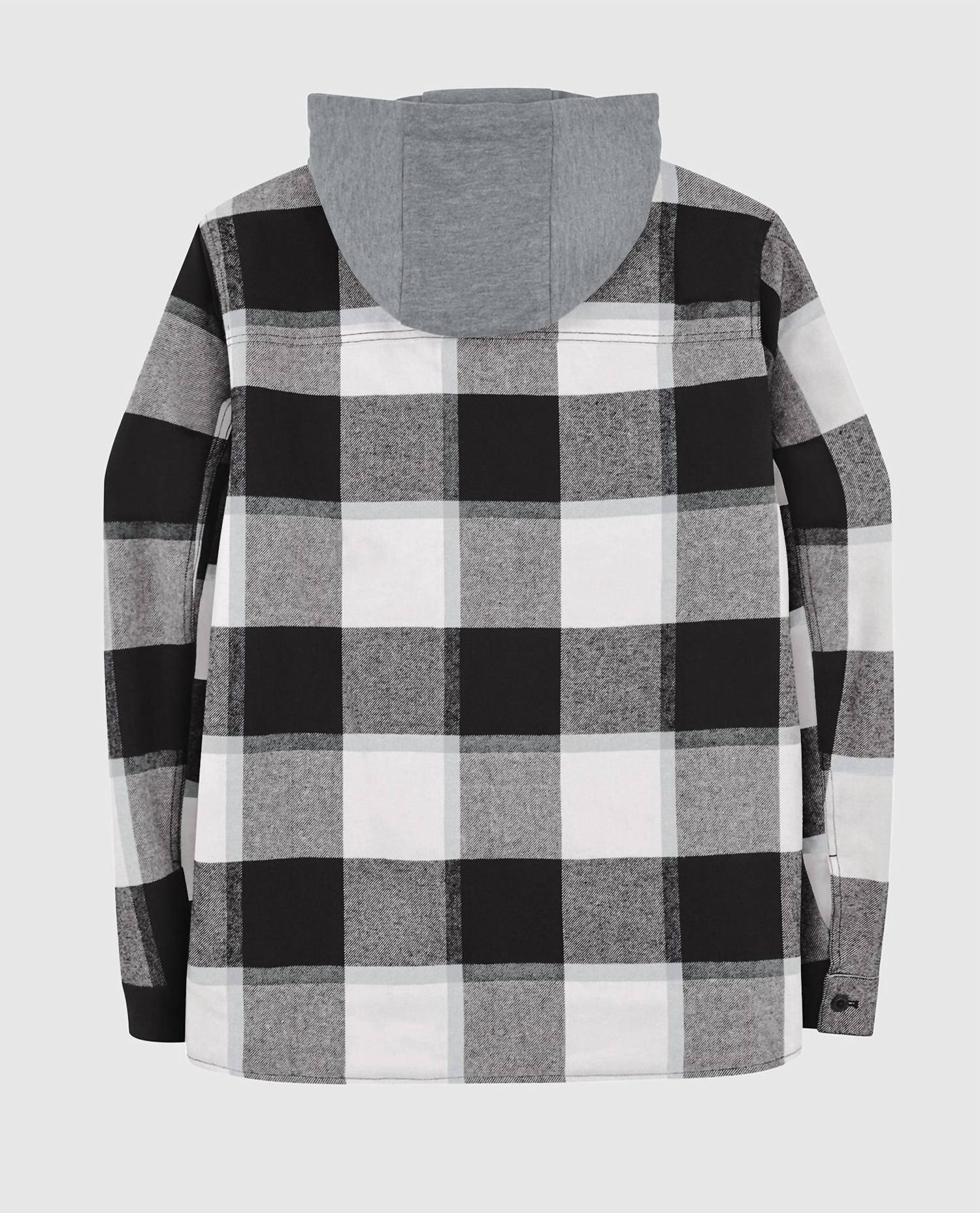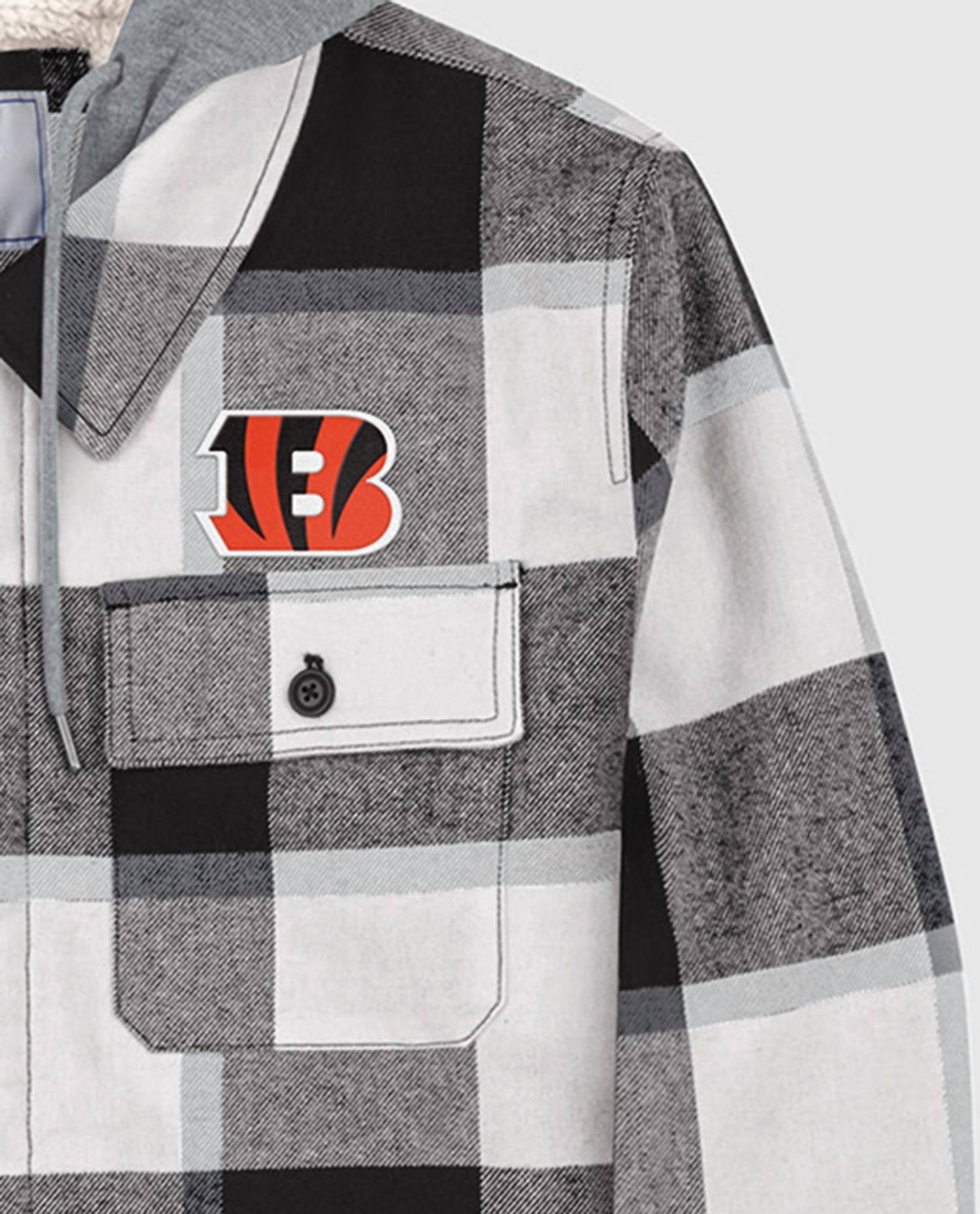 Elevate your outdoor look with the Men's Cincinnati Bengals The Big Joe Sherpa Lined Plaid Jacket by Starter. This stylish black jacket features long sleeves and a cozy hooded neckline, making it a perfect choice for cooler days. Crafted with a sherpa lining, it boasts practical elements such as a button closure and pockets, while the plaid pattern adds a classic touch. Adorned with the team logo above the left chest pocket and signature Starter branding, this jacket fuses comfort with a sporty edge.