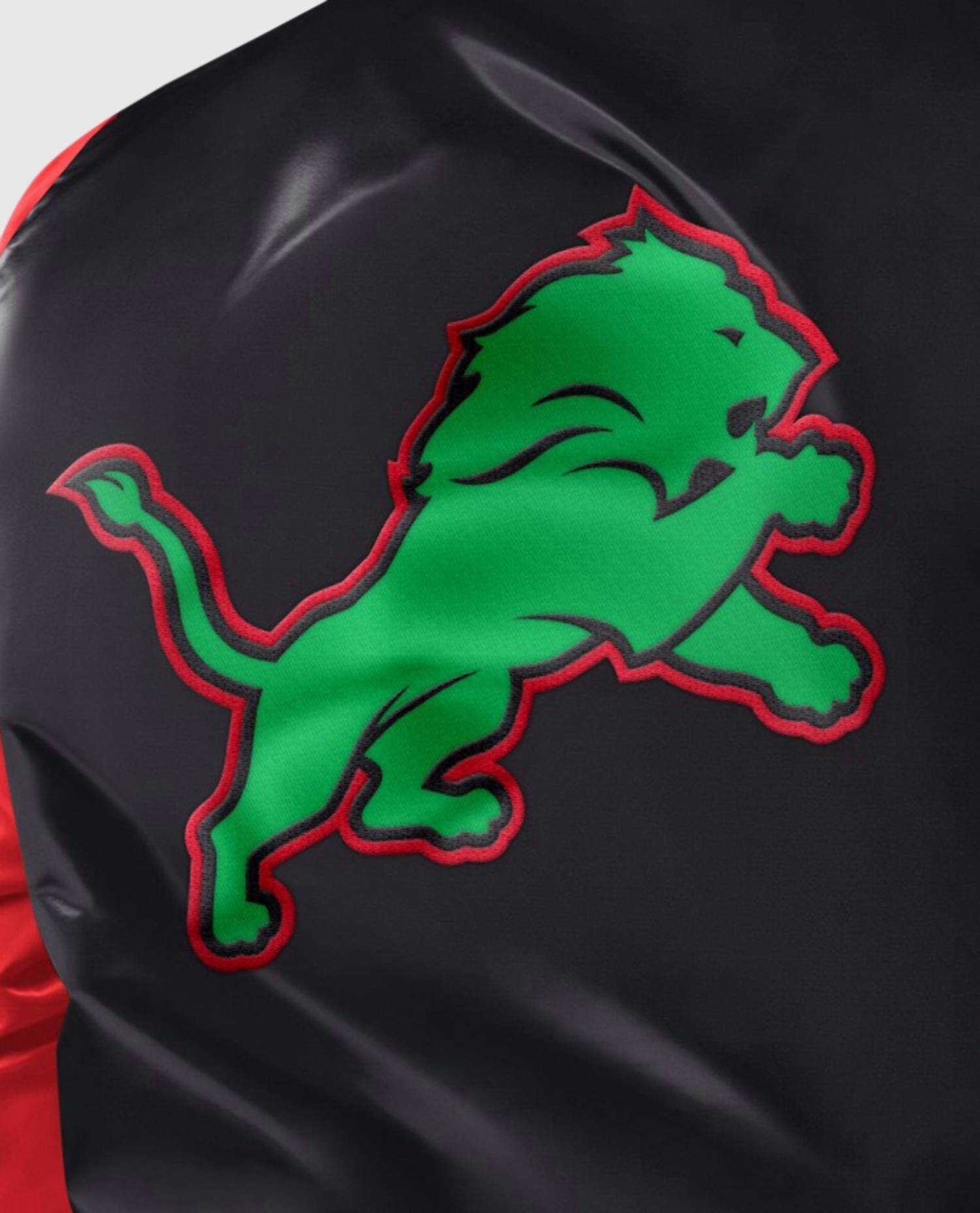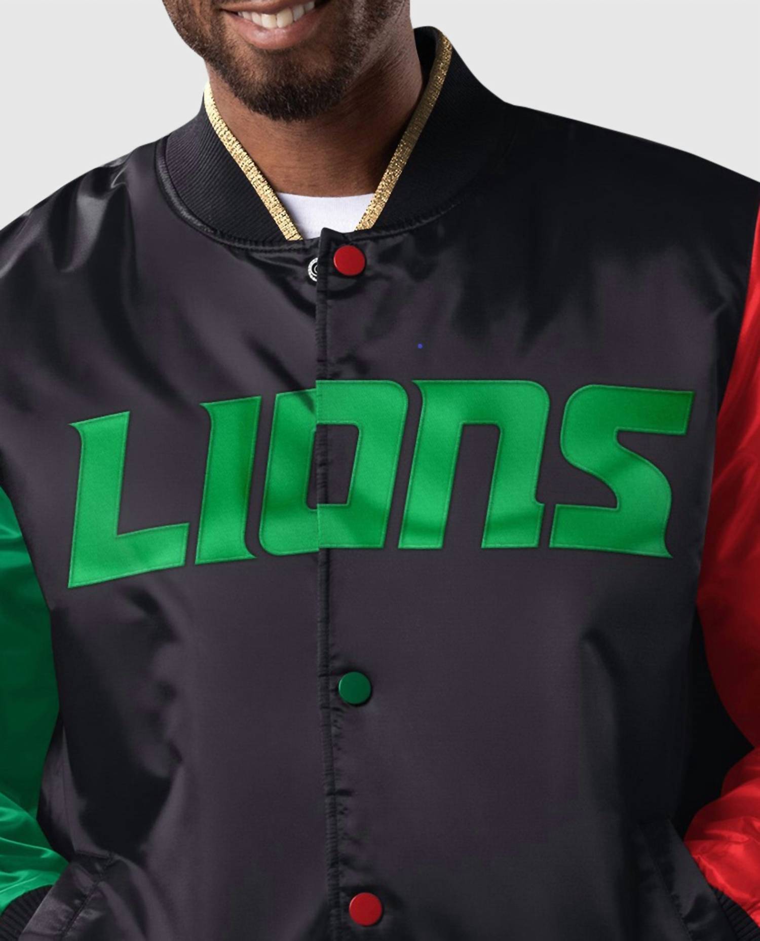 Celebrate Black History Month in style with the Men's Detroit Lions Quilted Lining Satin Full-Snap Jacket by Starter. This exclusive piece features long sleeves in contrasting red and green, with twill applique details, including the team word mark on the front chest and logos on the sleeves. Made from glossy black satin, this jacket also includes an ornate touch of metallic trim on the collar, cuffs, and wristband for a distinctive look. Closure: Snap.