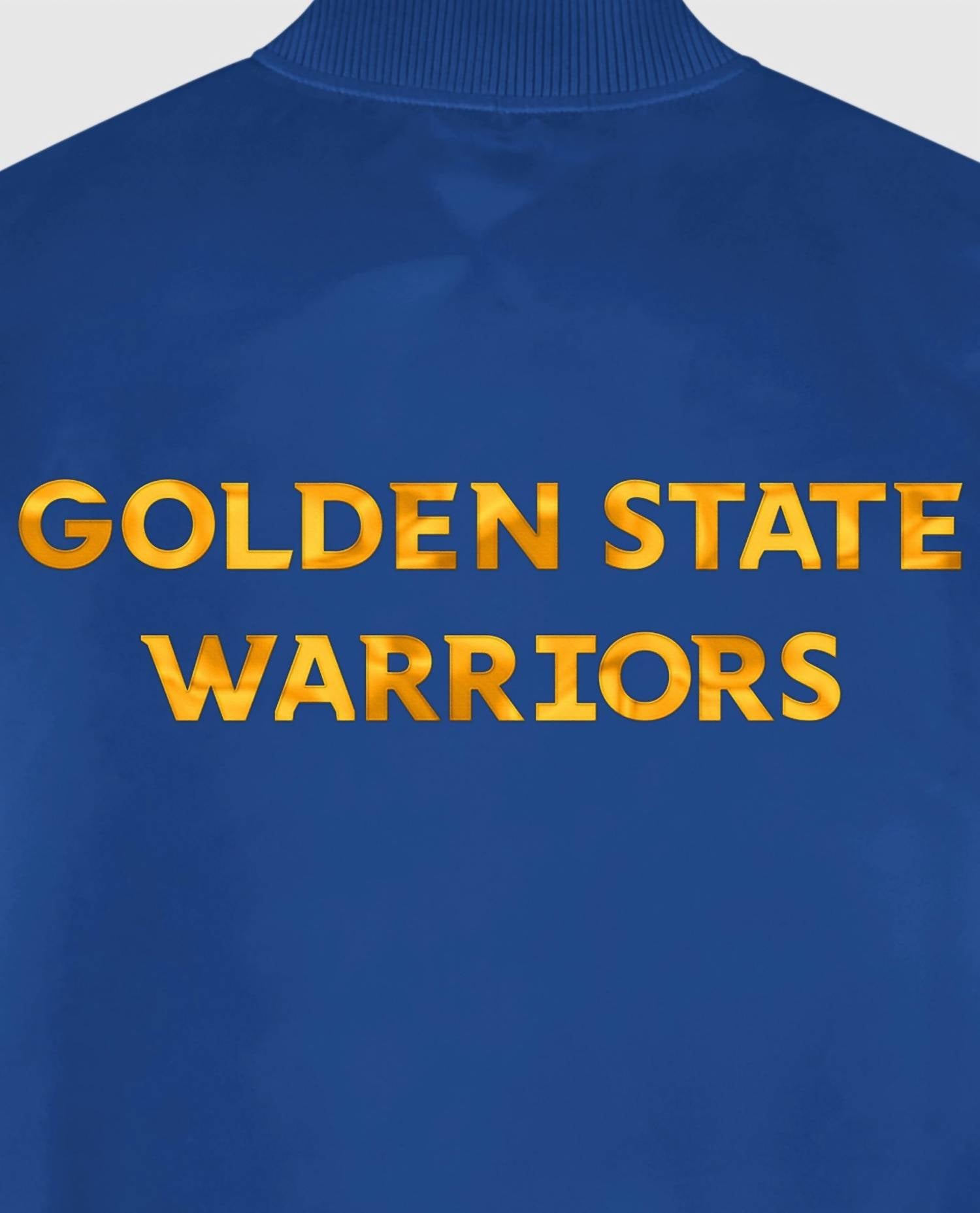 Step up your game with the Men's Golden State Warriors Satin Full Snap Jacket by Starter, showcasing a vibrant primary team color. This varsity jacket features long sleeves adorned with contrast team color stripes and a collar neckline. Detailed with team logo twill applique patch on the left chest, wordmark on the back, and conference logo applique on the sleeve, it speaks to true team spirit. Closure: Snap closure. Pattern: Graphic.