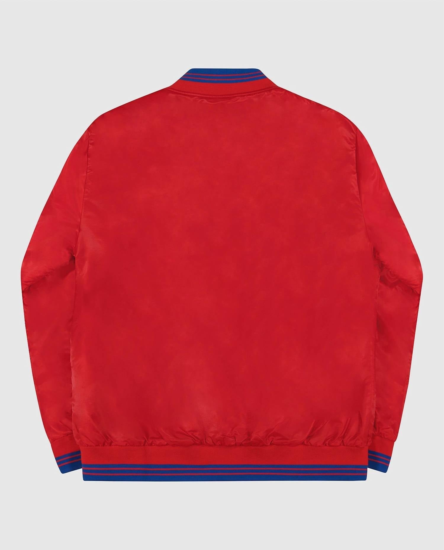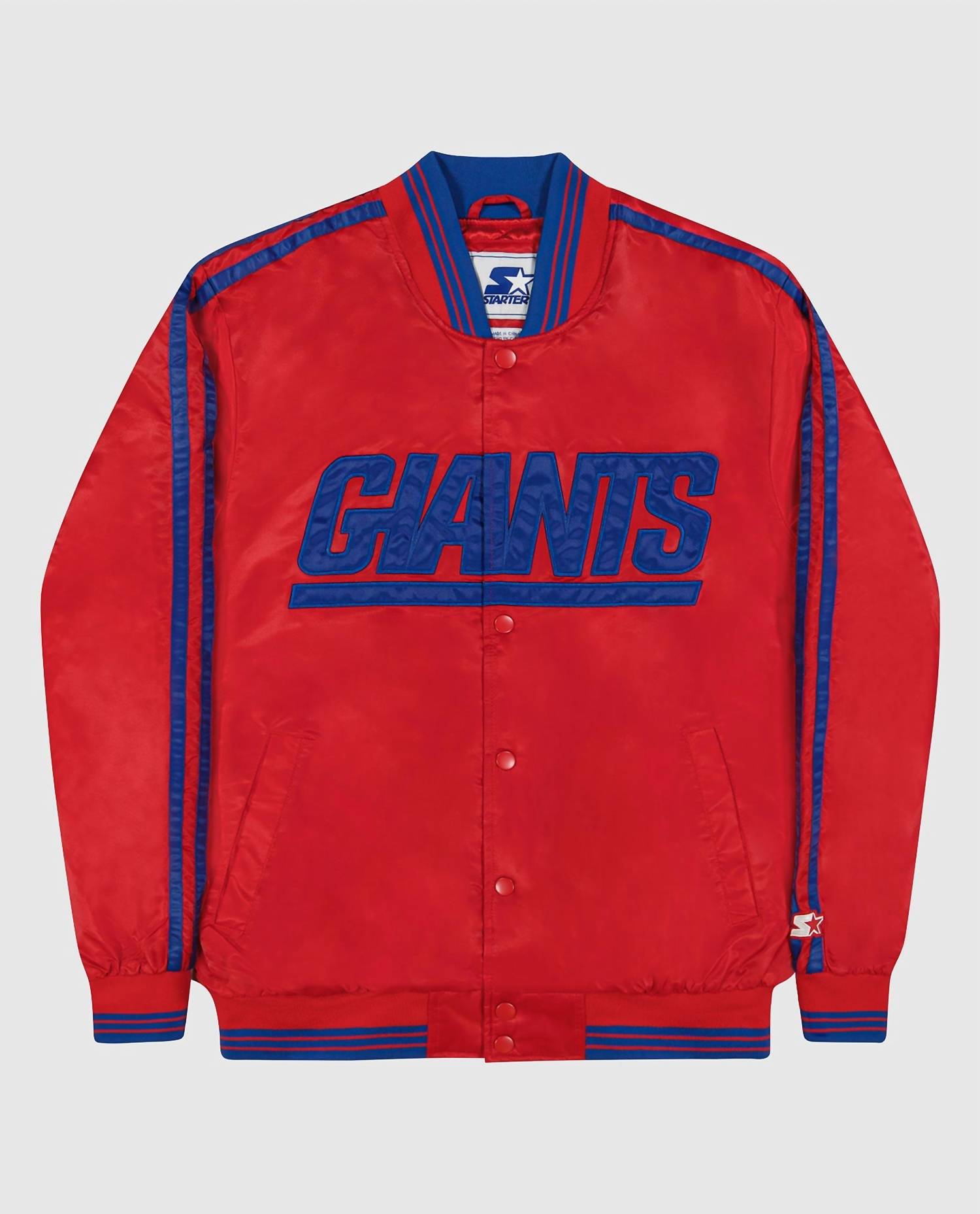 Elevate your game day look with the Men's New York Giants Varsity Satin Jacket by Starter, featuring long sleeves and crafted from 100% nylon twill satin. The full-snap closure enhances convenience and adds a classic touch to this bomber style jacket. Sporting the primary team color with secondary color stripes, it showcases a twill applique team wordmark across the chest and a contrast striped rib knit at the collar, cuffs, and waistband. Ideal for the Y2K trend lovers, this jacket pairs perfectly with your spring wardrobe.