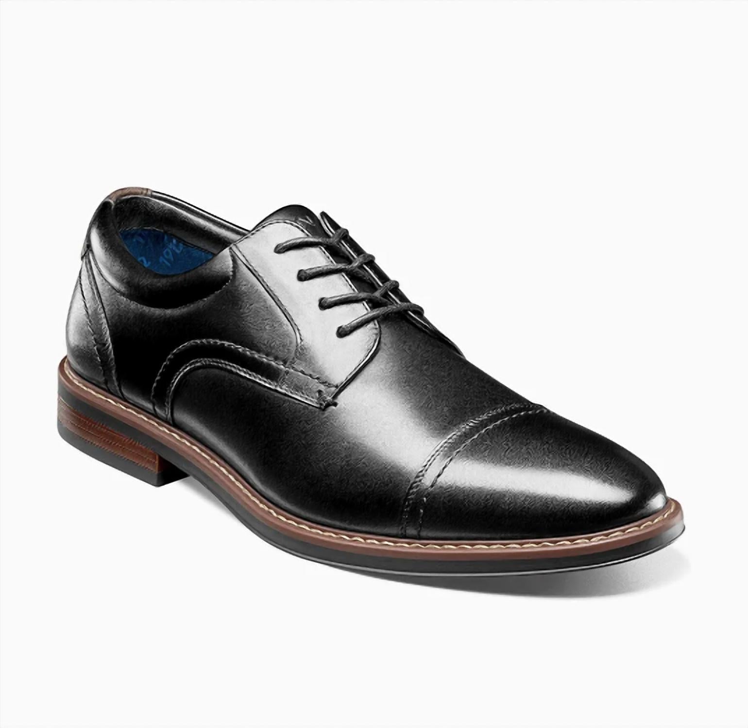 Introducing the Nunn Bush Westfield Cap Toe Oxford in sleek black, a must-have for any wardrobe seeking versatility. Crafted from smooth leather and featuring soft Suedetec linings, this shoe ensures comfort with every step. It boasts a molded EVA sole with a Comfort Gel heel pod and Flex Technology for excellent flexibility and shock absorption. Perfect for springtime workwear or Thanksgiving engagements, this shoe effortlessly combines style and all-day comfort.