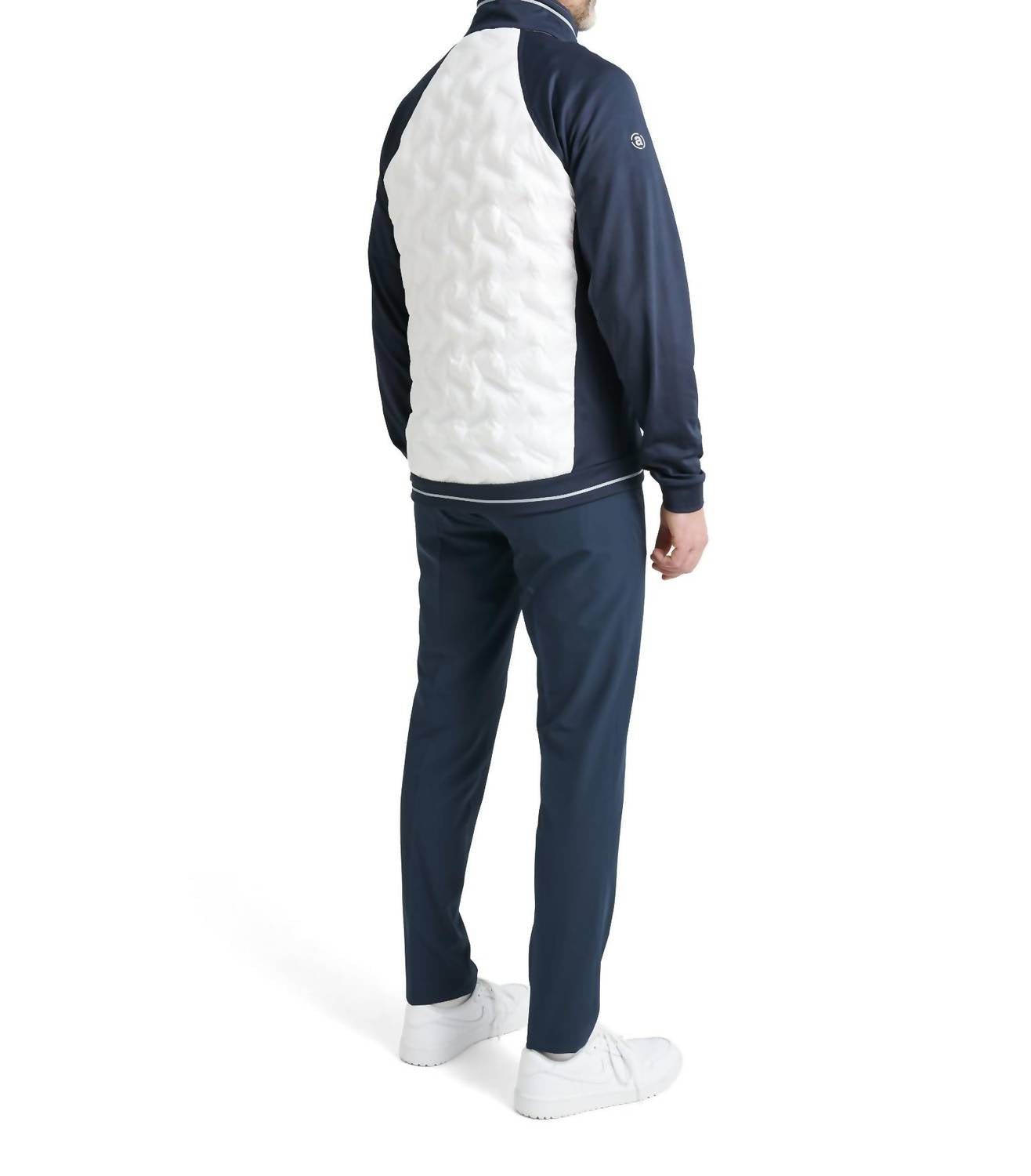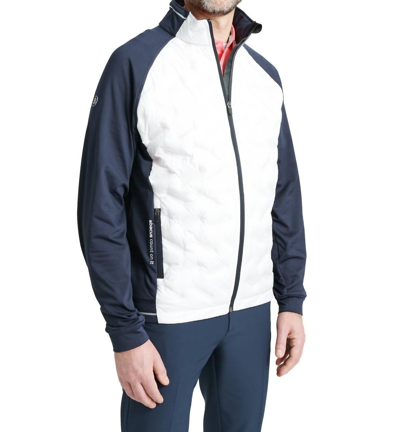 The Grove Hybrid Jacket by Abacus Sportswear US is an essential men's piece for the winter season, combining style and functionality in navy white. This windbreaker features long sleeves and a seamless quilted fabric that offers windproof protection with added padding at the front and back to ensure warmth. Made from high-quality polyester, it incorporates stretchable and breathable fleece on the side panels, sleeves, and shoulders for optimal movement. With a full zip closure at the front and in the two front pockets, it's designed for practicality and comfort.