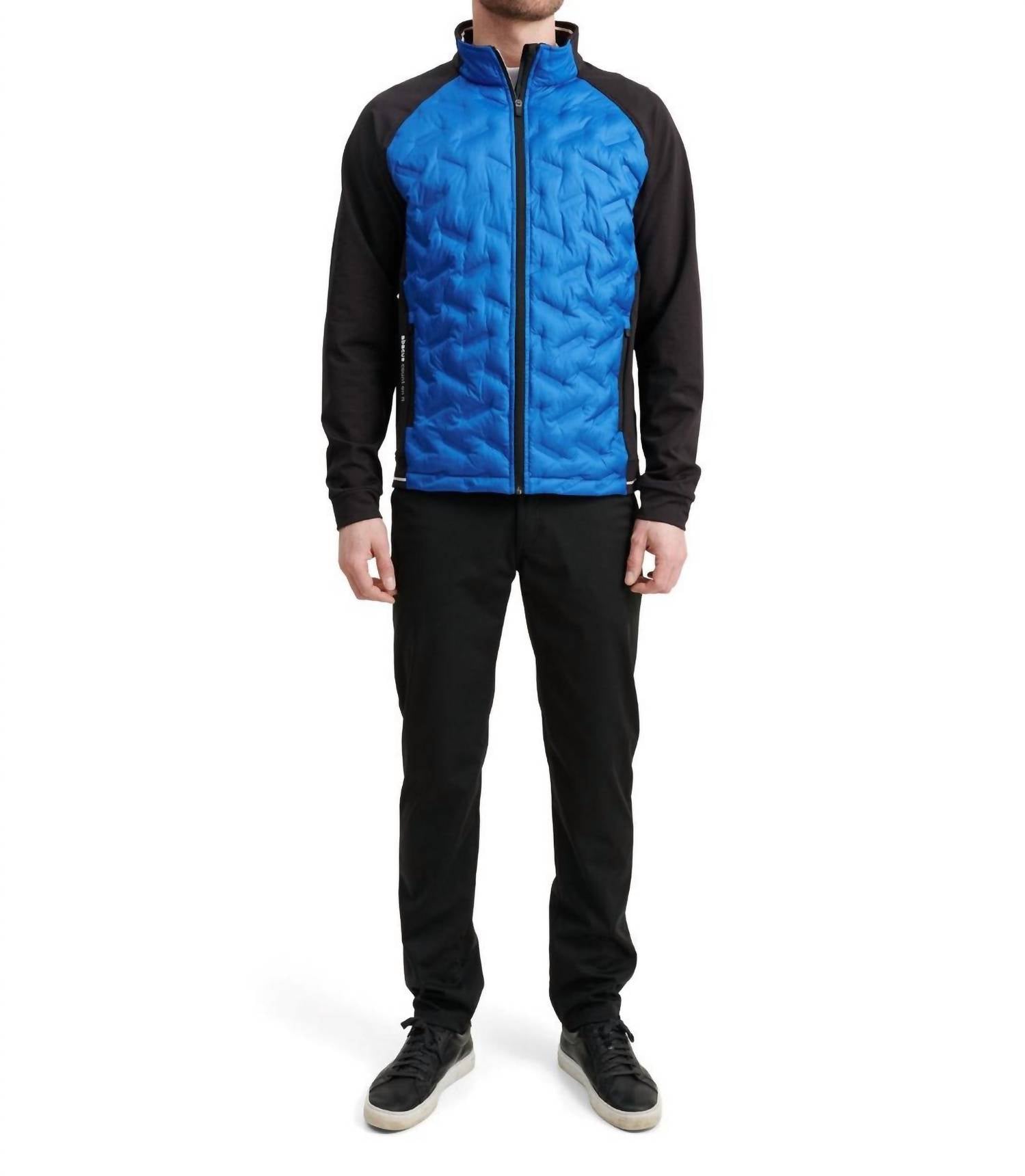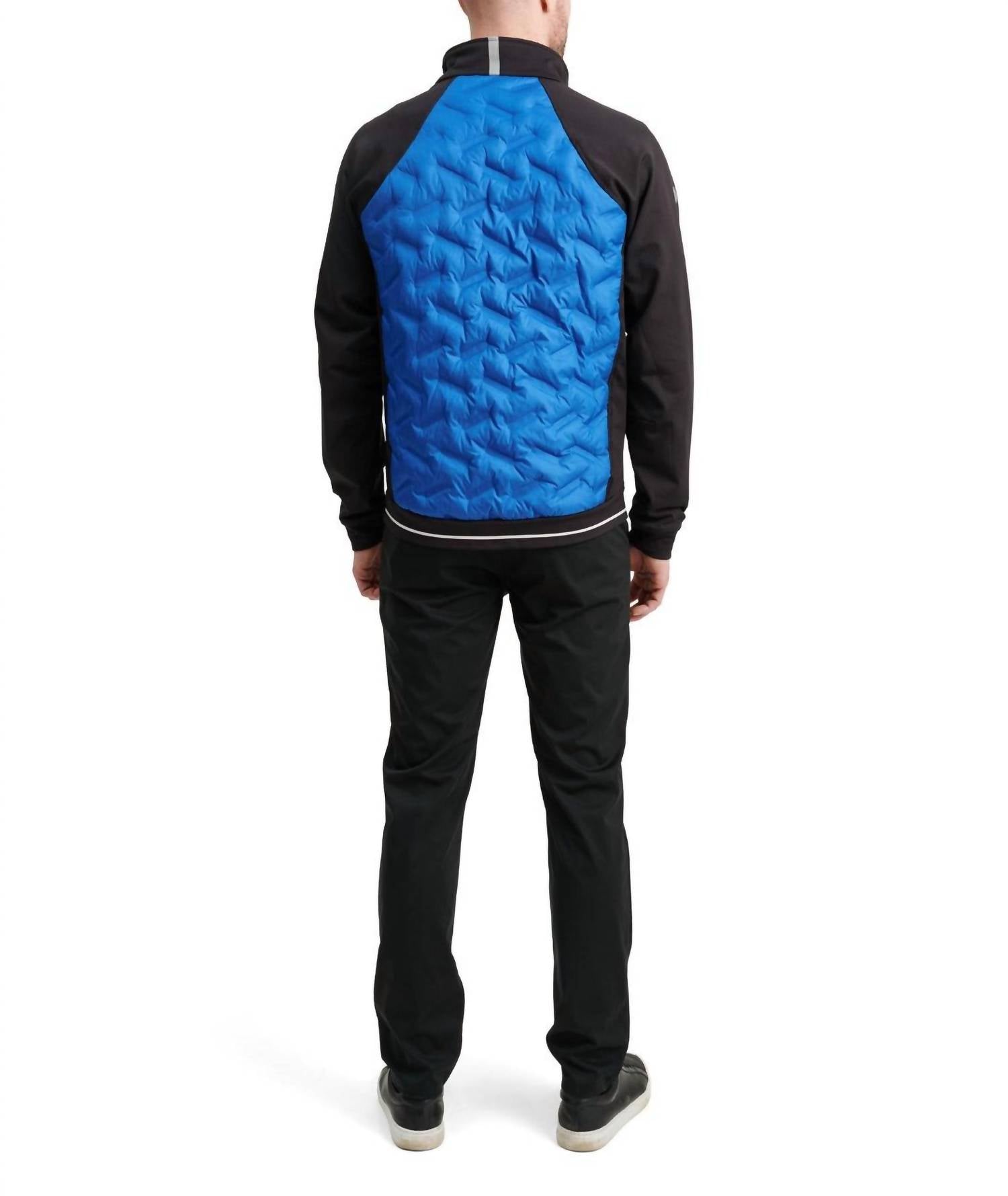 Introducing the Grove Hybrid Jacket by Abacus Sportswear US, a stylish solution for winter warmth in a sophisticated dark cobalt black. This windbreaker features long sleeves and a quilted, windproof polyester fabric that is padded at both front and back, ensuring you stay warm. Its side panels, sleeves, and shoulders are crafted from highly stretchable fleece, providing excellent breathability and movement. This jacket also includes a full zip closure, two front zippered pockets, and distinctive contrast stripes at the bottom and outside collar.