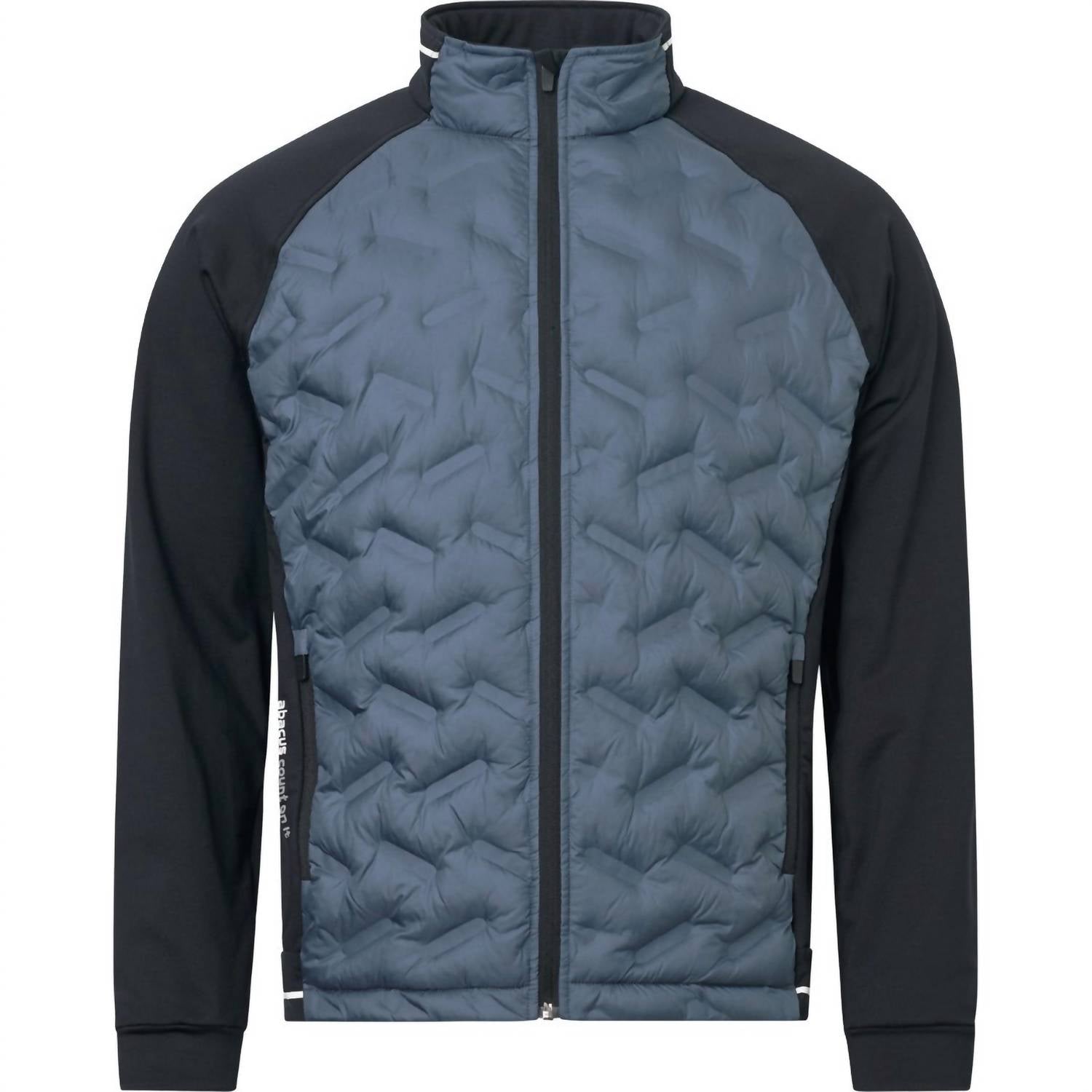 Elevate your winter wardrobe with the Grove Hybrid Jacket by Abacus Sportswear US, presented in a stylish dusty blue. This men's windbreaker features long sleeves and is crafted from a windproof, seamless quilted polyester with padded front and back for warmth. The full zip closure ensures easy wear, while stretchy fleece on the sides, sleeves, and shoulders enhances movement. Designed with two front zippered pockets and adorned with contrast stripes and the Abacus logo, this jacket blends function and style effortlessly.