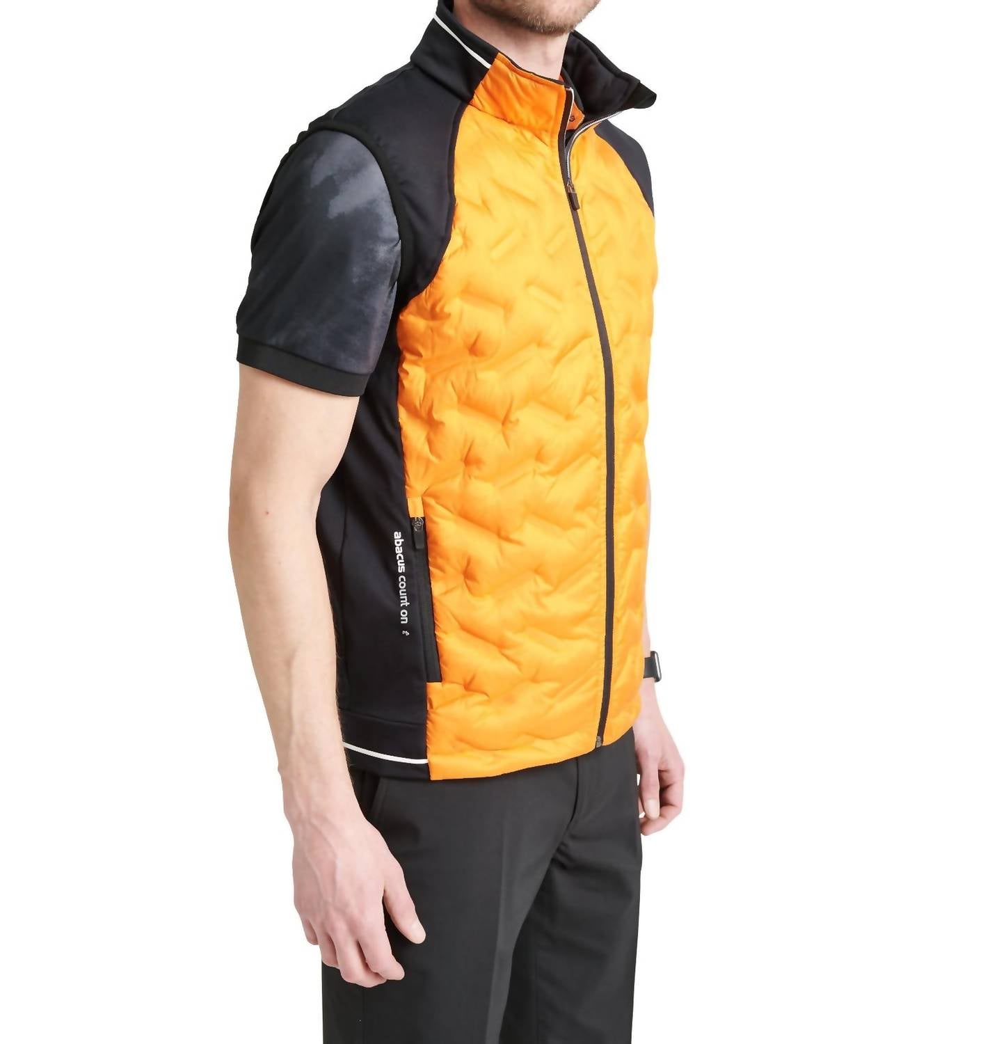 Enhance your winter wardrobe with the Abacus Sportswear US Grove Hybrid Vest in Mandarin. This sleeveless vest combines seamless quilted windproof polyester at the front and back with stretchable fleece side panels and shoulders for exceptional warmth and movement. Featuring a full zip closure and two front pockets, the vest includes stylish contrast stripes at the bottom and collar. Ideal for men seeking functional yet fashionable layering, this patterned piece is adorned with the Abacus logo for a refined touch.