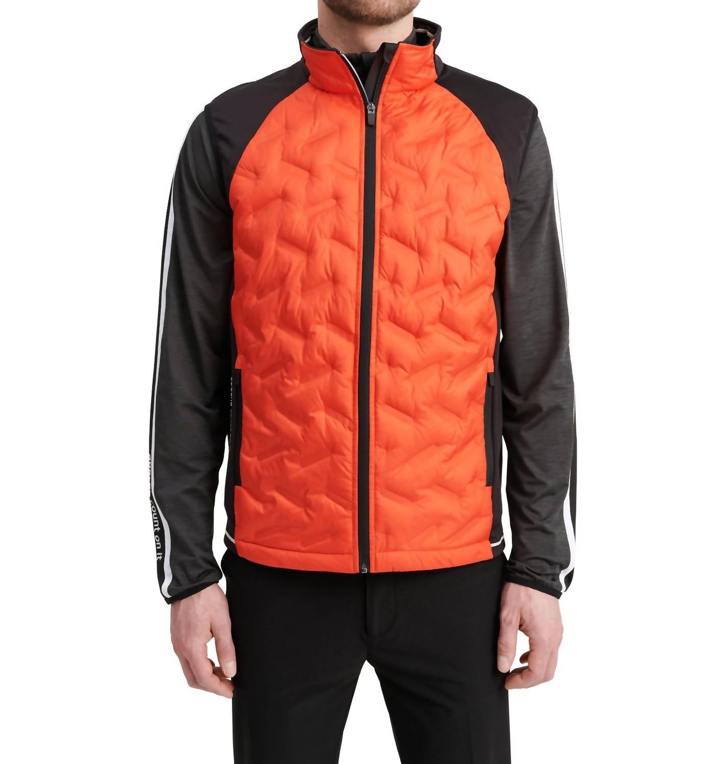 Experience warmth and mobility with the Abacus Sportswear US Grove Hybrid Vest, in a vibrant Sunset hue. As a sleeveless winter essential, it features a seamless quilted windproof fabric at the front and back, while stretchable fleece on the side panels and shoulders allows for better movement. Made from durable polyester with a full zip closure and practical zippered pockets, it is as functional as it is stylish. Accented by a contrast stripe at the body bottom and collar, complete with the Abacus logo details, this vest makes for an ideal patterned piece to elevate your winter wardrobe.