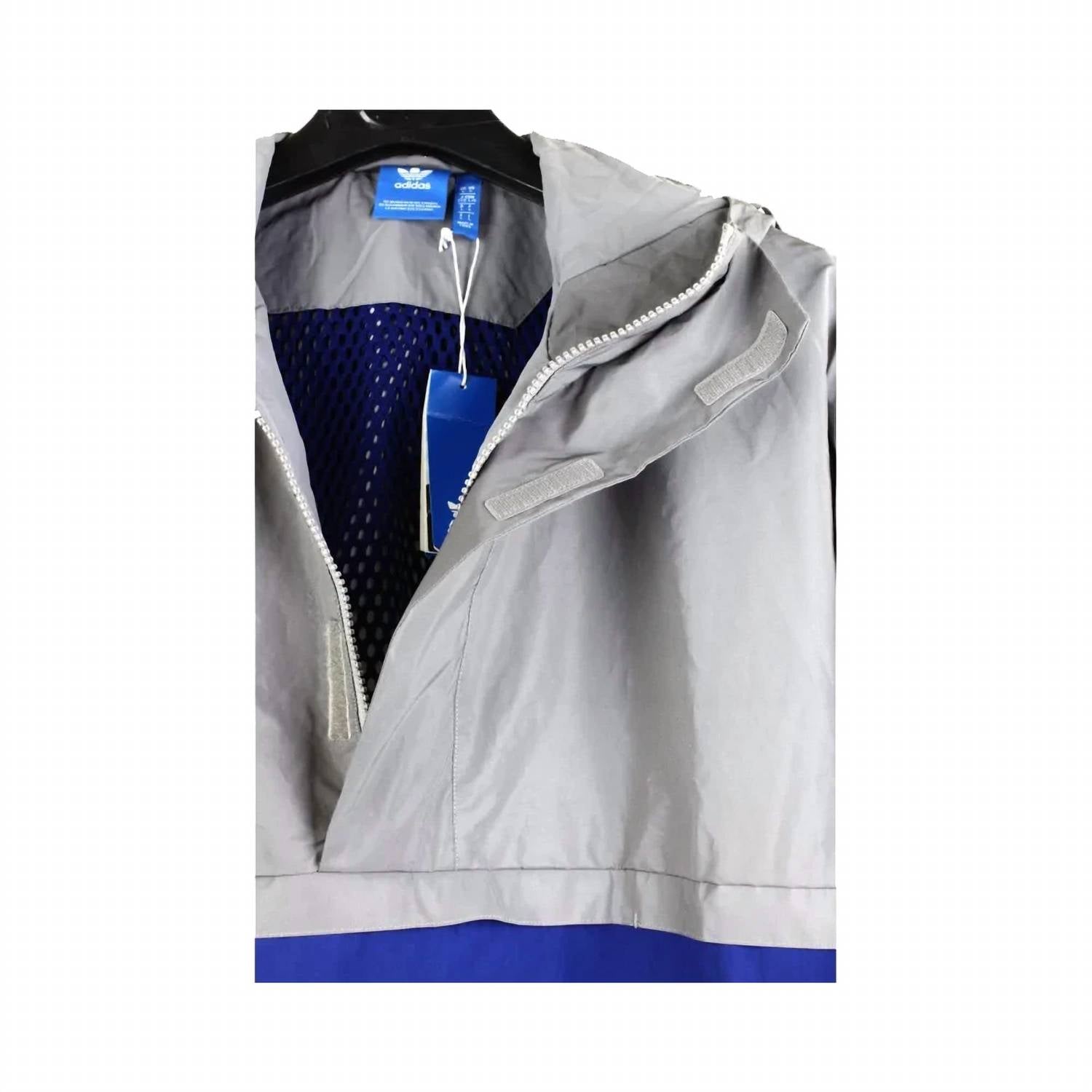 The Adidas Originals Eqt Reflective Windbreaker Jacket embodies 90's heritage with a streetwise twist, perfect for hiking or everyday streetwear. With its long sleeves and a grey and blue color block design, this piece includes reflective details, side zipped pockets, and a drawstring curved hemline that enhances both form and function. Crafted from 100% Nylon and Polyester, it features a drawstring hood and a concealed quarter zip closure for a sleek finish. Care for it by dry cleaning, allowing it to maintain its sleek look.