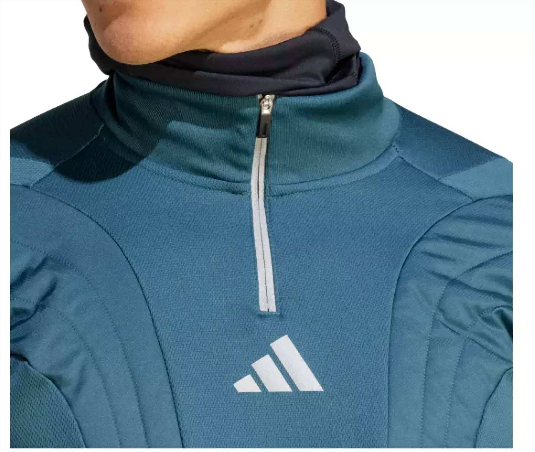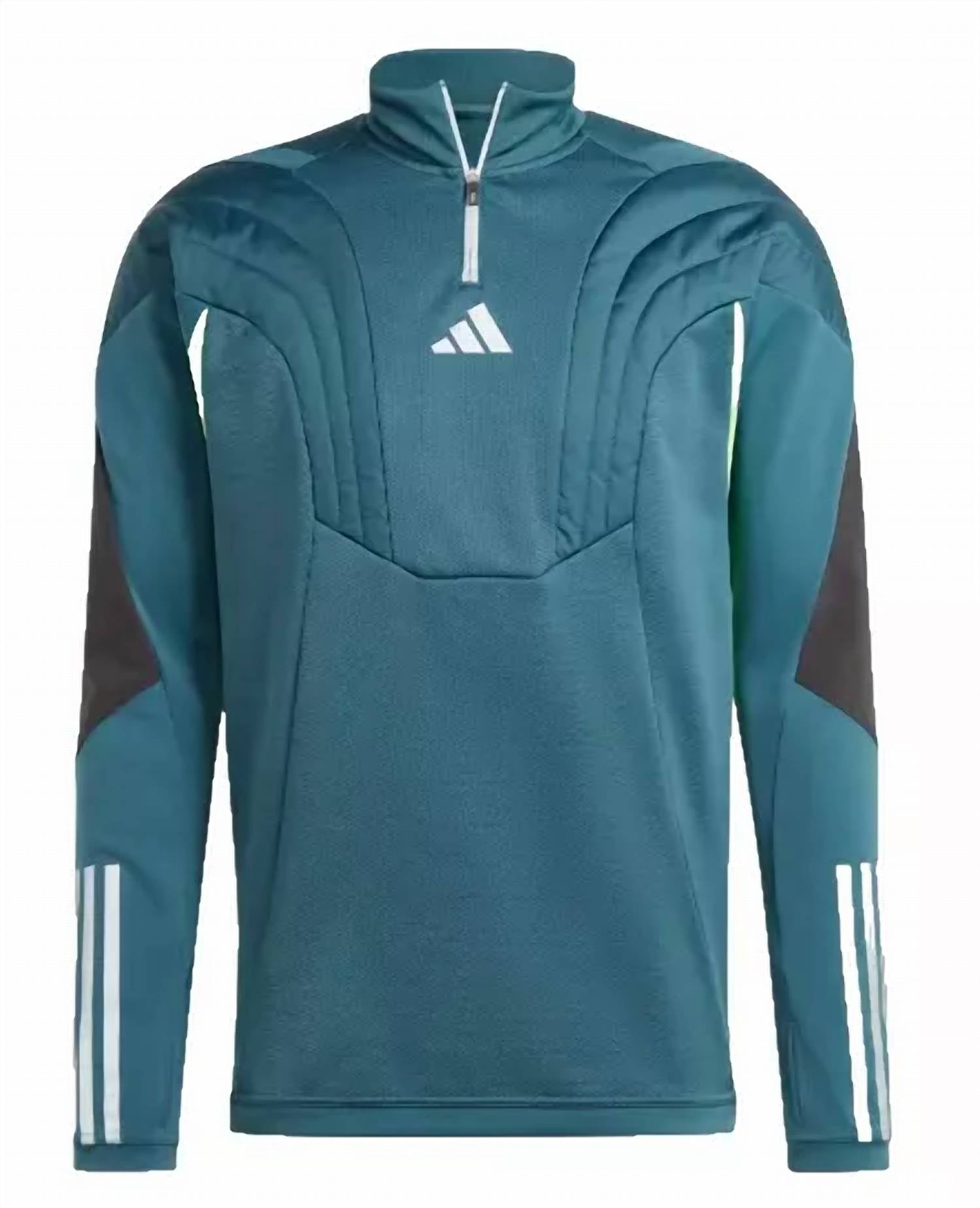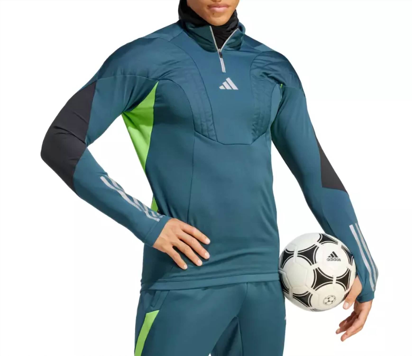 Introducing the Tiro 23 Soccer Jacket by adidas, a perfect blend of style and functionality in ARTIC NIGHT. Crafted with 100% Polyester, this jacket features long sleeves with thumbholes and a quarter-zip closure for easy wear. Designed for performance, it includes AeroReady moisture-wicking technology and a padded chest for optimal warmth, along with a ribbed stand-up collar featuring a balaclava. Ideal for practicality and safety, the jacket sports a reflective logo on the chest. Approximate measurements include a chest width of 19 inches and a length of 29 inches from shoulder to hem. Care is simple with machine wash instructions.