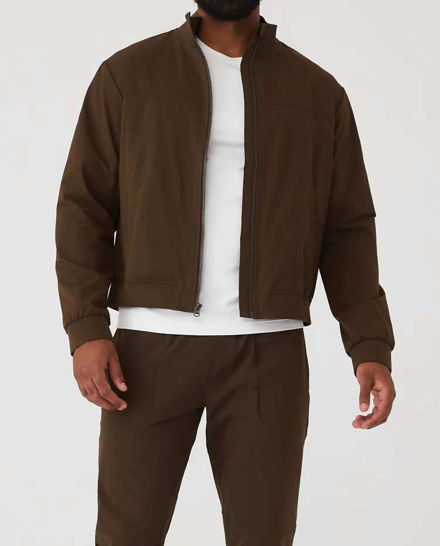 Classic, lightweight bomber jacket. Handy, invisible zippered side pockets. True to sizeDesigned for a boxy, bomber-style fit. Hits at the hip. Performance woven fabric for comfort & versatility. Ribbed cuffs & hems. Water-repellant finish. Machine wash