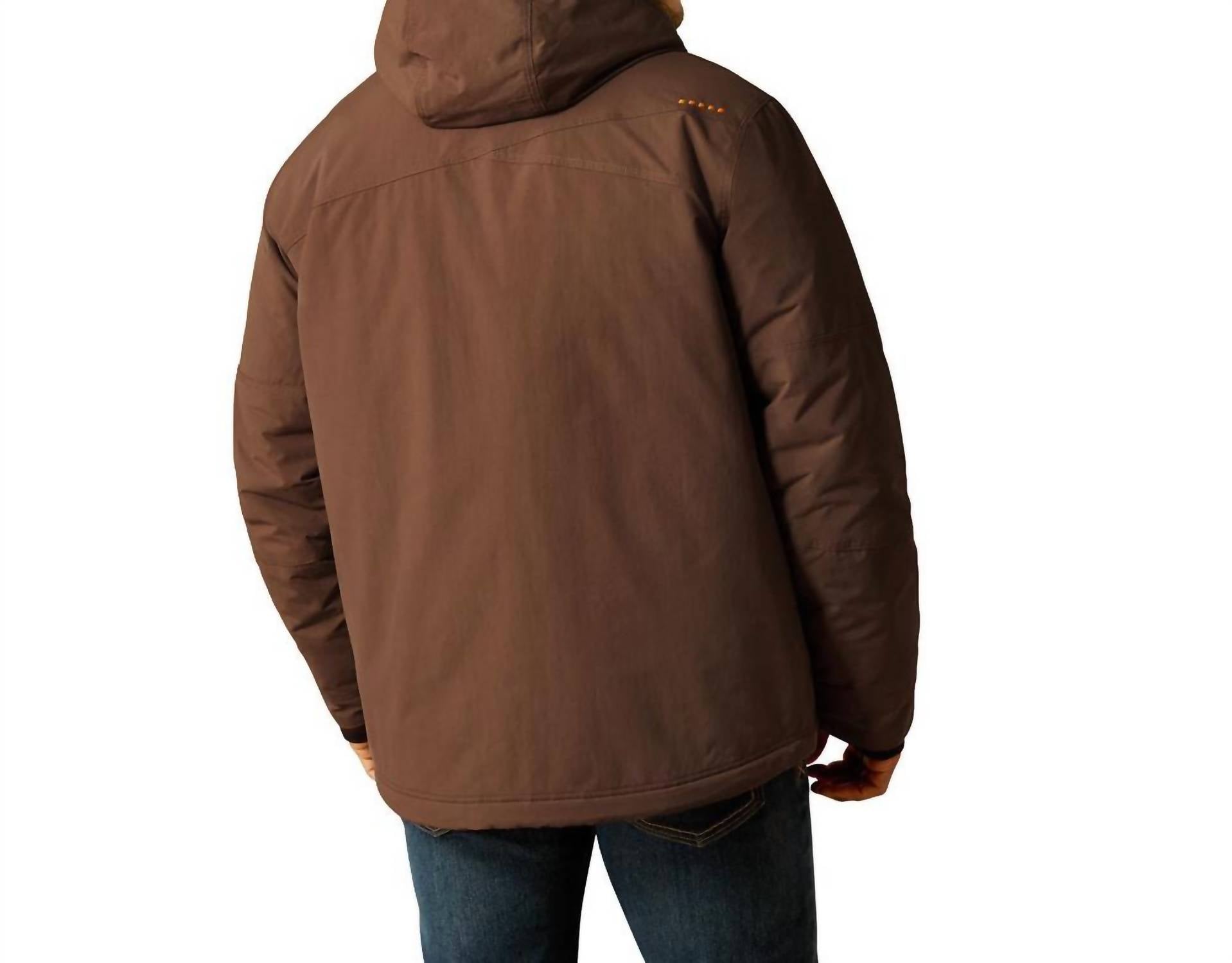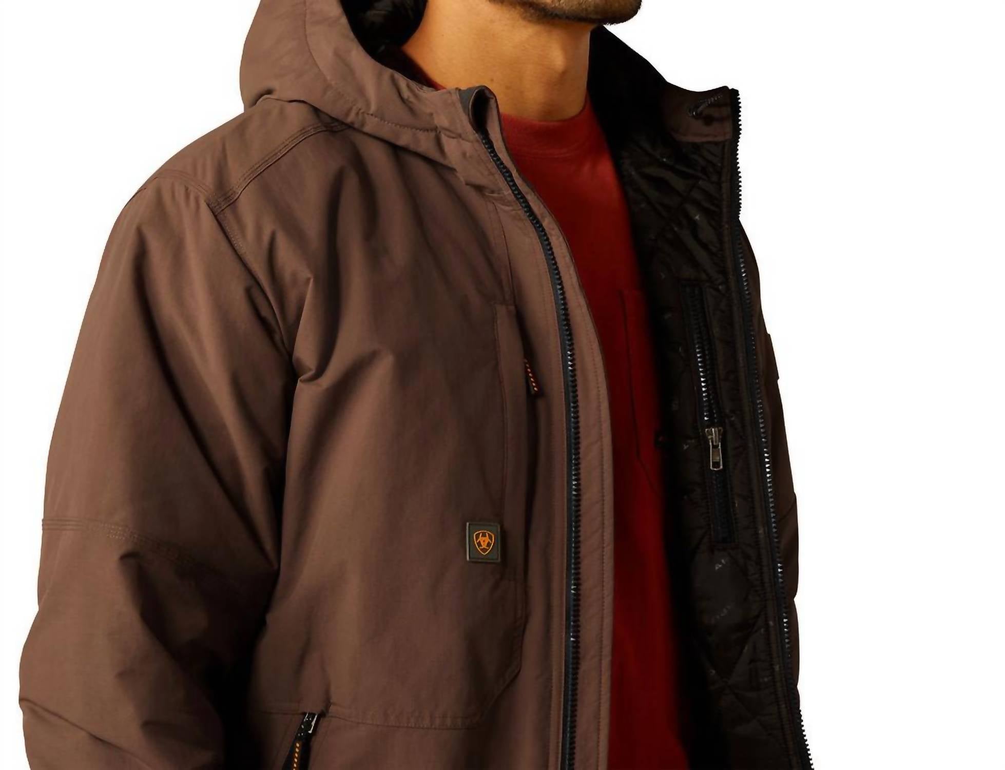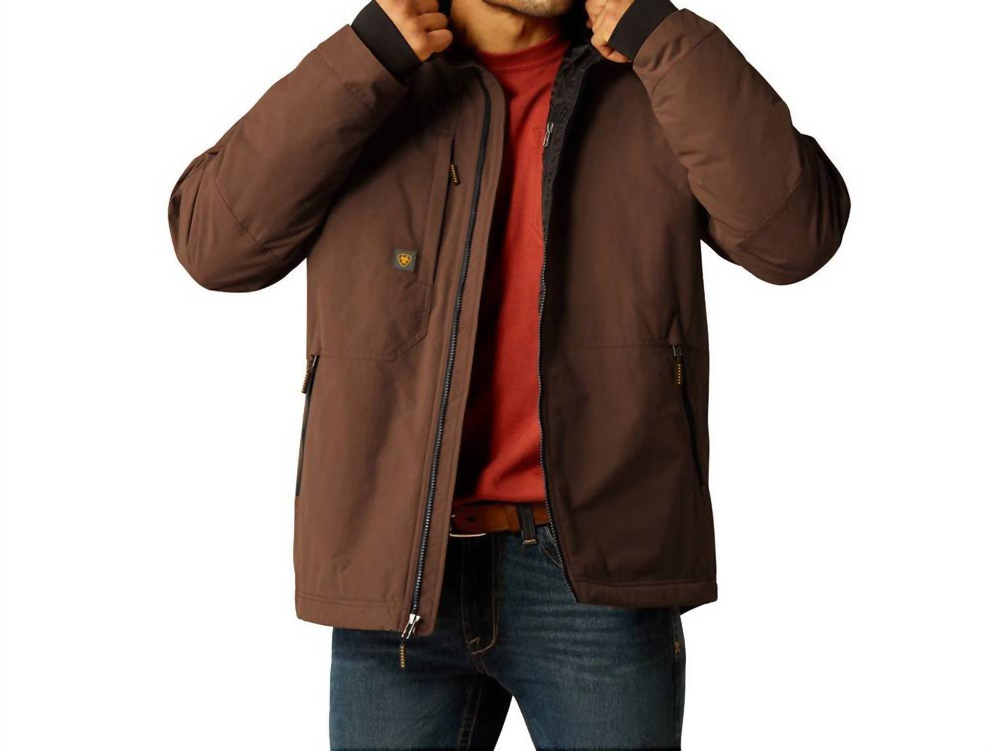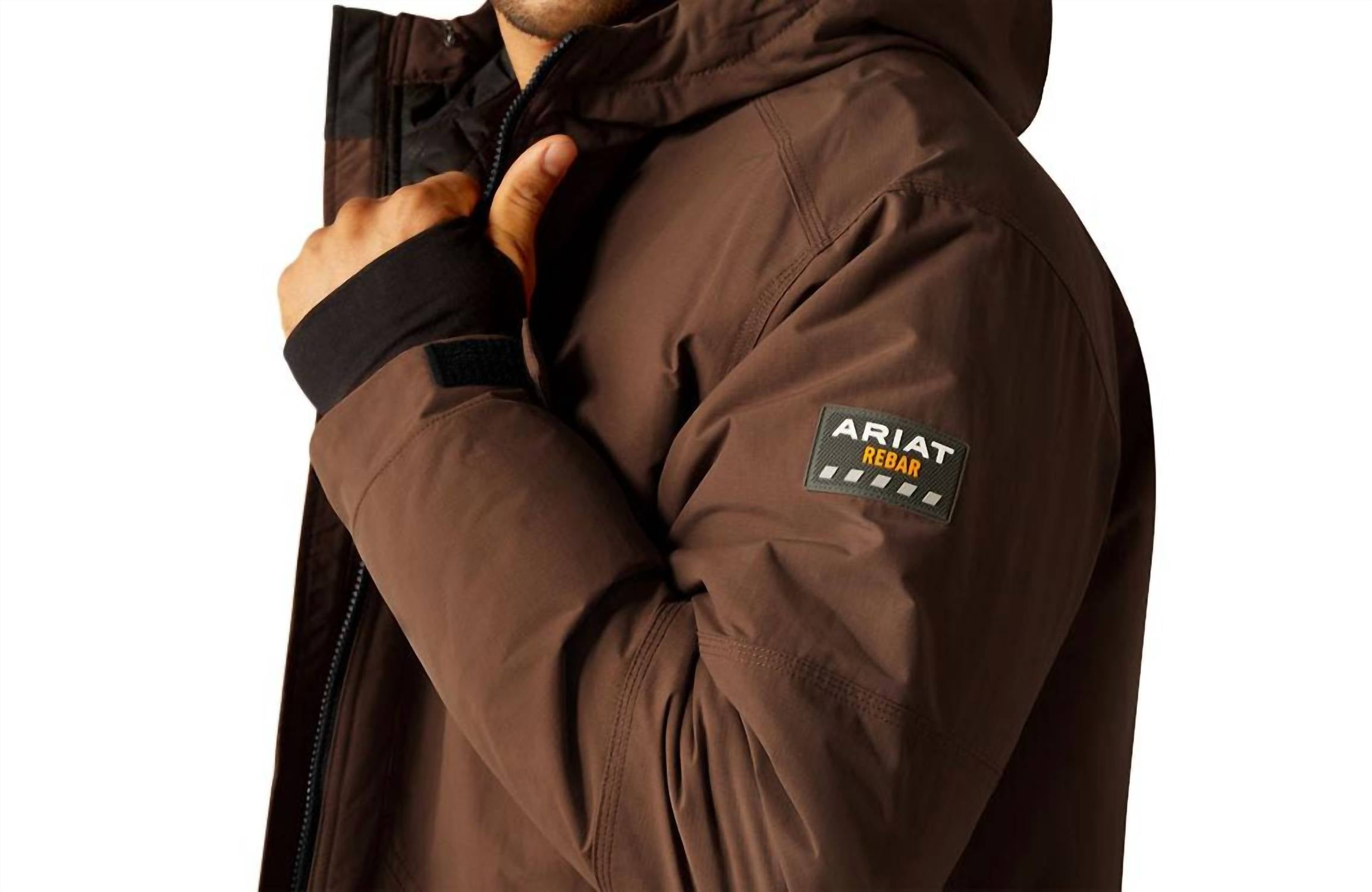 Introducing the ARIAT Rebar Cordura Ripstop Insulated Jacket, a brown winter essential perfect for streetwear enthusiasts. This men's lightweight jacket features long sleeves, 180 g insulation, and is crafted from durable 100% nylon Cordura ripstop. Designed with function in mind, it includes welt hand pockets, a zippered right chest pocket, and interior chest pockets for ample storage. Closure: Convenient zip closure. Ideal for travel, this hooded jacket with hook and loop adjustable cuffs is suitable for the cooler season.