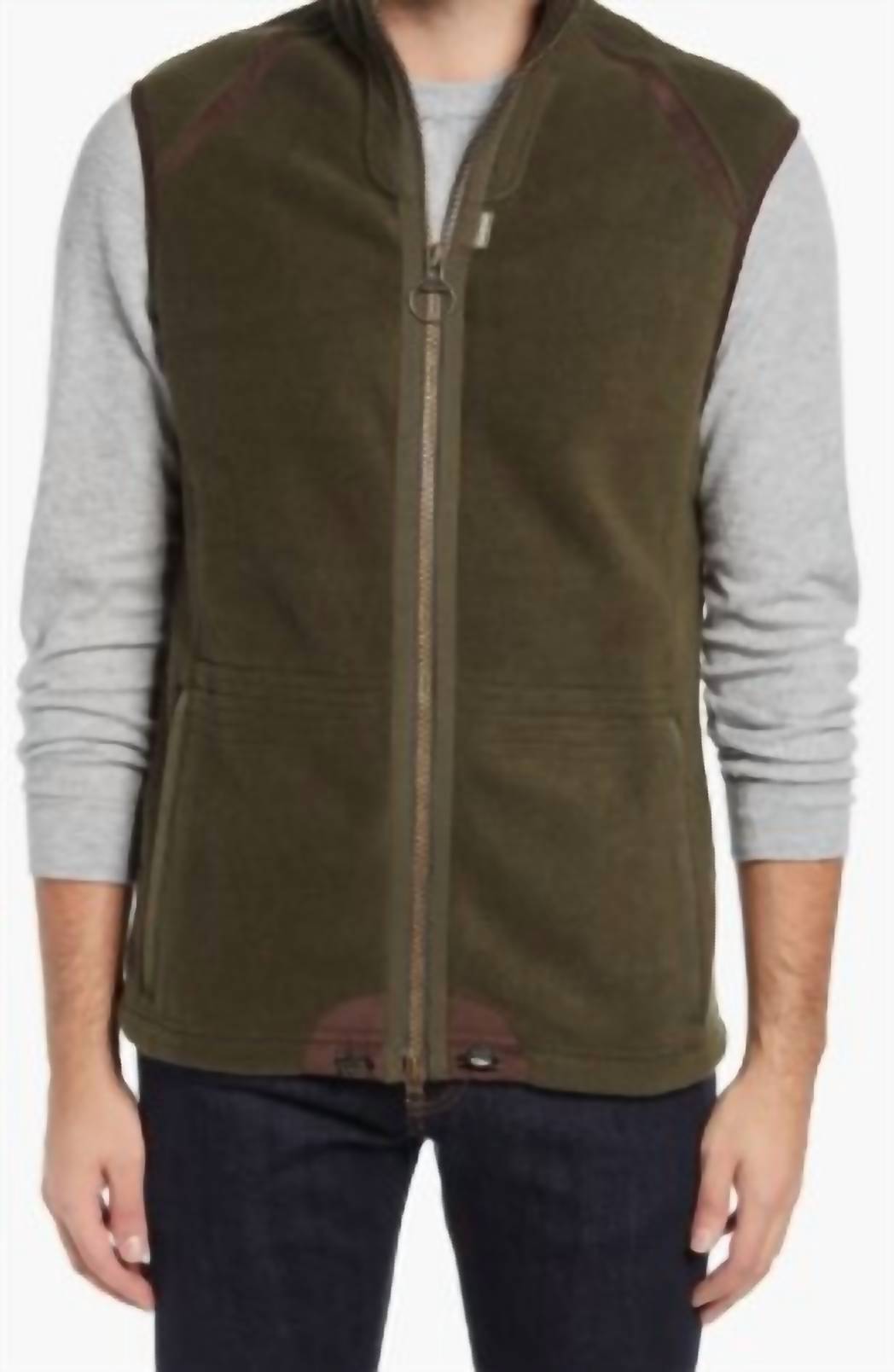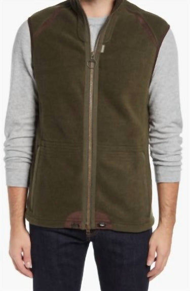 Elevate your wardrobe with the Barbour Fleece Zip Vest, a stylish choice in an attractive olive hue. This sleeveless vest is trimmed with 100% leather for a touch of luxury and features a collar neckline. The textured design adds depth, while the full zip closure ensures ease of wear. Suitable for men, this versatile piece comes with pockets, providing practicality and elegance.