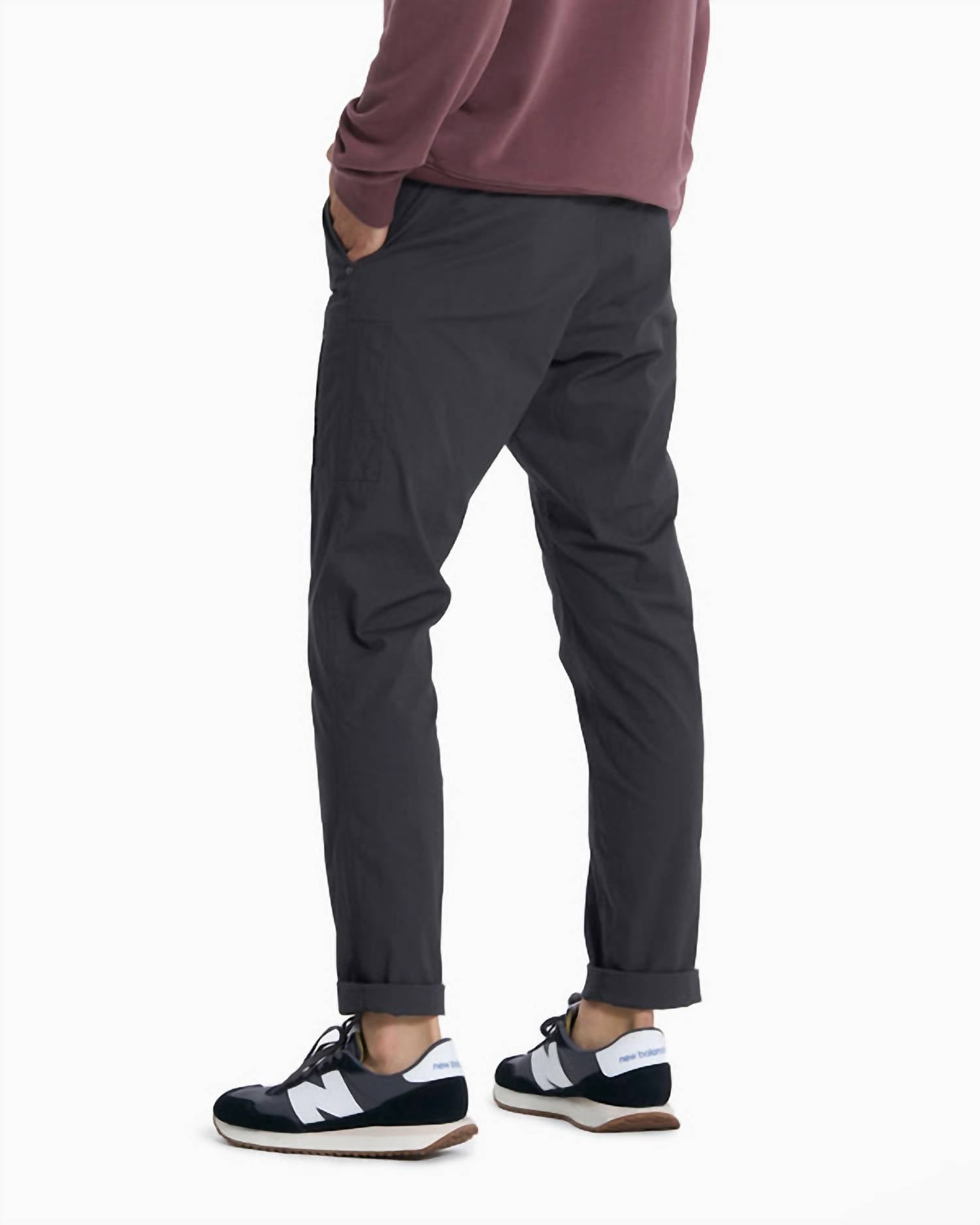 Introducing the Vuori Ripstop Climber Pant, your go-to choice for adventure and daily wear. These men's chinos are crafted from a cotton blend in a solid charcoal hue, featuring a 33" inseam and slim fit with a tapered leg for a modern look. Designed for ease, these pants offer a pull-on closure and pockets, ensuring practical style. Easy care with machine wash and tumble dry instructions.