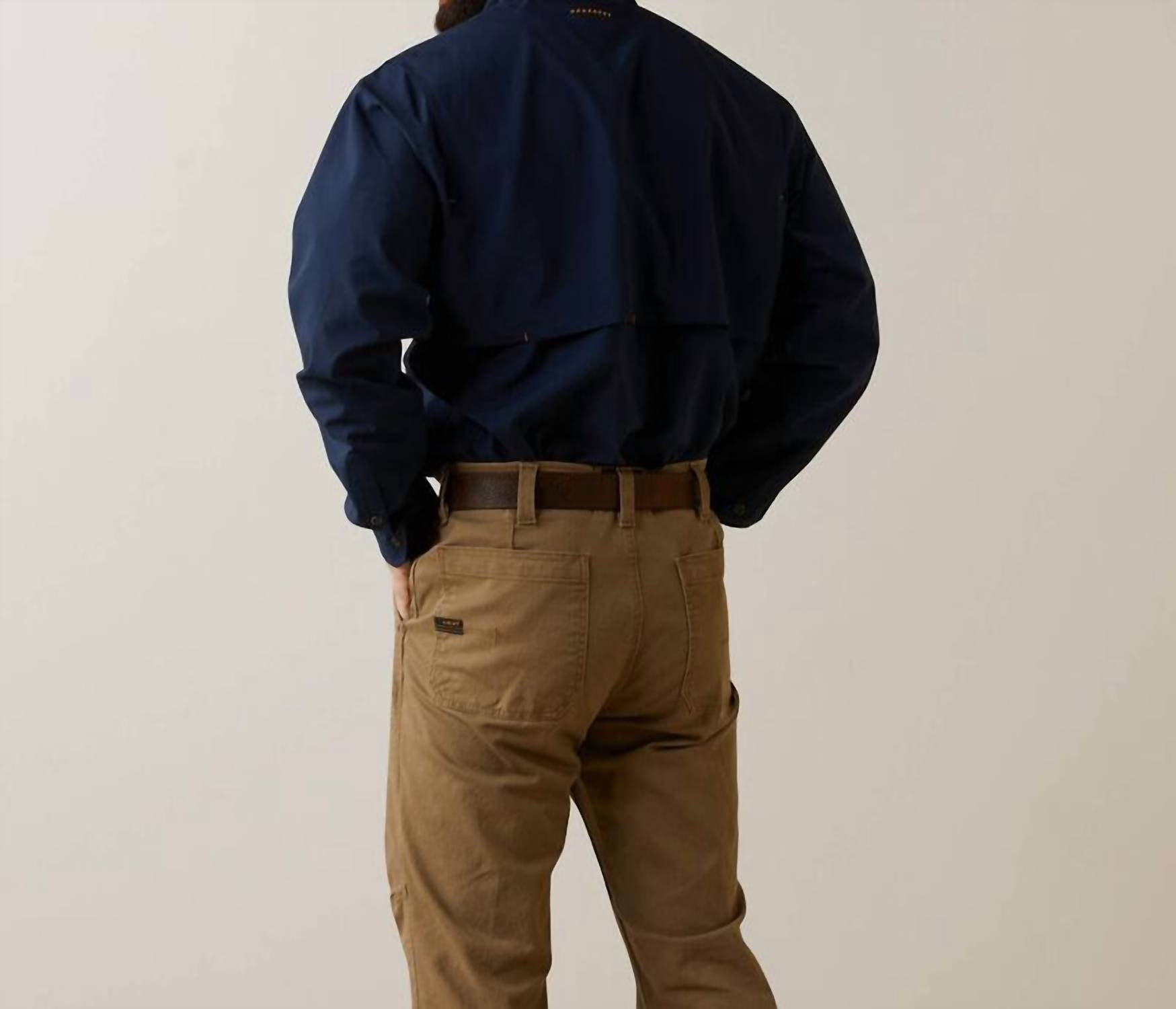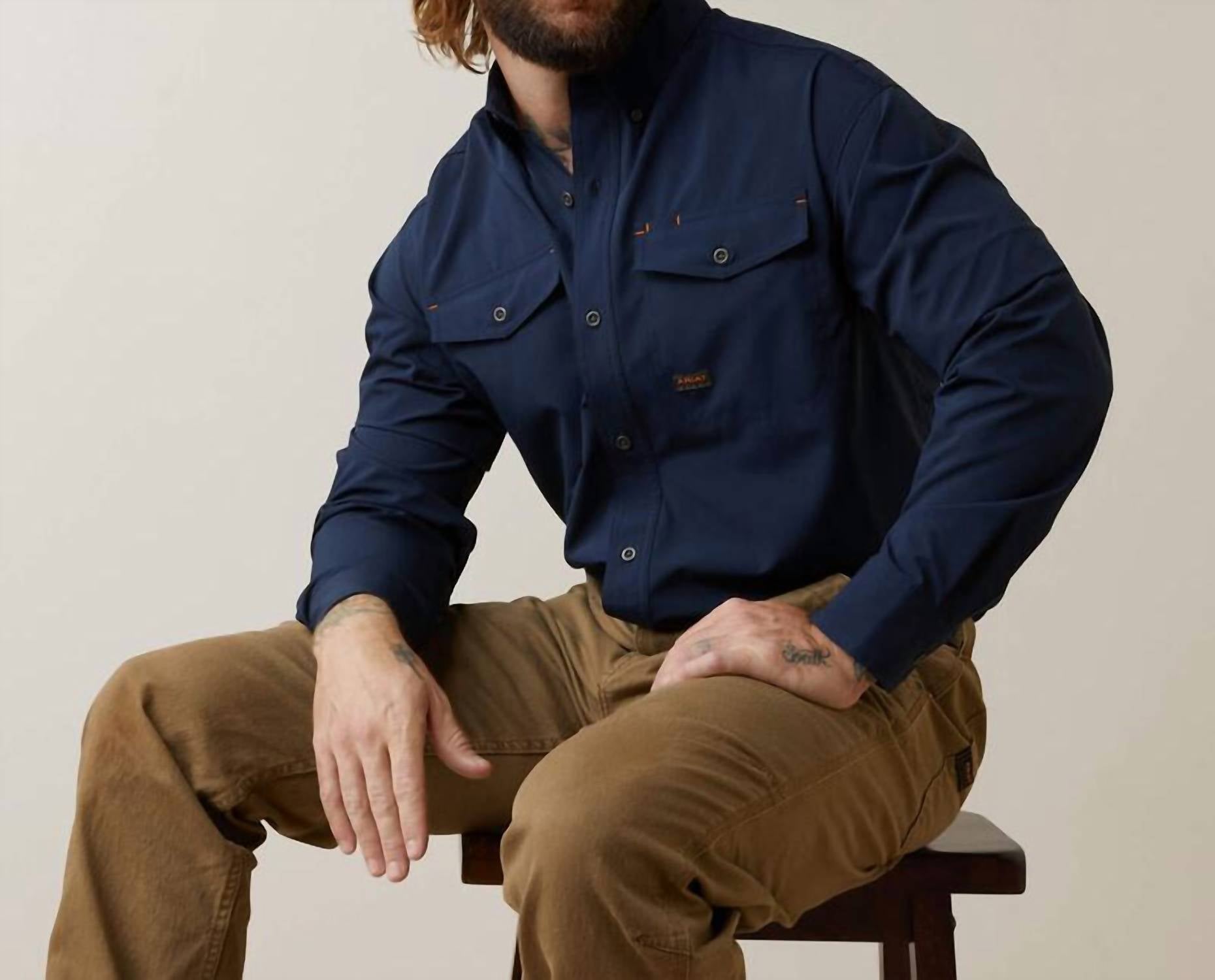 The Rebar Durastretch Work Shirt I by ARIAT is crafted for durability and comfort, making it ideal for work and leisure. This men's navy shirt features long sleeves, is made from polyester, and includes button-down chest pockets and collar for a classic look. Designed with a button closure, the shirt also incorporates advanced technologies like Greater Arm Mobility™ and VentTEK™ for enhanced movement and airflow, as well as built-in Sun Protection Fabric™. This minimalist piece, with its drop tail hem and indestructible metal buttons, is your perfect summer wardrobe staple.