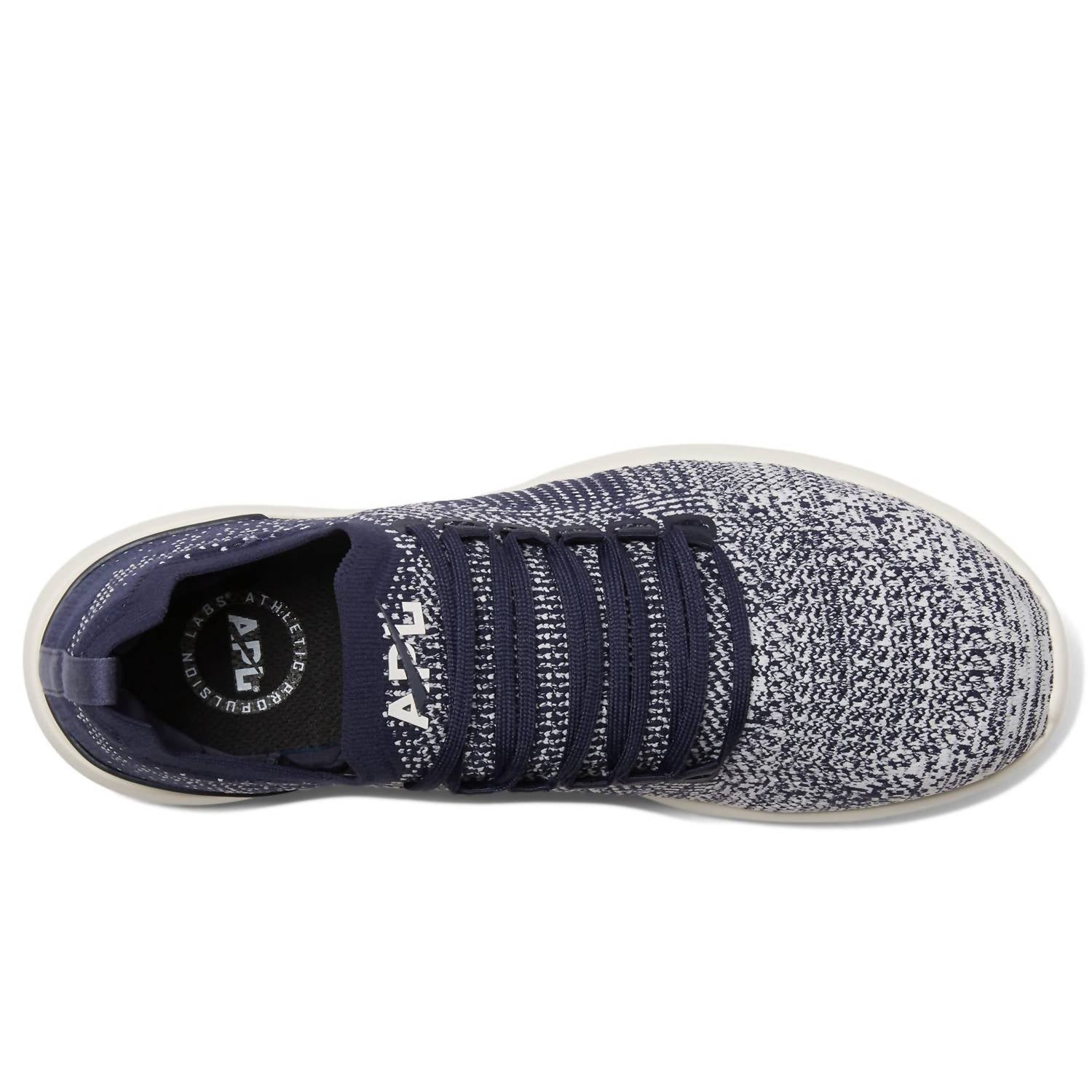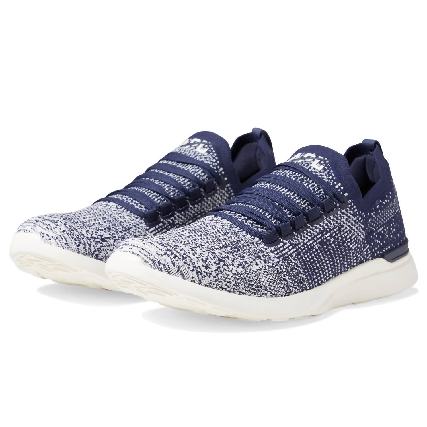 Experience the perfect blend of style and function with the Men's Techloom Breeze Running Sneakers by APL. Designed for athleisure enthusiasts, these sneakers come in a striking Navy/Ivory/Ombre and Blue palette. Featuring a round toe and flat heel, they're crafted for summer workouts and fitness occasions. Elevate your athletic wardrobe with this versatile footwear designed for both performance and fashion-forward appeal.