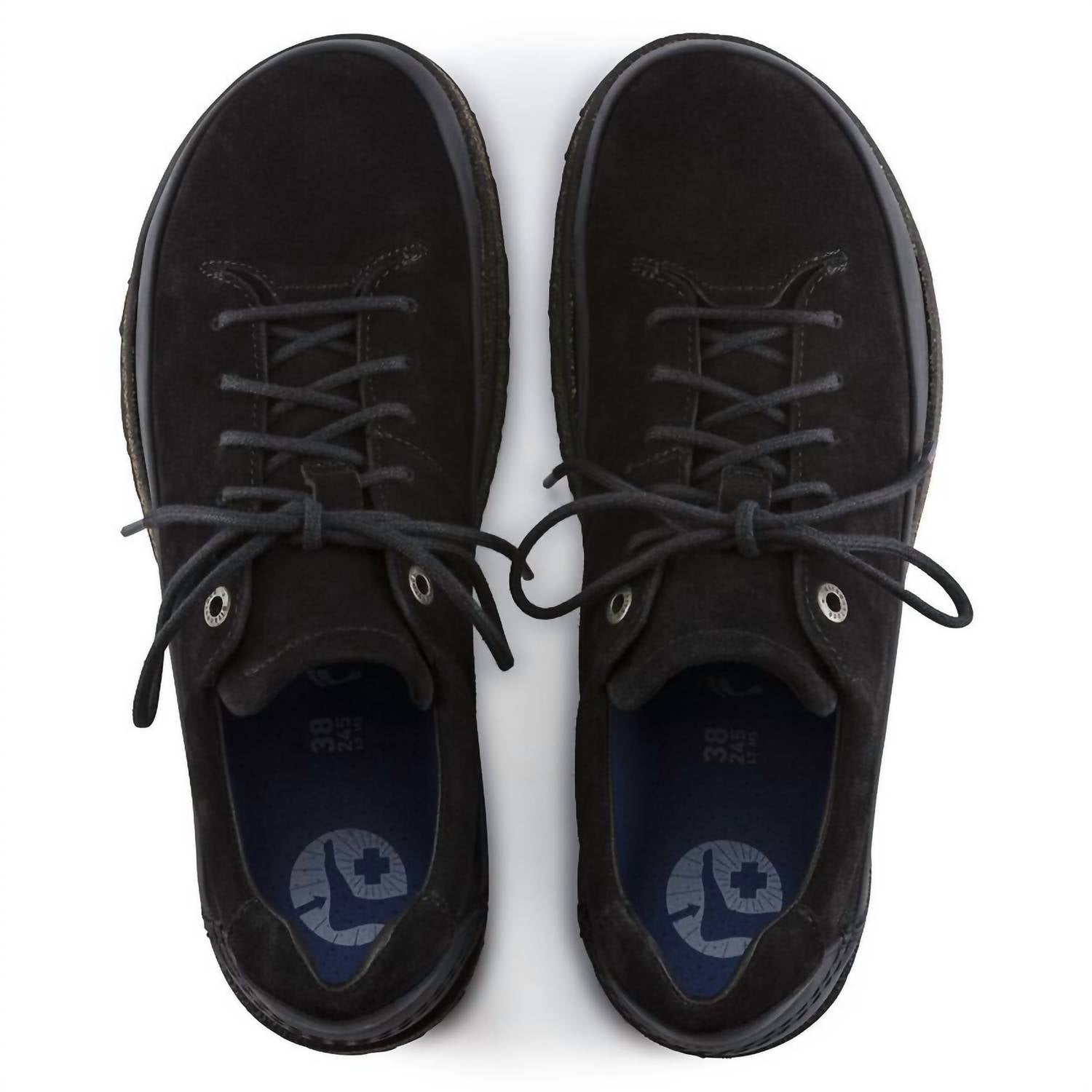 The Honnef sneaker is designed for active days, built around the innovative Deep Blue footbed with four layers of comfort: a moisture-wicking microfiber liner, supportive cork and jute layers, and a PU base for shock absorption and forefoot cushioning. Its sporty lace-up design makes it a versatile choice for travel or all-day wear, while the soft suede upper is both durable and easy to maintain. Adjustable lacing ensures a customized fit, and the injected rubber outsole provides reliable grip and long-lasting durability.