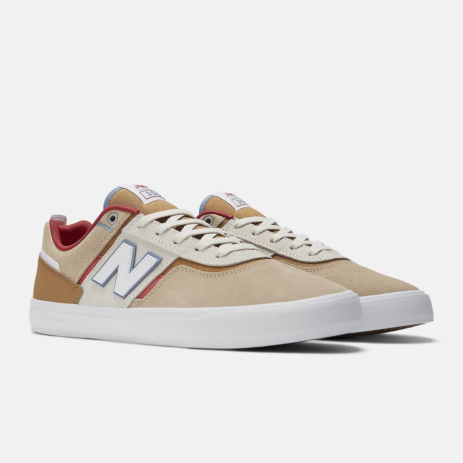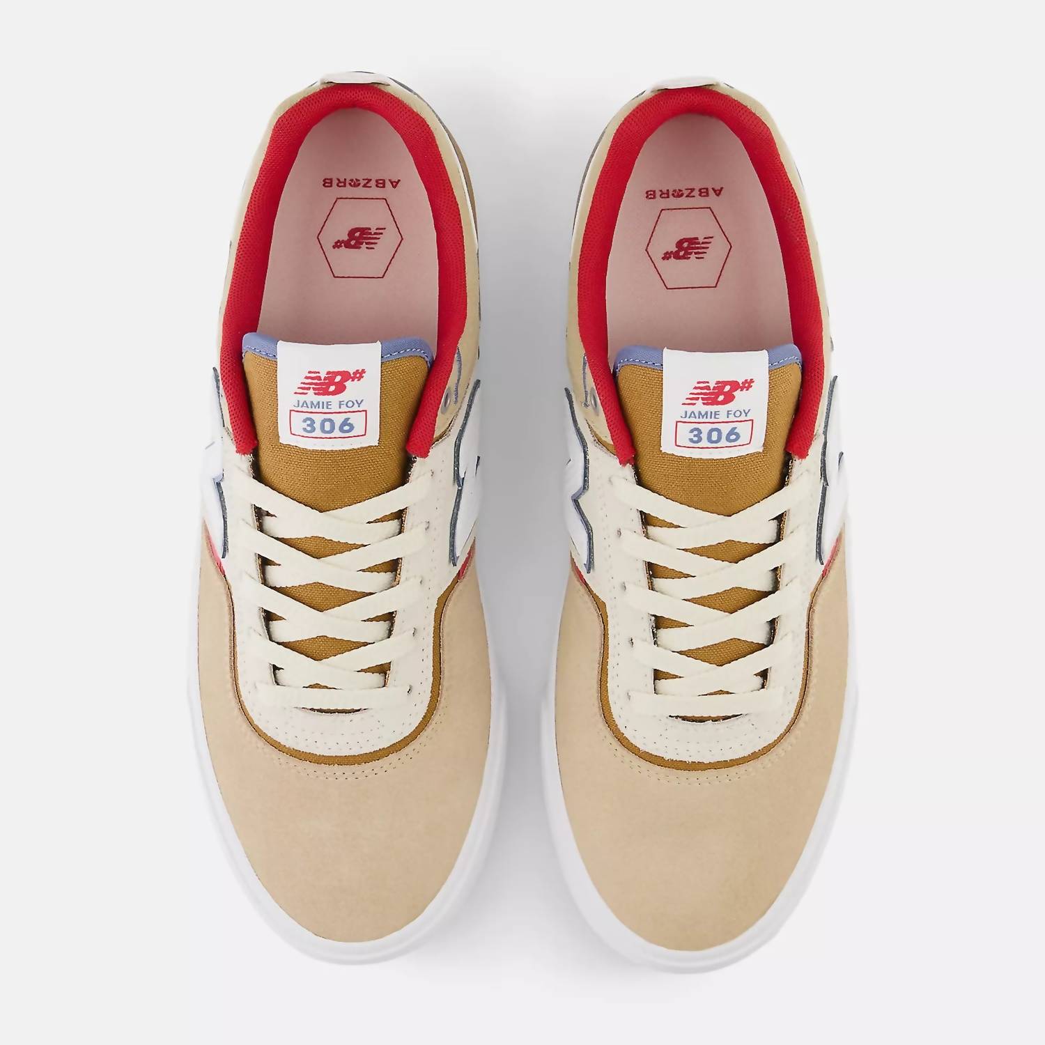 Presenting the Men's Numeric Jamie Foy 306 Skate Shoes by New Balance, designed to handle the rigors of street skateboarding with style. These skate shoes feature a durable rubber underlay, complemented by a suede and synthetic mesh upper in a striking Tan with White/Red/Blue colorway for breathability and comfort. The slip-on construction ensures easy wear, while the low-profile vulcanized outsole enhances board feel. Custom molded EVA insoles provide exceptional comfort, making them a perfect choice for dedicated skaters.