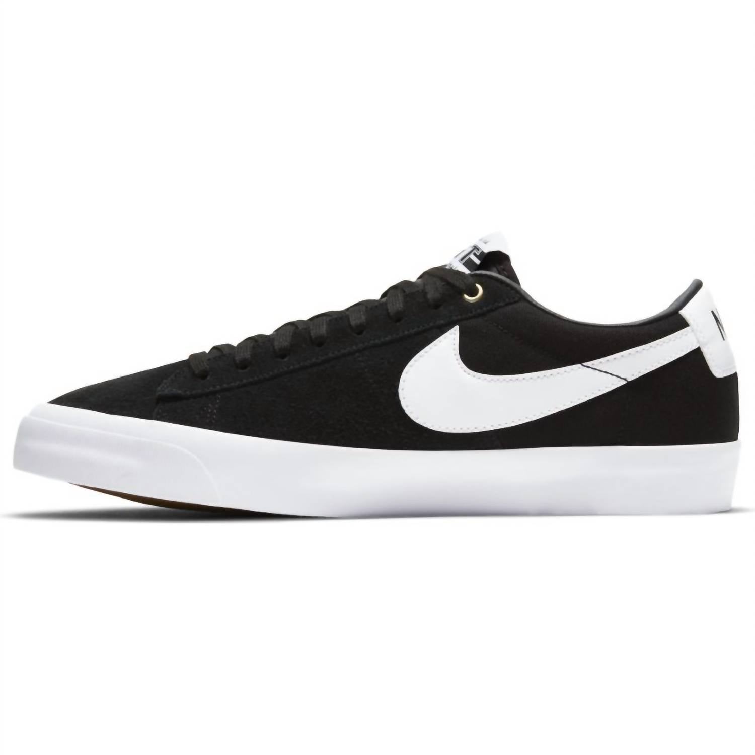 Step up your skate style with the Men's SB Blazer Low Pro GT Skate Shoes by NIKE, crafted in a timeless black and white colorway. These skate shoes feature a durable suede upper and a flexible vulcanized construction for that sought-after broken-in feel. Designed with higher taping between the midsole and upper, they offer exceptional durability with a round toe shape. Perfect for streetwear enthusiasts, these sneakers are ideal for spring vacation occasions.