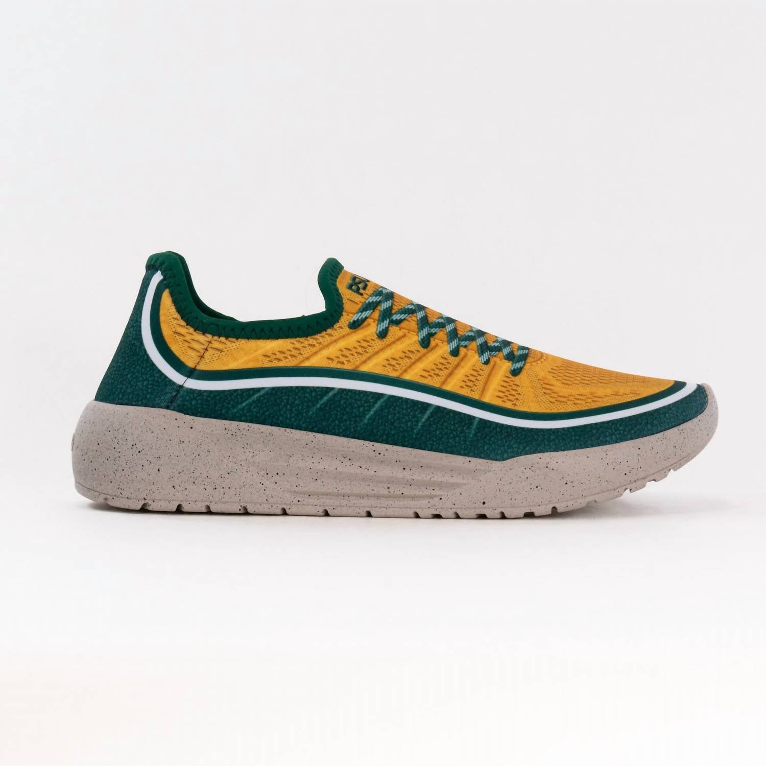 Introducing the Men's Court Sneaker by PSUDO, an athleisure staple in vibrant Green and Gold perfect for showcasing team spirit. Designed with a "Waste-Free Lace-Free" slip-on style, these sneakers offer breathable, sweat-wicking comfort, and anatomically correct arch support. The innovative slip-on design includes an anti-microbial insole and is made for both socked and sockless wear. Crafted for sustainability without sacrificing American-made quality, these sneakers are machine washable—remove the insole to hand wash separately, wash in cold water, and air dry for a fresh look year-round.