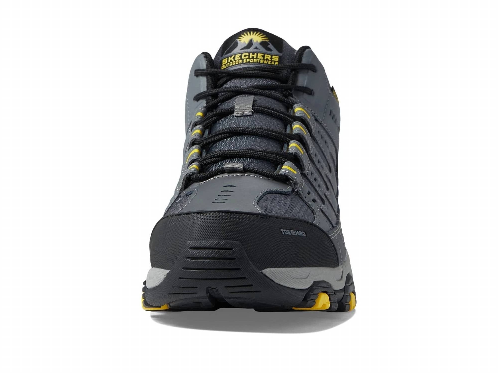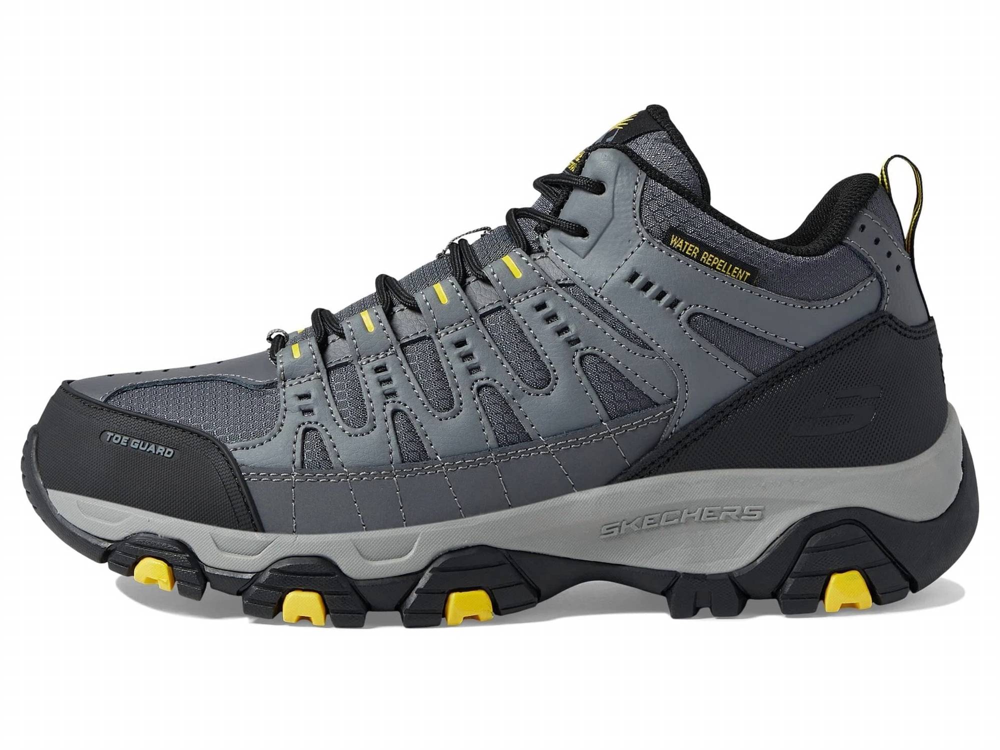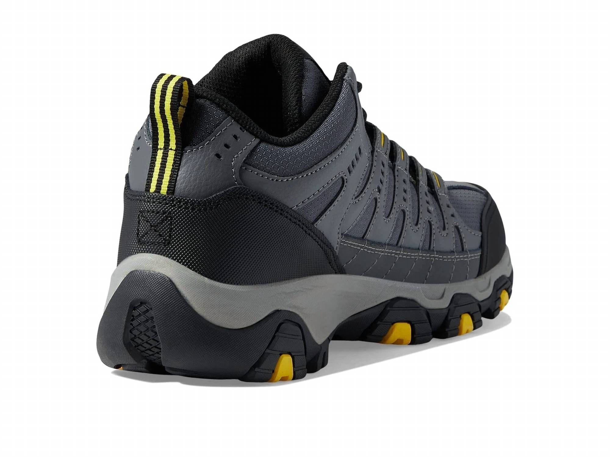 Step up your trail game with the Men's Terrabite Ravlin Sneakers by Skechers, crafted from a combination of leather, synthetic, and mesh to provide both style and durability in a sleek charcoal hue. This outdoor trail hiker features a mid-top design and a high-traction flexible outsole, perfect for adventure seekers. Experience unparalleled comfort with the Skechers Air-Cooled Memory Foam insole while enjoying resistance to water and stains, thanks to the 3M Scotchgard treatment. Highlighted by a 1.5-inch heel and the signature Skechers logo detail, these sneakers are a go-to for streetwear-savvy individuals.