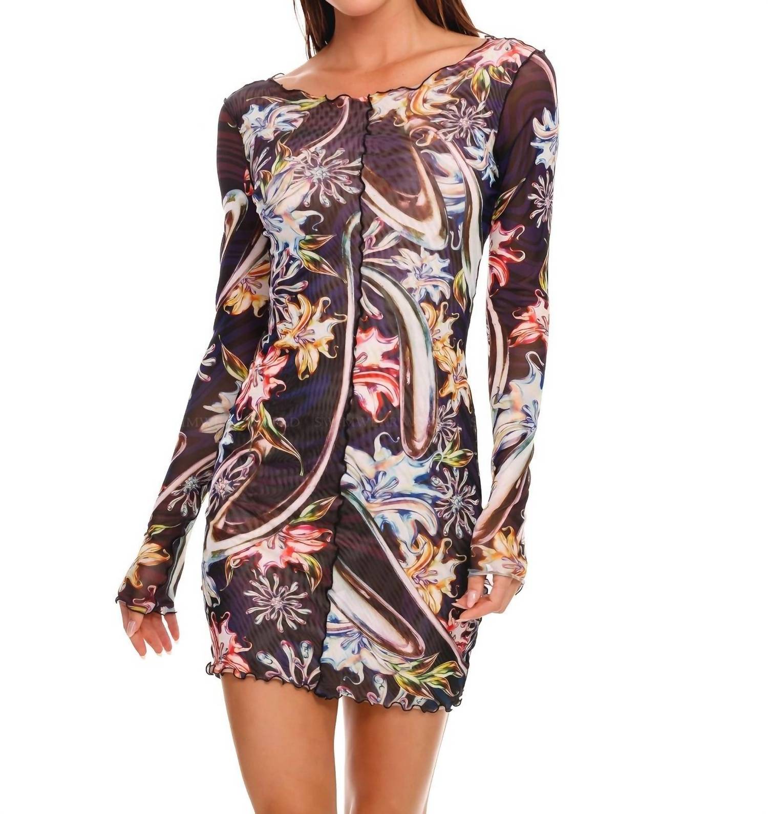 Elevate your wardrobe with the Hadley Mesh Mini Dress by AGUA BENDITA, a standout piece in a vibrant multi-color pattern. This sensational mini dress features long sleeves and a scoopneck, crafted from breathable mesh fabric for a comfortable fit. Composition: 92% Polyester, 8% Spandex. Closure: Pull on. Care: Hand wash. Ideal for engagement occasions with its playful ruffle trim and bodycon silhouette that seamlessly transitions from day to night.