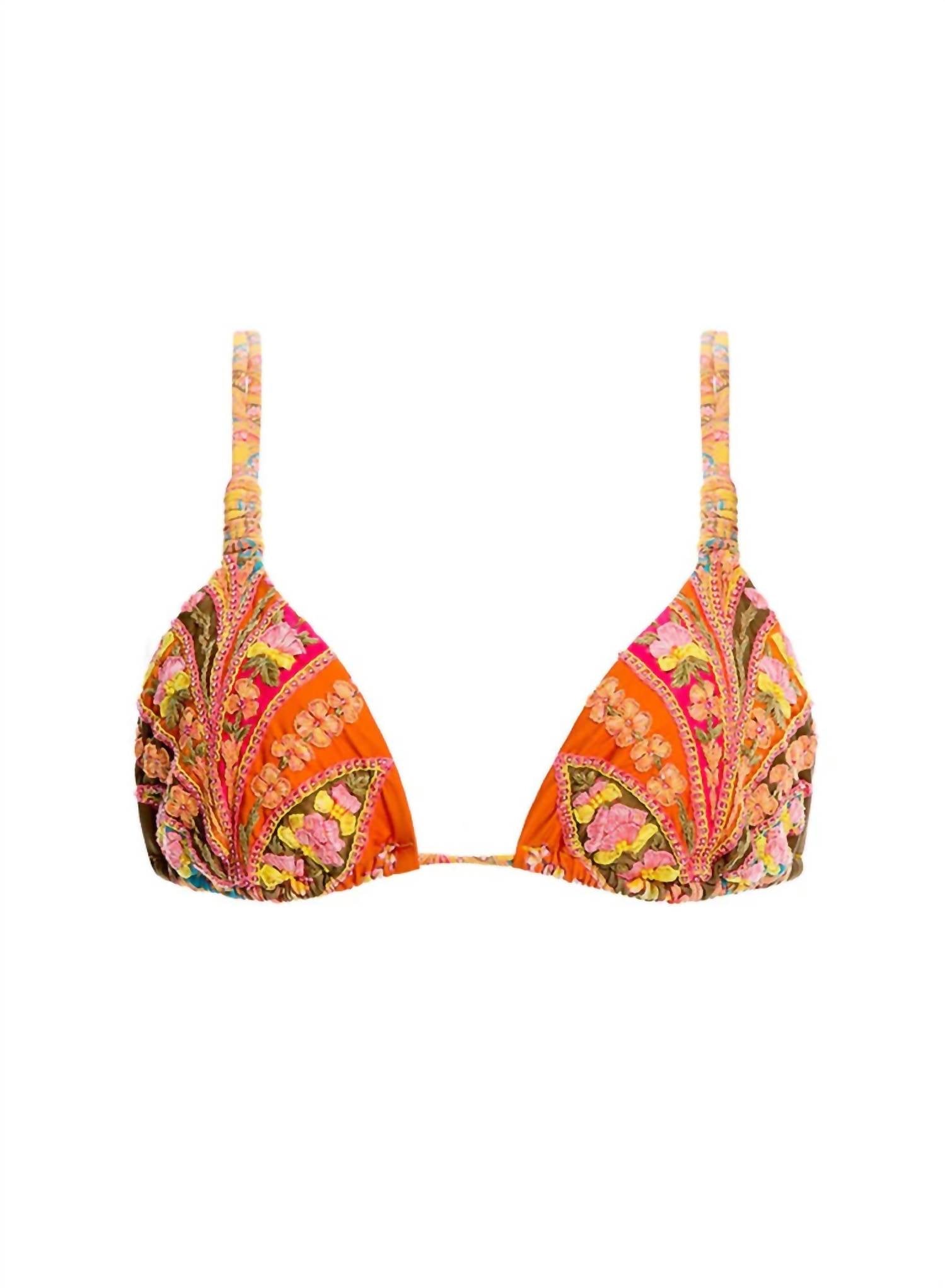 Elevate your beach attire in vibrant orange, adorned with exquisite hand-embroidered floral patterns. Boho chic swim top features triangle style with braided straps for a unique touch and removable pads for personalized comfort. Crafted from eco-friendly materials, consisting of 81% recycled polyester and 19% elastane. Made in Colombia, reflecting high-quality craftsmanship. Ensure longevity by following care instructions of hand washing and hanging to dry, maintaining the vibrant appeal of this essential bikinis piece. Model is wearing size small.