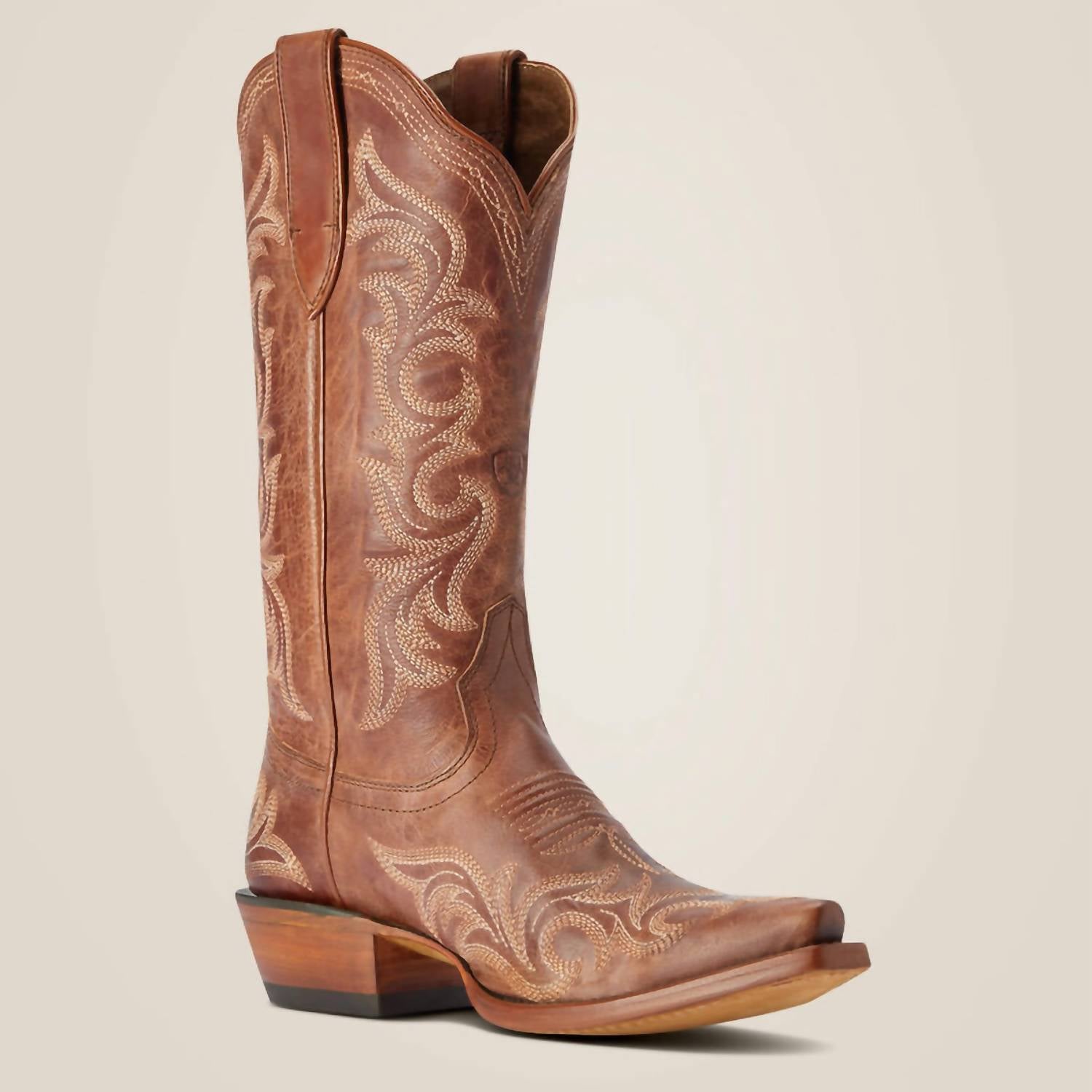 Introducing the Women's Hazen Western Boot by ARIAT, perfect for the Fall season with a whiskey barrel finish. This medium-width boot features a comfortable 12" shaft height and a 1.5" block heel, embodying a nod to traditional Western style with an elegant X toe and five-row stitch pattern. Crafted from full-grain leather and vegetable-tanned leather sole, the boot includes ATS® technology for ergonomic support, ideal for music festivals or any casual occasion. The boot is resolable with a Goodyear leather welt construction, ensuring durability and long-lasting wear.
