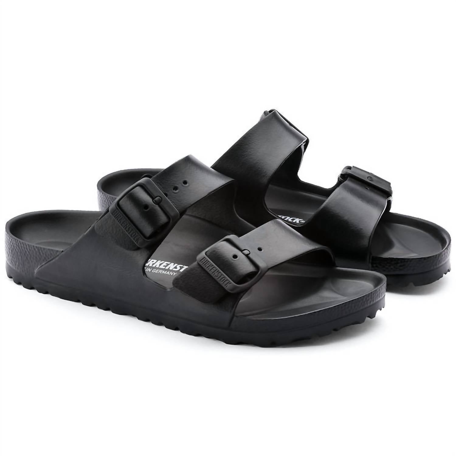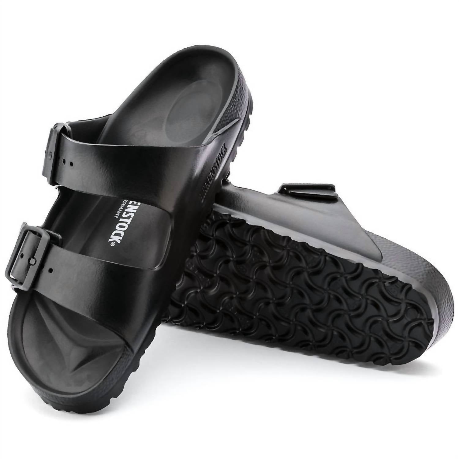 The Men's Arizona Essentials EVA by BIRKENSTOCK is your ultimate warm-weather companion in a sleek black color, ideal for every casual occasion. Crafted from a single piece of water-friendly EVA, this sandal offers a lightweight and flexible design, perfect for everything from poolside lounging to post-workout comfort. Featuring a contoured footbed for legendary support and two adjustable straps with pin buckles, it promises both comfort and style. Proudly made in Germany, these sandals feature a narrow width and a round toe shape, embodying the essence of Boho Chic style.
