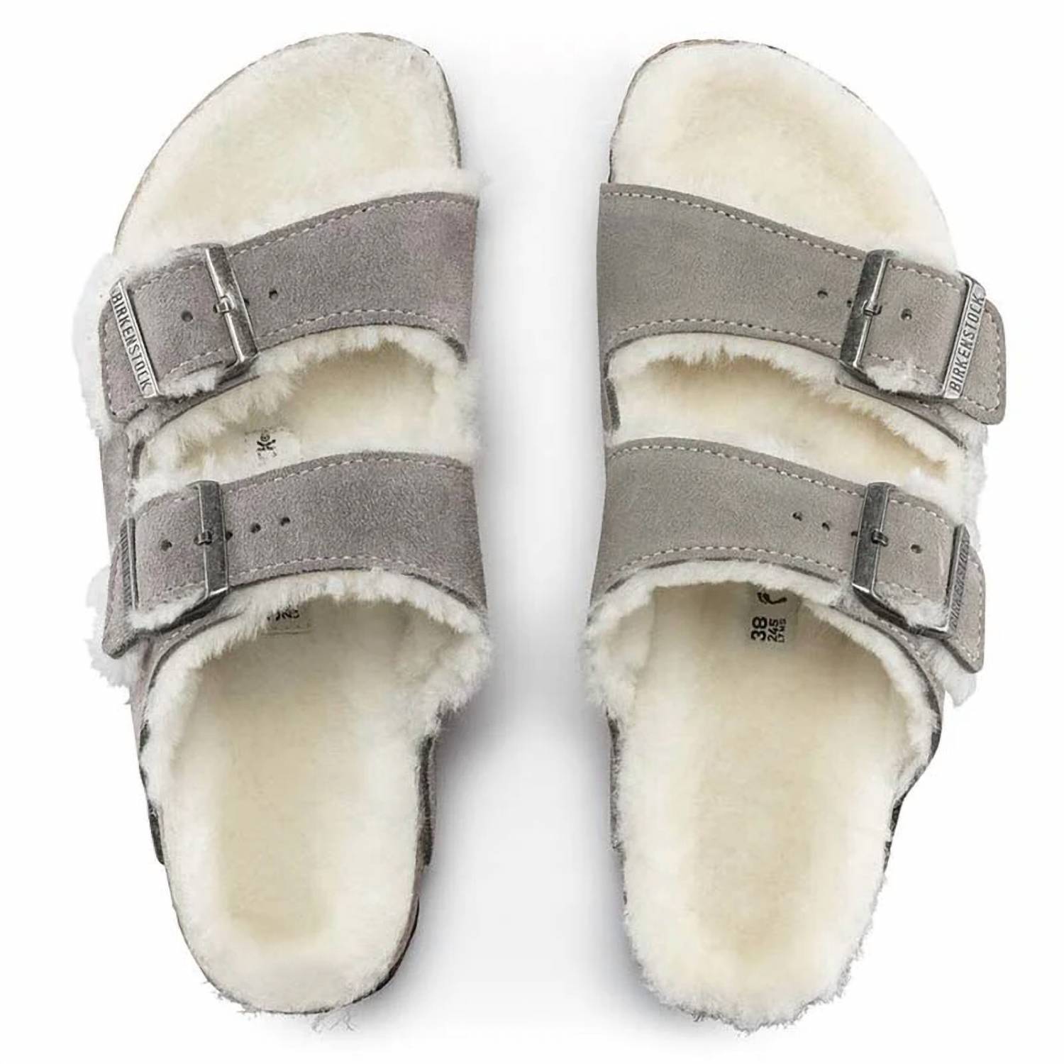 Classic suede lends a velvety feel that continues on the inside. The style is fully lined in genuine shearling, right down to the original contoured footbed. A soft, supportive landing every time. Designed with two shearling-lined straps with metal pin buckles. Made in Germany.