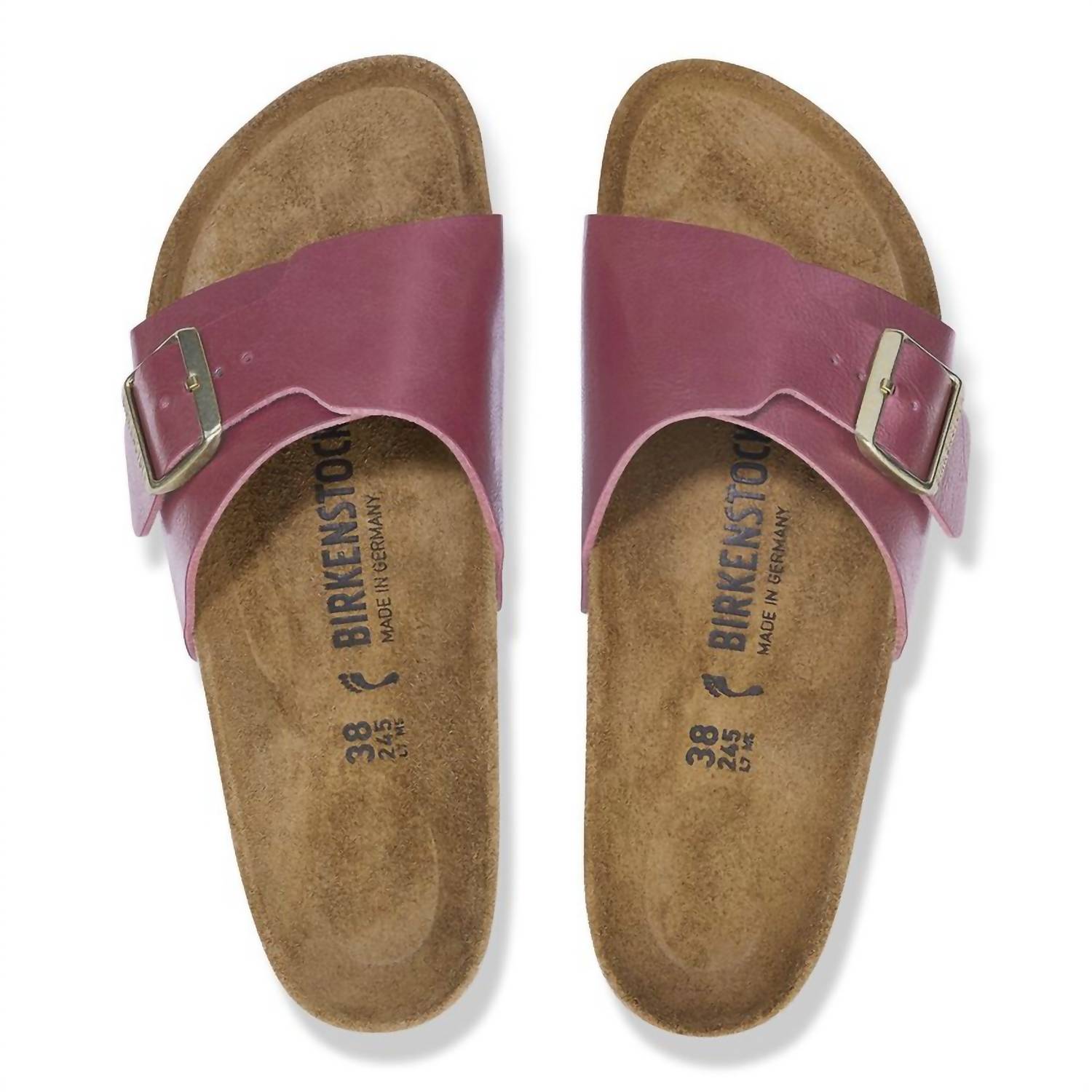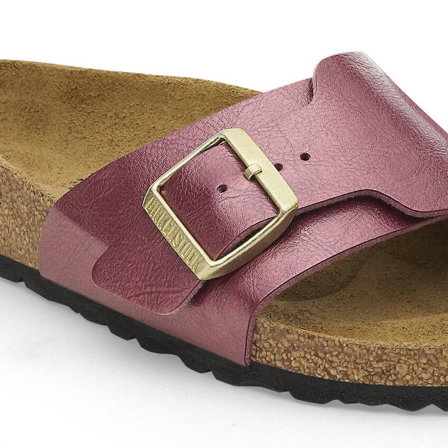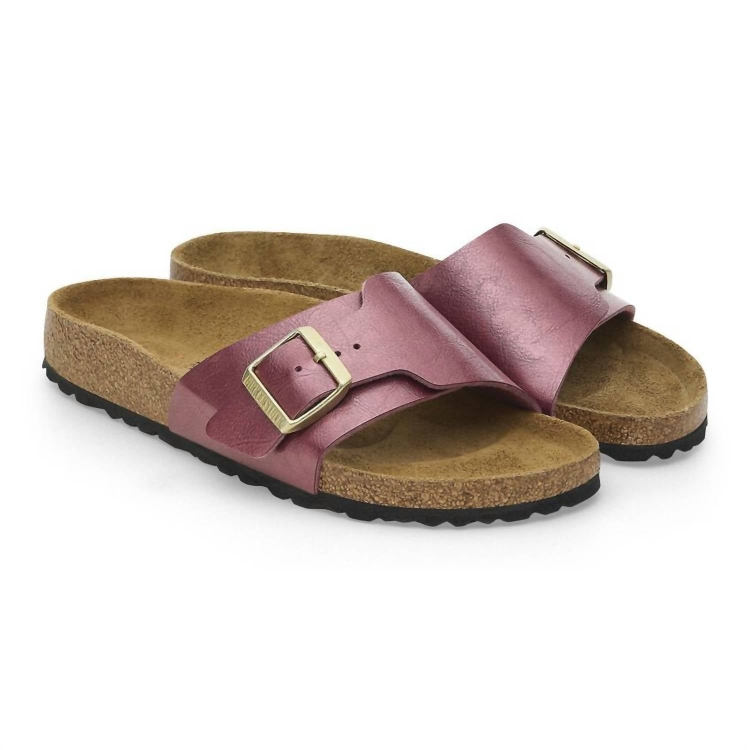 Explore effortless style with the BIRKENSTOCK Women's Catalina Sandal in Graceful Berry Crush, perfect for spring and travel occasions. Featuring an elegant strap with an adjustable metal pin buckle, this sandal offers a modern flair with its silky sheen finish. Designed with a skin-friendly Birko-Flor® upper, suede footbed lining, and durable cork-latex footbed, it ensures comfort and durability. Made in Germany, the sandal incorporates a flat EVA outsole, ideal for everyday adventures.