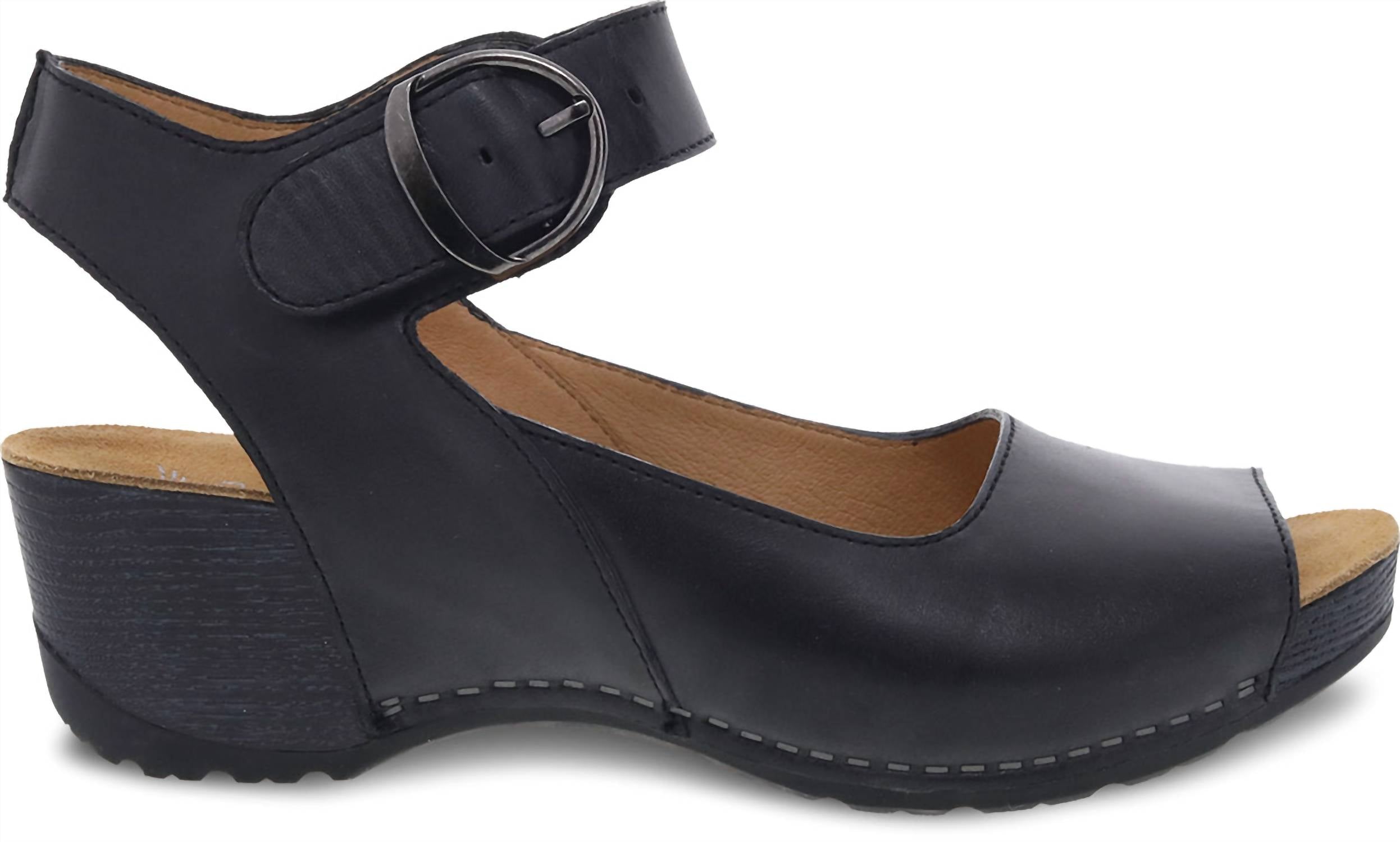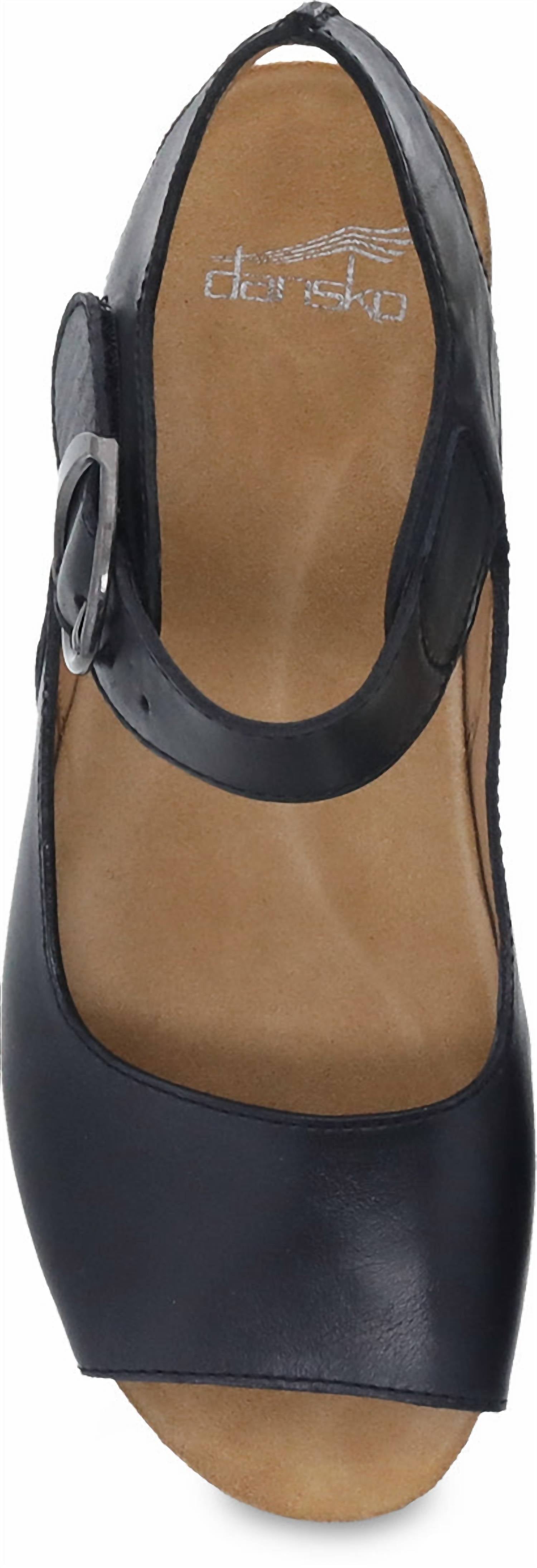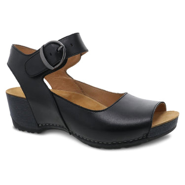 The Dansko Women's Tiana Ankle Strap Sandal in Black is a chic choice for any summer outing, especially during Thanksgiving celebrations. Featuring an open toe design with a wedge heel, this sandal offers a low heel height between 1 1/4" and 2" for enhanced comfort. Crafted from burnished leather uppers and detailed with an ankle strap and a buckle with hook and loop adjustability, it ensures secure and adjustable fit. Equipped with leather linings, a contoured footbed with memory foam, a lightweight PU midsole, and a durable rubber outsole, it delivers all-day comfort and long-lasting wear.