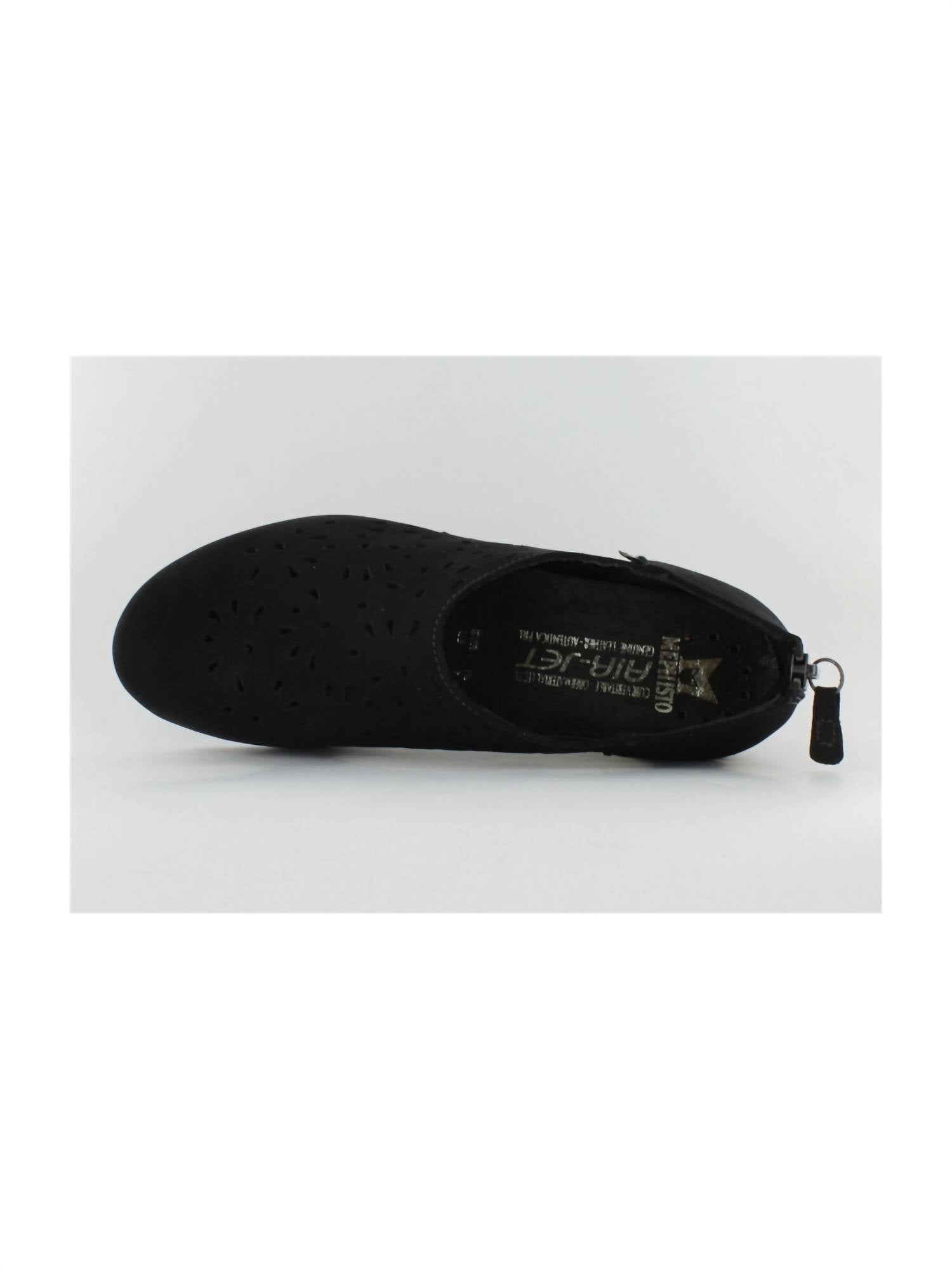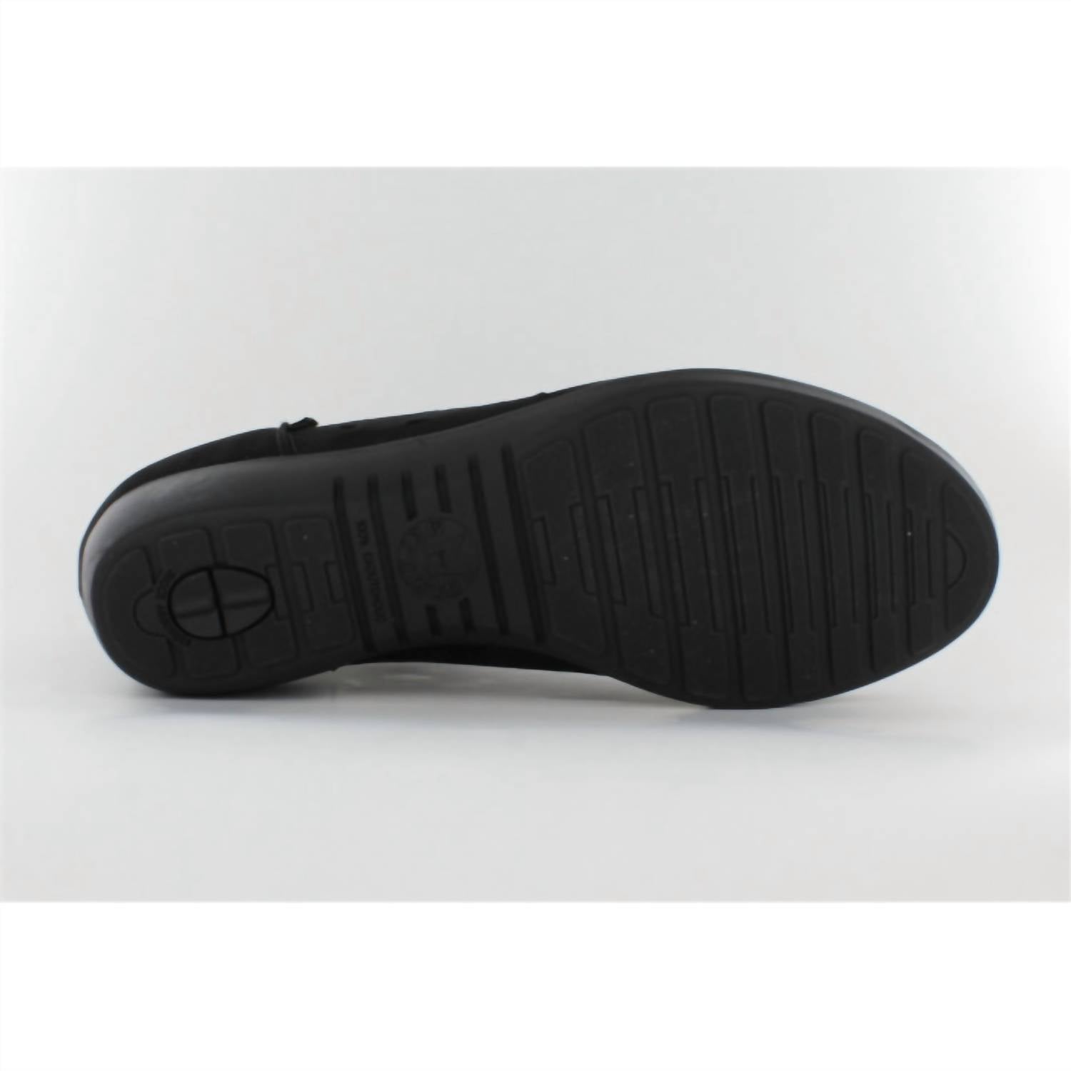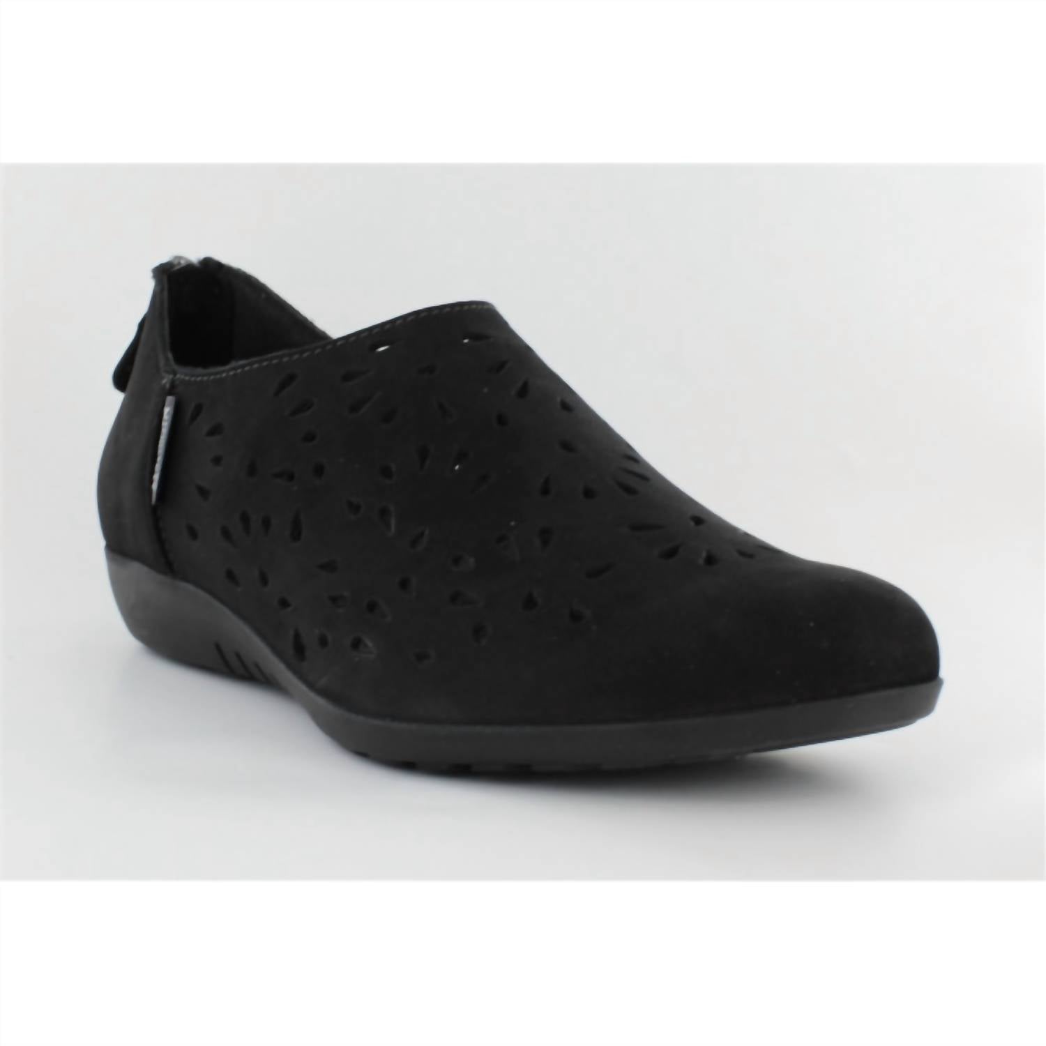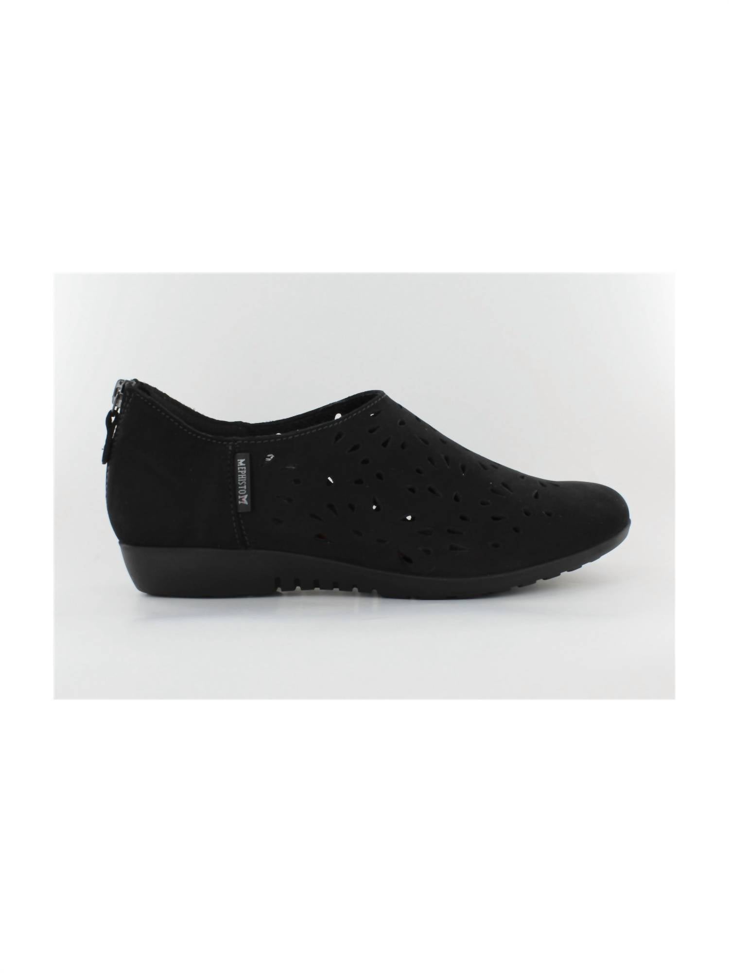 Step into comfort with the Women's Dina Shoes by MEPHISTO, crafted in black faux leather for a chic minimalist style. These flats feature an almond toe design and a convenient zipper closure, perfect for easy wear during vacation-ready spring outings. The teardrop-shaped perforations add a touch of elegance, while the removable sole allows for orthotic customization. Ideal for women seeking both style and practicality, these shoes offer all-day comfort with their flat heel under 1 inch.