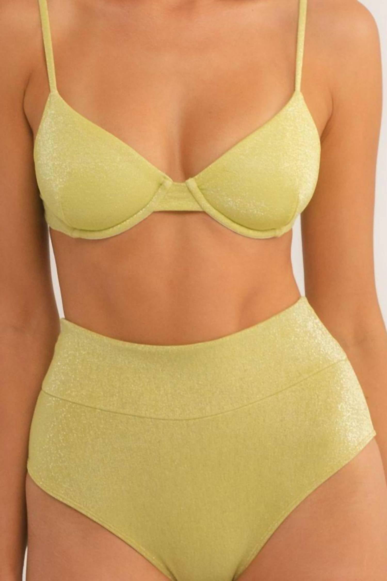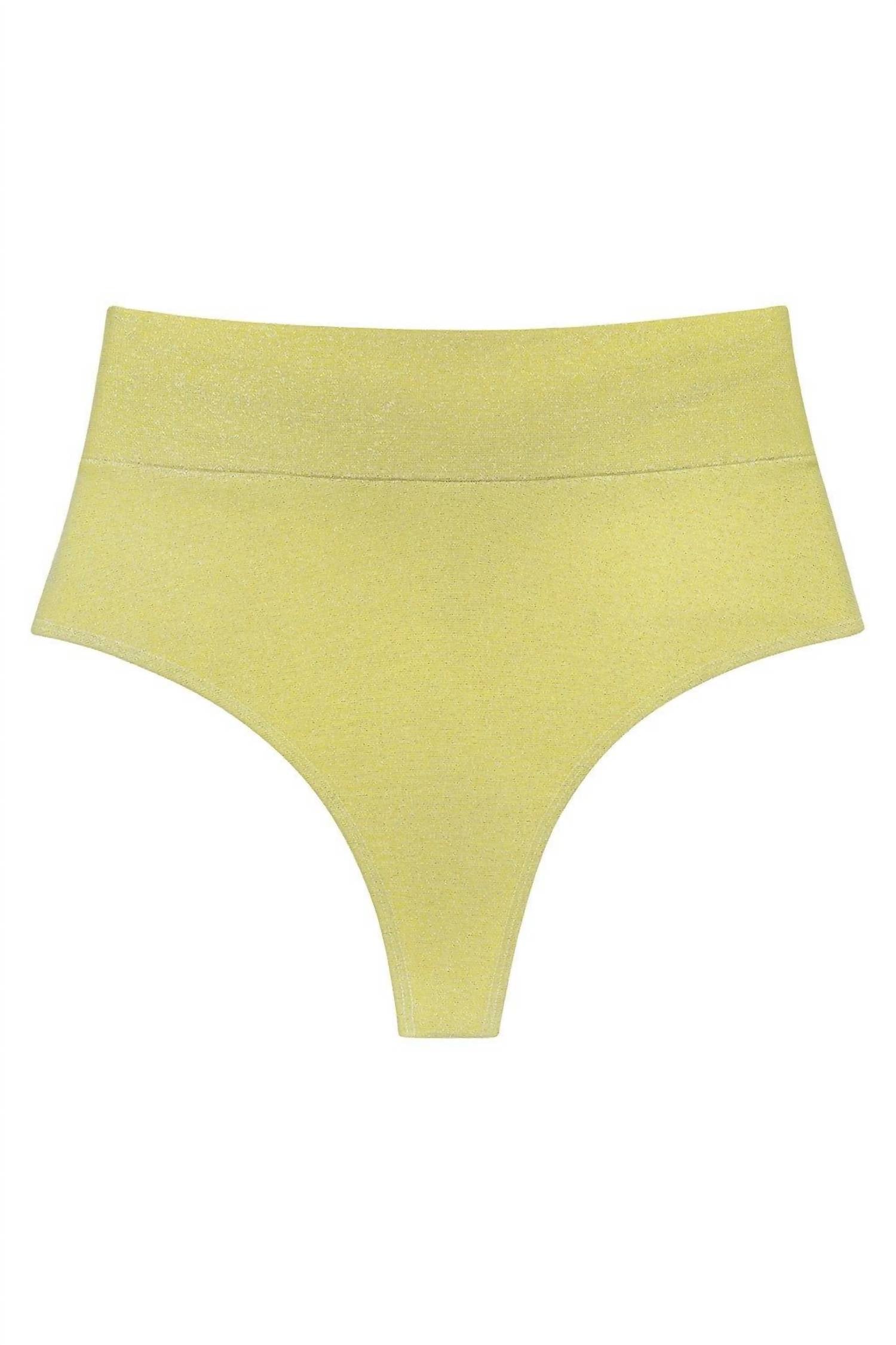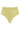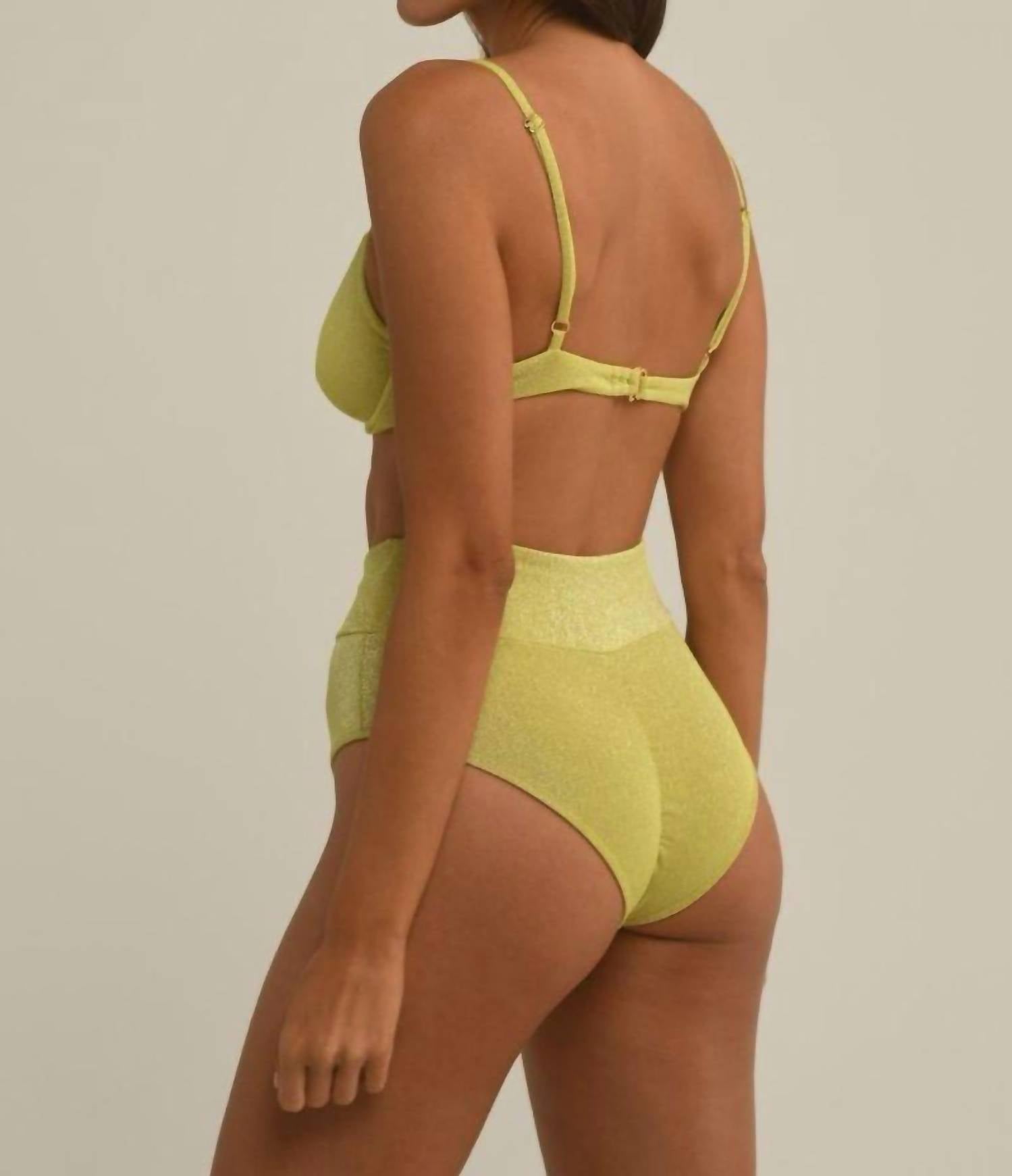 Montce presents the Added Coverage High Rise Bikini Bottom in a vibrant Limon Sparkle, designed to accentuate an hourglass silhouette. This solid high-waisted swim bottom offers full front and moderate back coverage, featuring a thick and compressive contouring waistband with ruched detailing to enhance your shape. Ideal for a chic beach day, its cheeky fit promises an additional two inches of coverage for confidence and comfort. Care instructions advise hand washing to maintain its stunning summer-ready shine.
