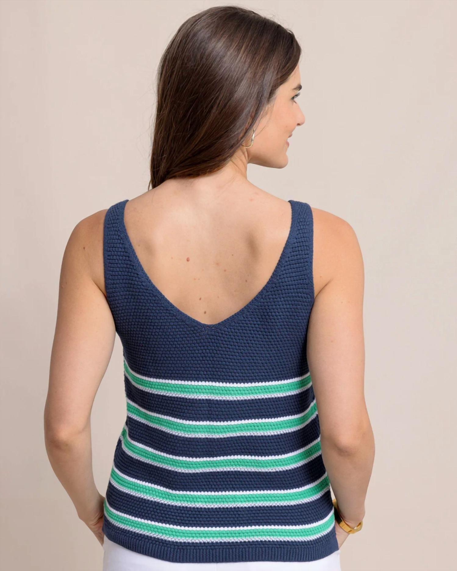 Introducing the Alli Striped Sweater Tank Top by Southern Tide, an essential piece for effortless summer style. This sleeveless tank top, crafted with 100% cotton, offers all-day comfort with its elegant V-neck and side vent detailing. The pull-on closure ensures ease of wear, making it a perfect pick for your vacation wardrobe. Ideal for a boho chic look, this dress blue top is both stylish and low-maintenance.