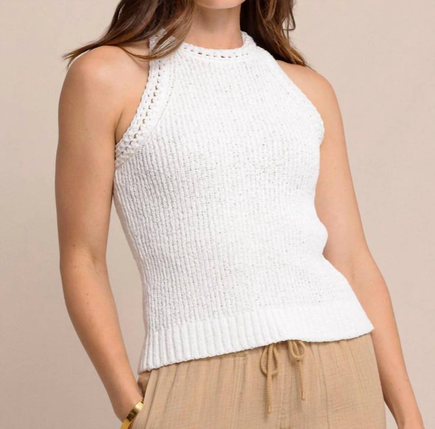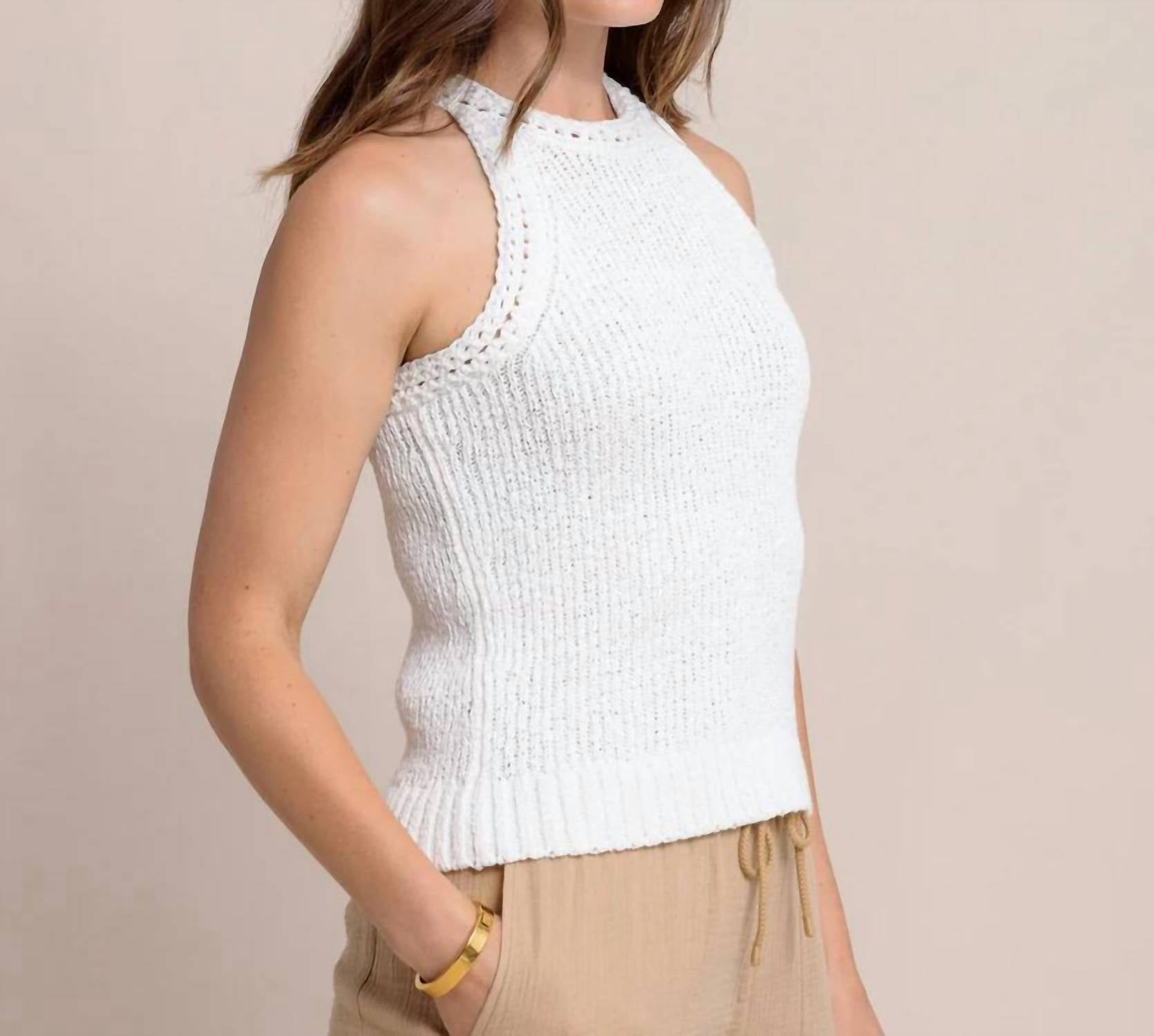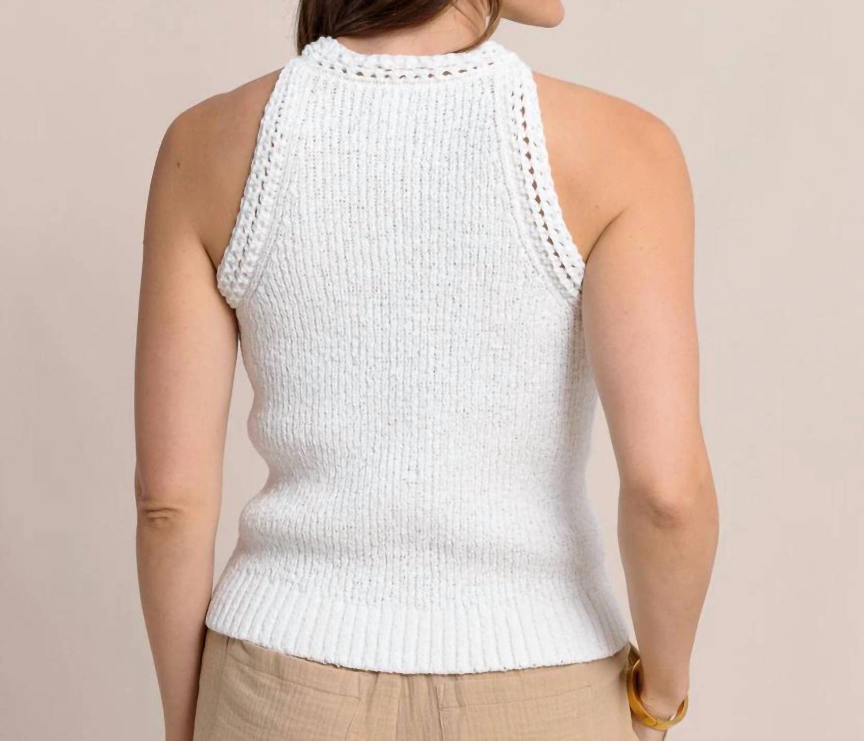 Elevate your spring wardrobe with the Southern Tide Tessa Sweater Tank in Sand White, a sleeveless essential for warm weather. Crafted from a breathable 75% cotton and 25% polyester blend, this tank combines style and comfort. Featuring a halter design with decorative stitching around the armholes and neck and ribbed hem detail. Closure: Pull on. Care: Machine wash, lay flat to dry.