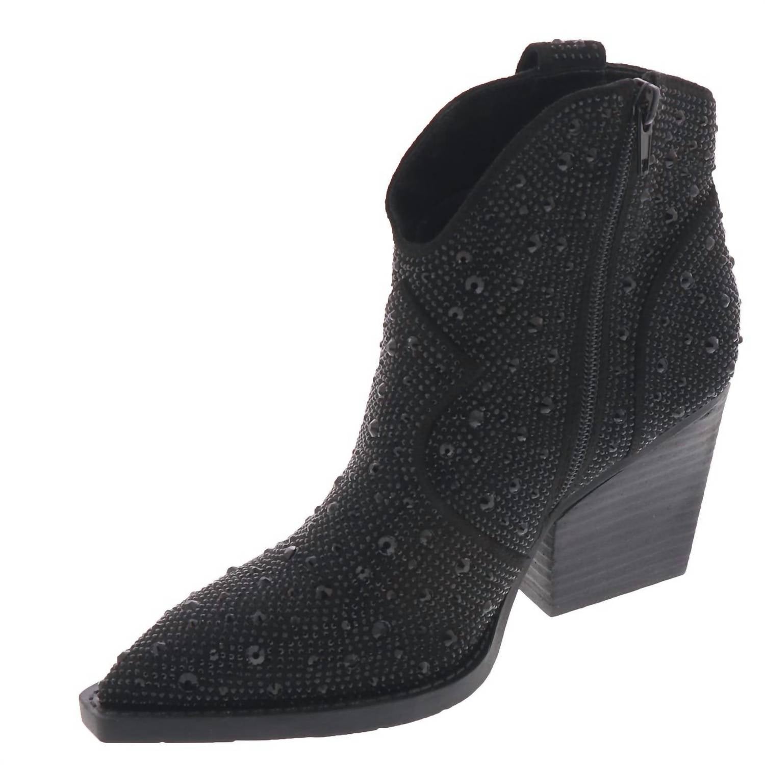 Step up your fashion game with the Very G Women's Austin Leg Up Rhinestone Booties in striking black. These heeled boots feature a chic pointed toe and a 3-inch block heel, complemented by dazzling black rhinestone details. Designed for women with a medium shoe width, they offer an inside zipper for effortless wear. Standing at a total height of 8 inches, these mid-height heels effortlessly combine style and comfort for the adult fashionista.