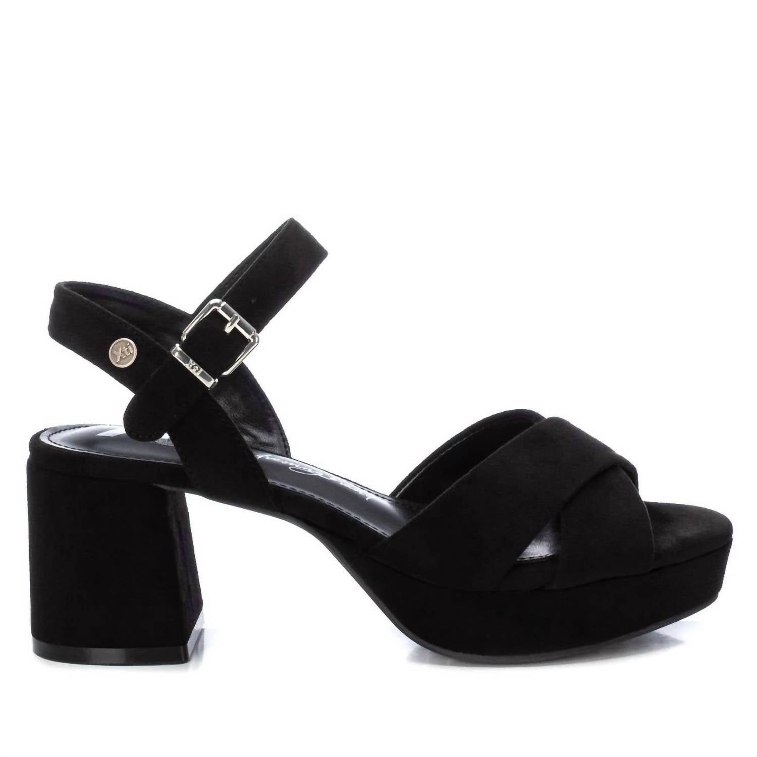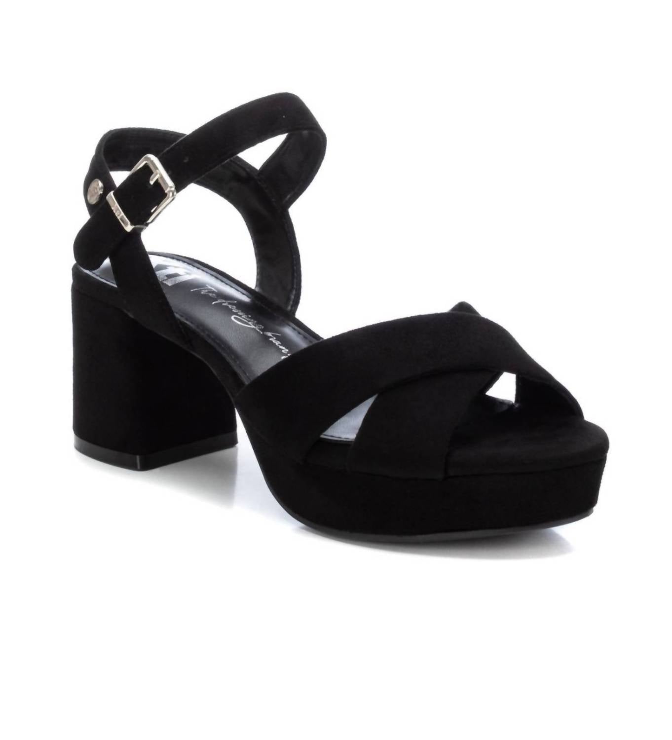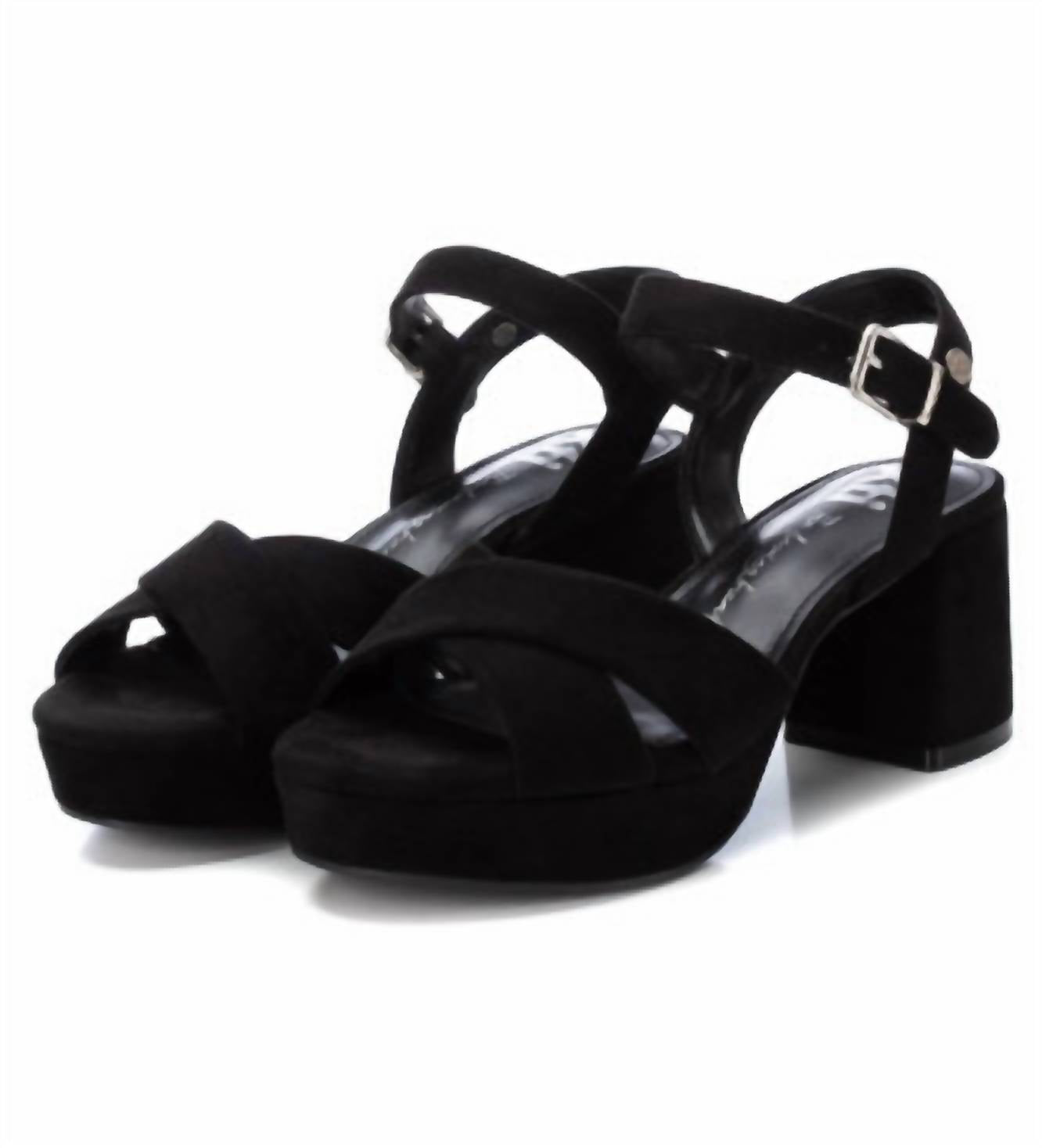 This Heeled Sandal features luxurious suede with a practical buckle fastening for a secure fit. It boasts a 2.75-inch chunky heel and a front platform for stability, along with a non-slip rubber sole. PETA-certified vegan, perfect for both daytime chic and evening glamour.