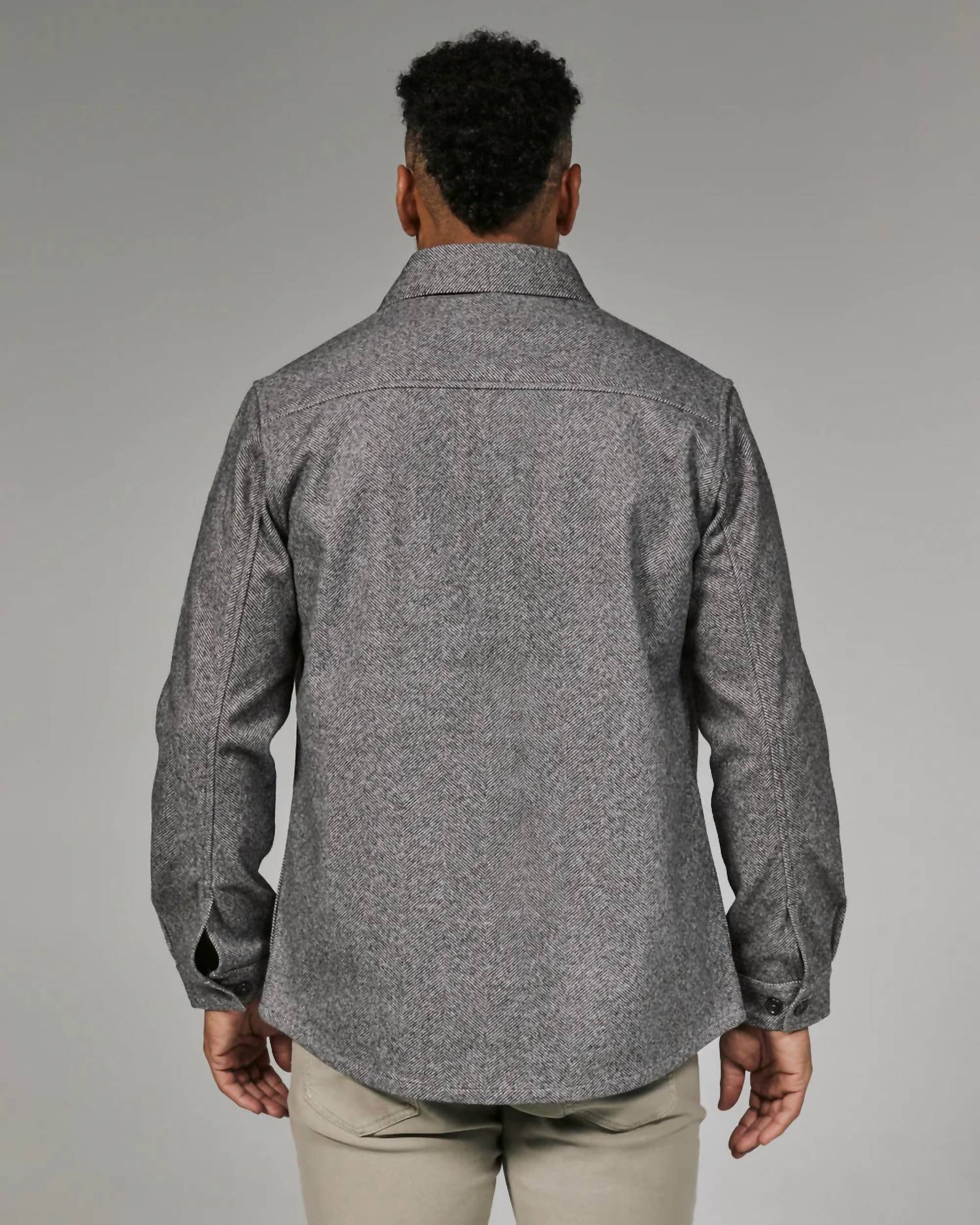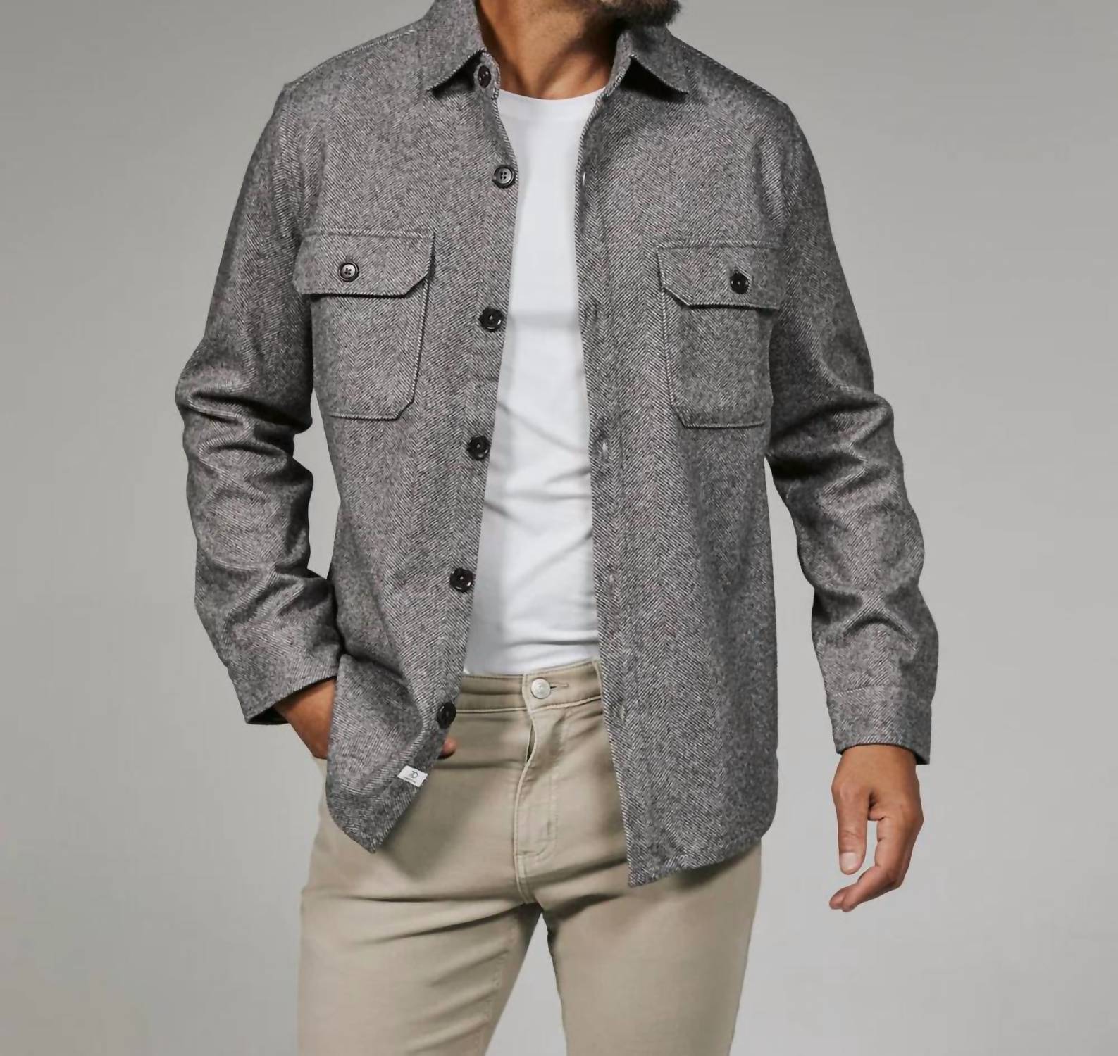 The Generation Herringbone Shacket by 7Diamonds is an essential addition to any wardrobe, offering the perfect mix of style and comfort. This grey, long sleeve shirt jacket features a classic collar and a button closure, crafted from 55% recycled polyester and 45% polyester for enhanced softness. Equipped with two front and two side pockets, it combines practicality with its solid pattern. Care is a breeze with machine wash cold on a delicate cycle, tumble dry on low, and avoid bleaching.