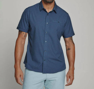 Introducing the Medina Short Sleeve Shirt by 7Diamonds, a stylish and comfortable addition to your wardrobe in a refined navy color. This men’s button-up shirt, with its geometric pattern and classic collar, is crafted from a blend of 94% polyester and 6% spandex, offering 4-way stretch, moisture-wicking, and wrinkle-resistant properties. Designed with functional pockets, it’s secured with a button closure for a polished look. For best care, machine wash cold on a delicate cycle with similar colors, avoiding bleach, oil, and alcohol products, and hang to dry.