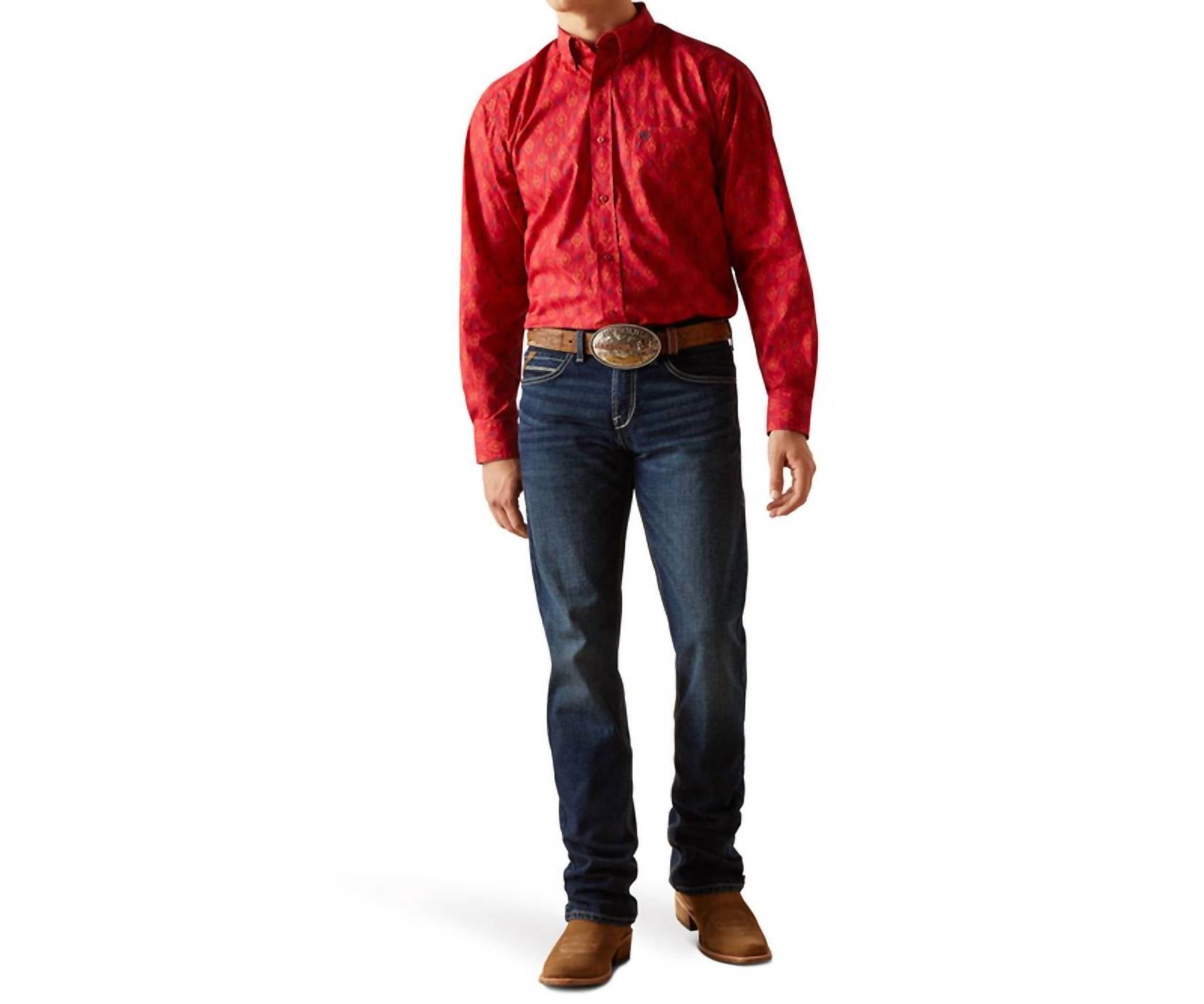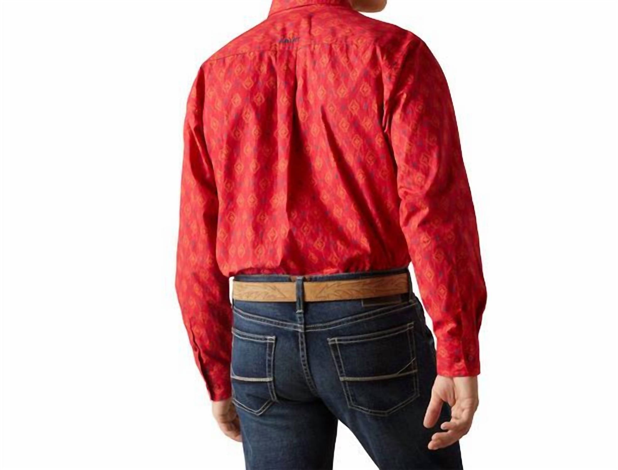This men's shirt features long sleeves and a classic collar, complemented by a geometric pattern that stands out. It includes pockets for added functionality. For care, machine wash and lay flat to dry.