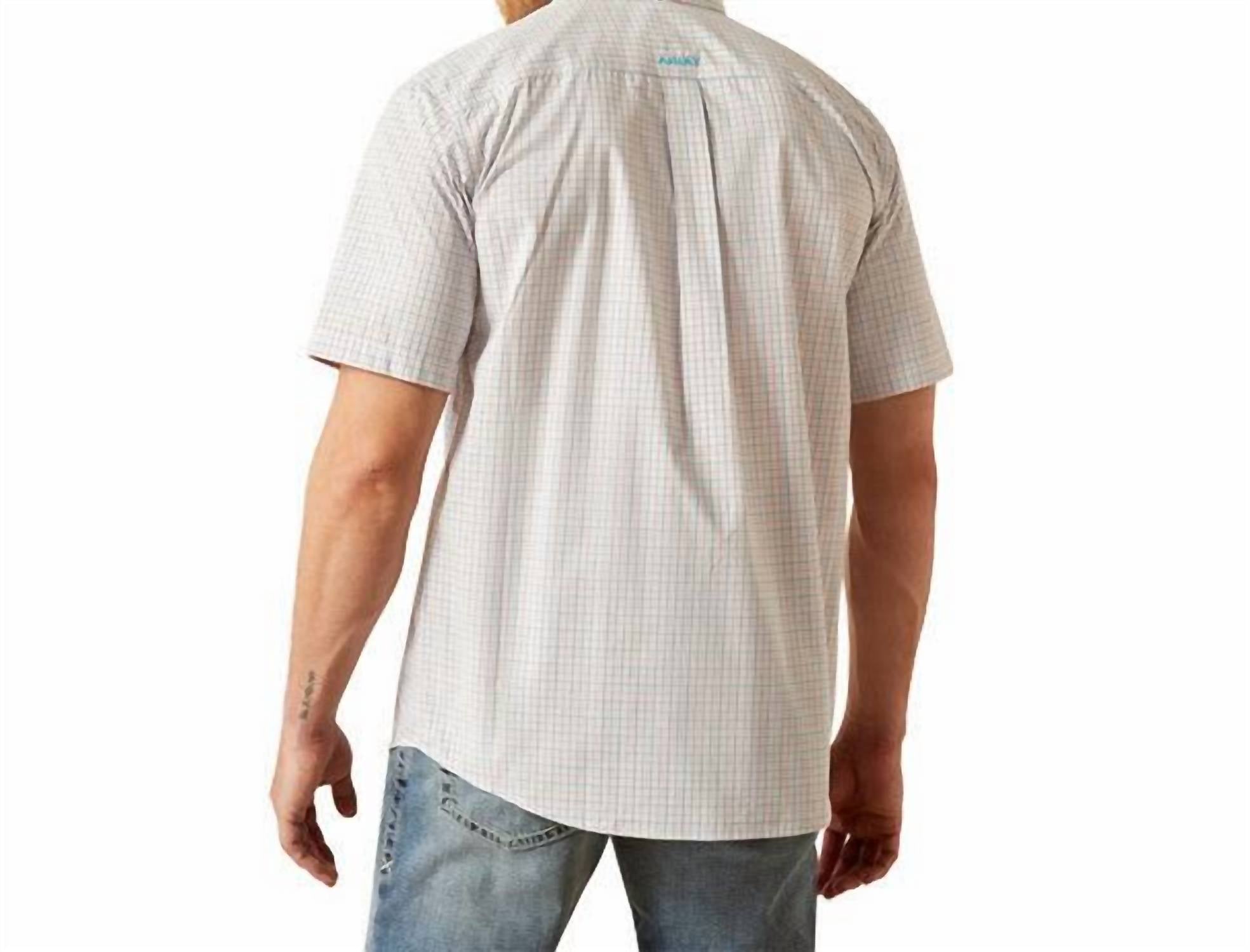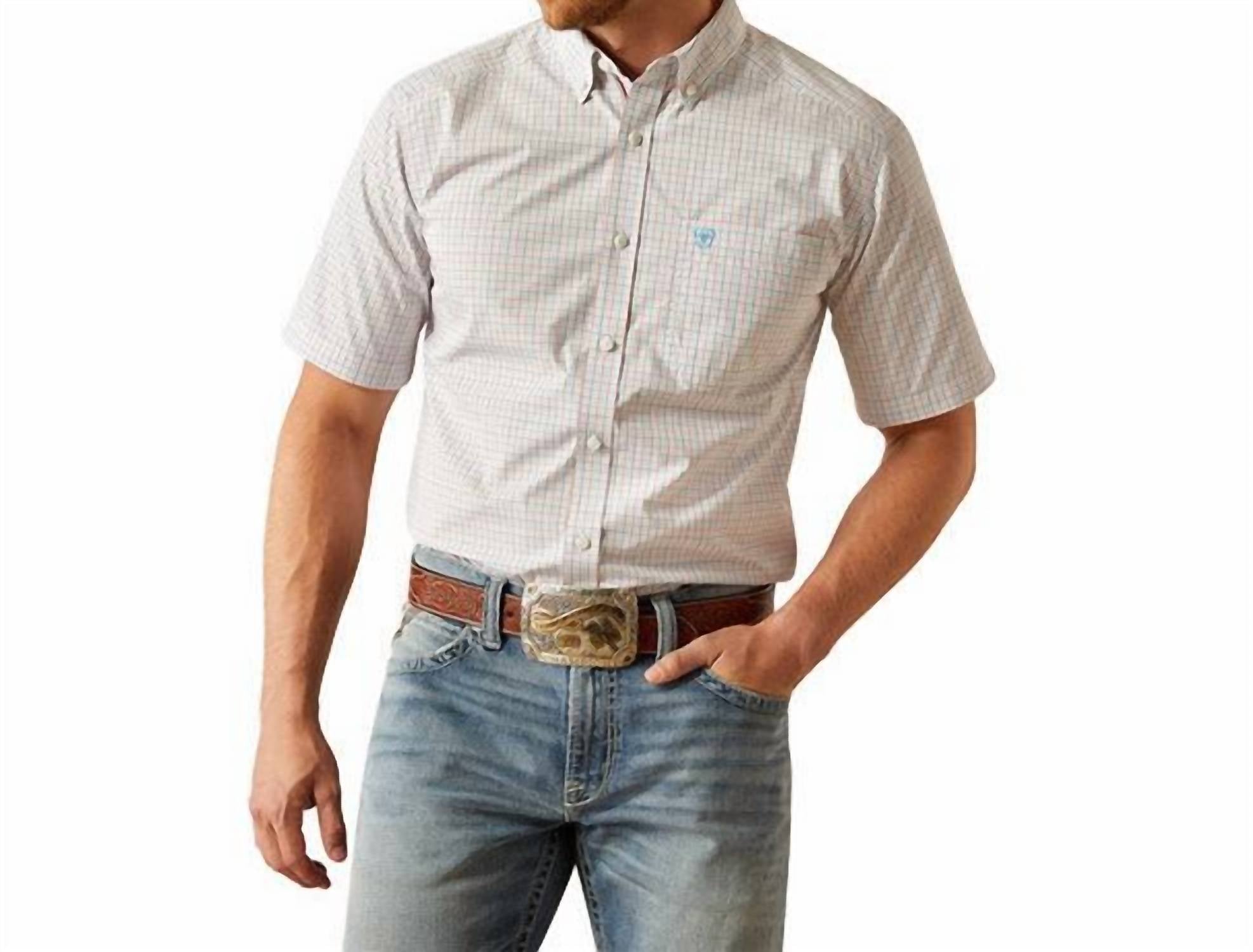 Embrace classic style with the ARIAT Pro Simon Classic Plaid Shirt in a crisp white plaid pattern. This casual button-down features short sleeves and a collar, utilizing a comfortable cotton blend (85% Cotton, 15% Recycled Polyester) for durability and breathability. Designed with Greater Arm Mobility™ and Moisture Movement Technology™, it ensures comfort and flexibility, while adjustable cuffs make it easy to roll up. A button closure, hidden pen slot in the left pocket, and signature Ariat branding complete this versatile piece.