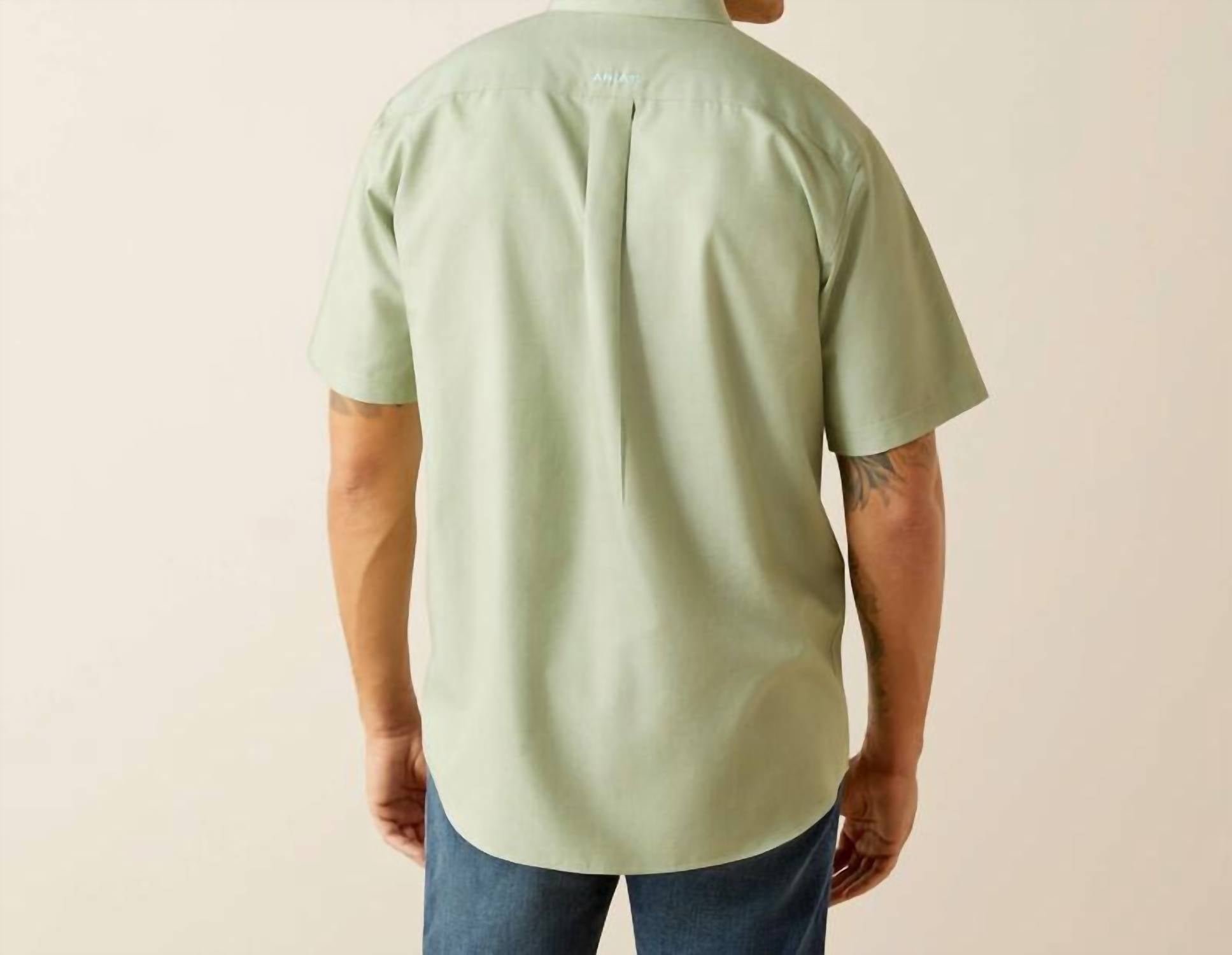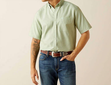 Discover the ARIAT Wrinkle Free Solid Classic Fit Shirt in Aqua, a must-have for the modern man seeking style and convenience. With short sleeves and a classic collar, this cotton shirt provides a generous fit with extra length in the body and sleeves. It features a button-front closure with adjustable cuffs and a hidden pen slot in the left pocket for added practicality. The wrinkle-free finish and taped seams ensure you look sharp with minimal effort, perfect for summer vacations and laid-back occasions.