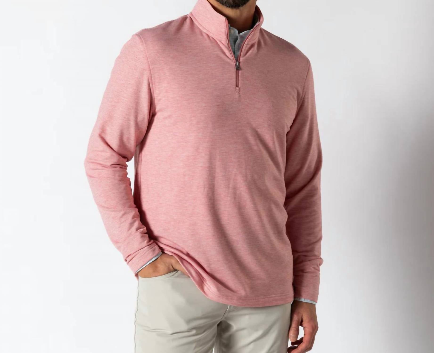 Introducing the DUCK HEAD Long Sleeve Wakeman Stripe Performance Shirt, an essential for your spring wardrobe, in Sunwashed Red Heather. This collar-neck shirt is crafted with long sleeves and a sophisticated stripe pattern. Composition includes 75% Recycled Polyester, 19% Lyocell, and 6% Spandex, ensuring lightweight comfort and resistance to odor and moisture. Country of origin not specified. Closure: Zip closure with a logoed YKK zipper. Care: Machine wash and tumble dry.