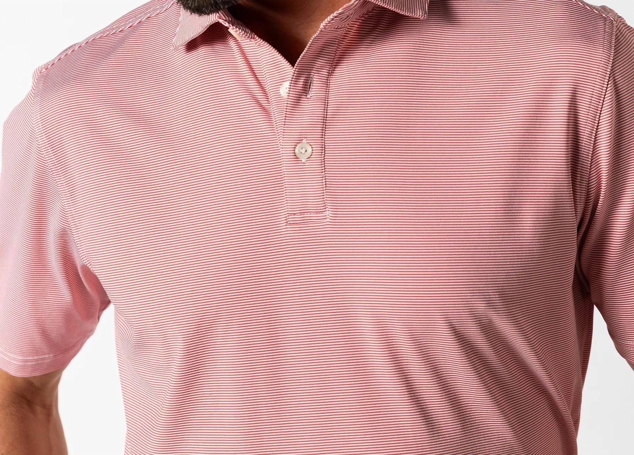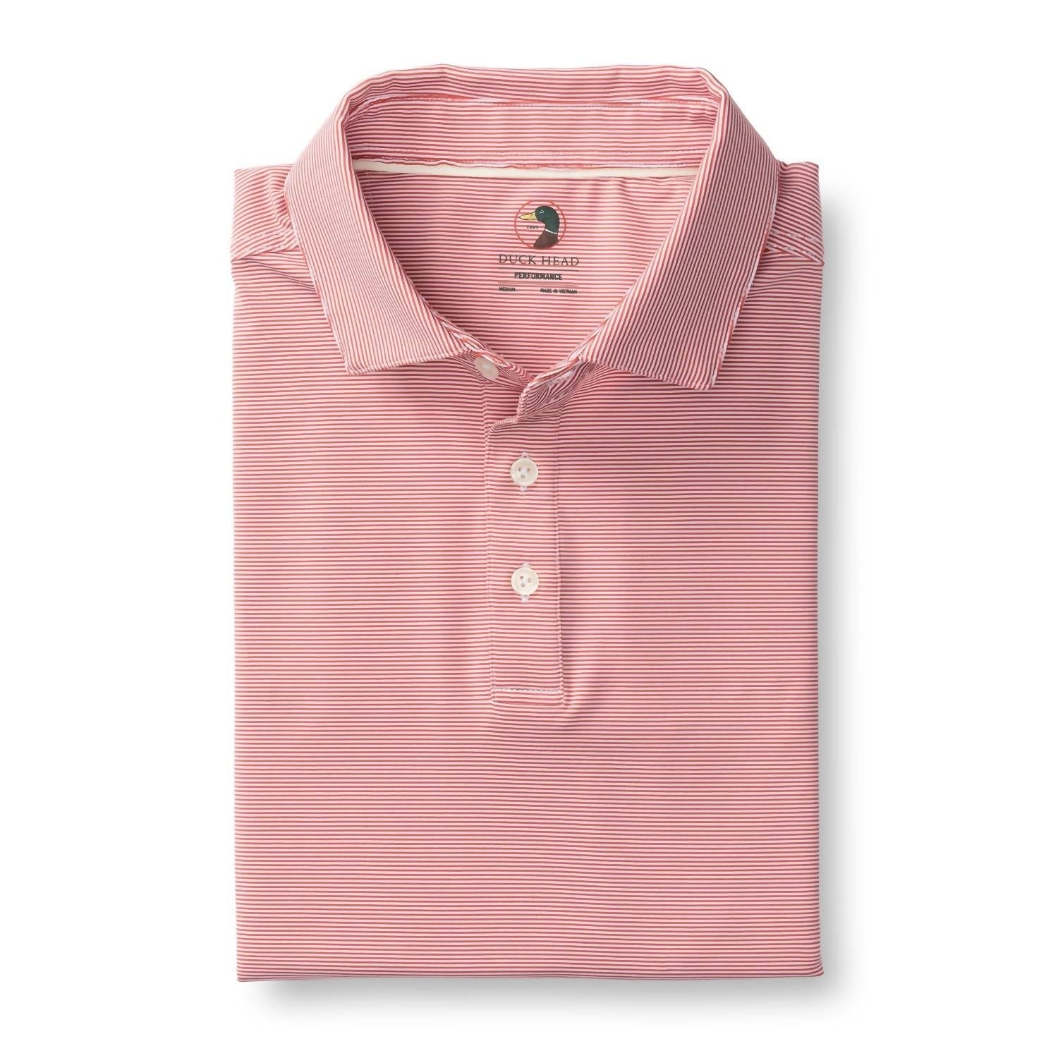 Elevate your active wardrobe with the Men's Long Drive Performance Polo by DUCK HEAD, featuring vibrant Blane Stripe Sunwashed Red. This short sleeve polo is crafted from a dynamic blend of 92% Polyester and 8% Spandex, offering a stripe jersey that ensures flexibility and moisture-wicking properties for ultimate comfort. It features a stylish self-collar and 3-button placket with 3-hole pearl buttons to elevate your look while on the move. Care for this imported piece is simple: machine wash cold, gentle cycle, tumble dry low, and enjoy its easy-care, wrinkle-free fabric.