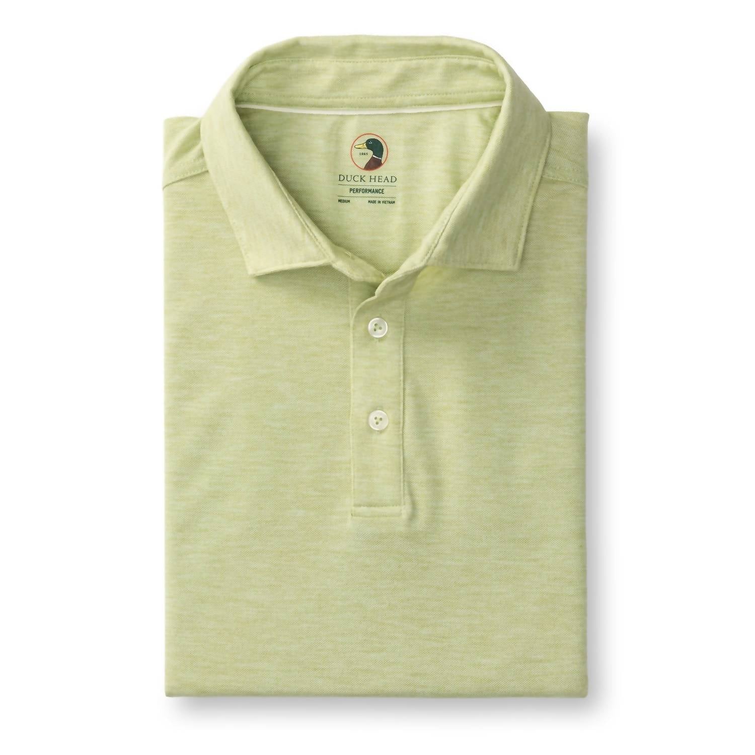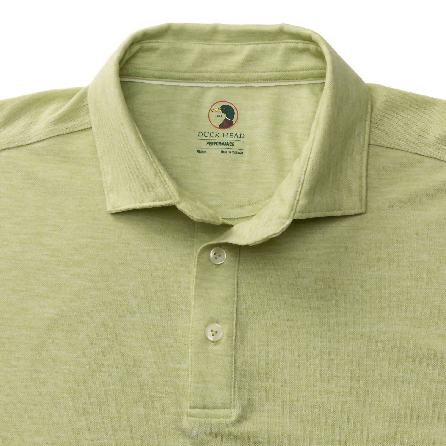 Elevate your wardrobe with the Summerford Performance Polo by DUCK HEAD in Pear Heather Green. This short-sleeve polo is crafted from an 83% Polyester, 11% Lyocell, and 6% Spandex blend featuring a moisture-wicking and breathable fabric for complete all-day comfort. The structured collar, three-hole pearl button closure, and subtle stretch provide the perfect balance of polish and ease, ideal for any summer travel occasion. Imported with easy-care instructions, the polo is machine washable on a gentle cycle and can be tumbled dry on low.